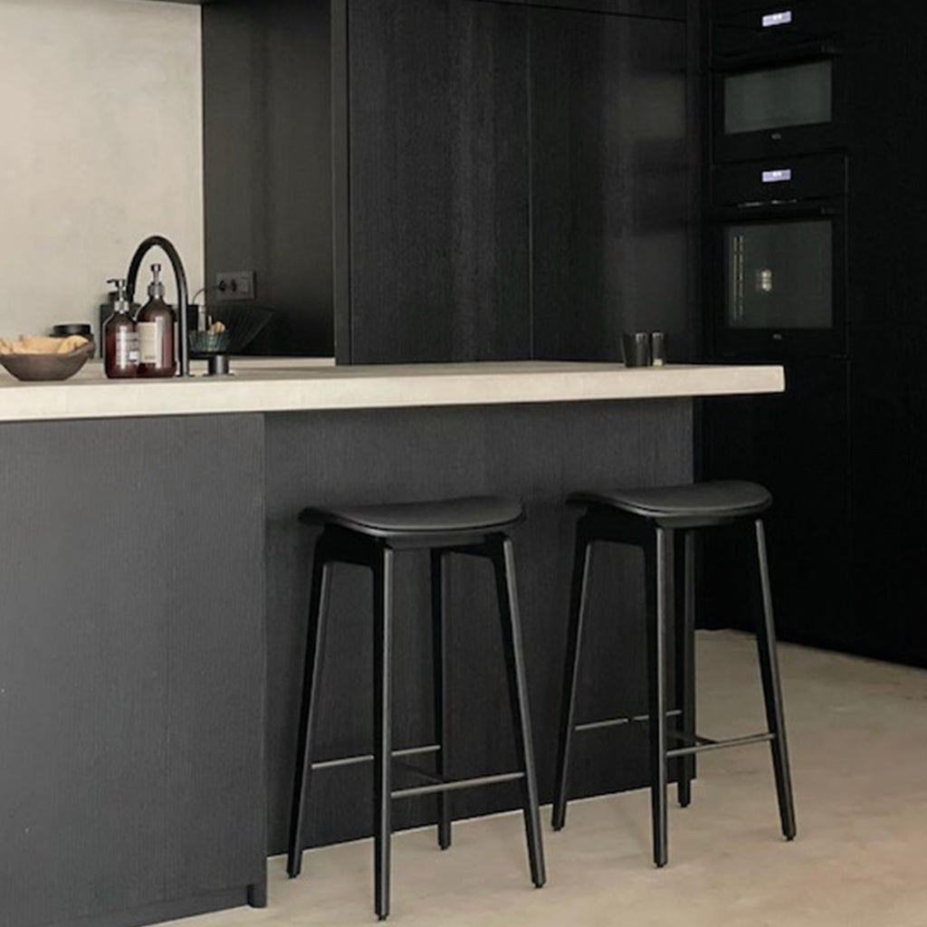 Inspired by classic Danish elementary school chairs, the NY11 Bar + Counter Stools frame is made from solid oak, and the seat is crafted from laminated oak veneer. Available in four finishesnatural, light smoked, dark smoked, and black oakthe stool has a timeless design. This seat upholstered variation is available in a curated range of high-performance fabric and leather. The integrated steel footrest ensures added support and utility, making it suitable for home kitchens or public spaces.