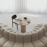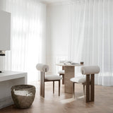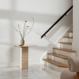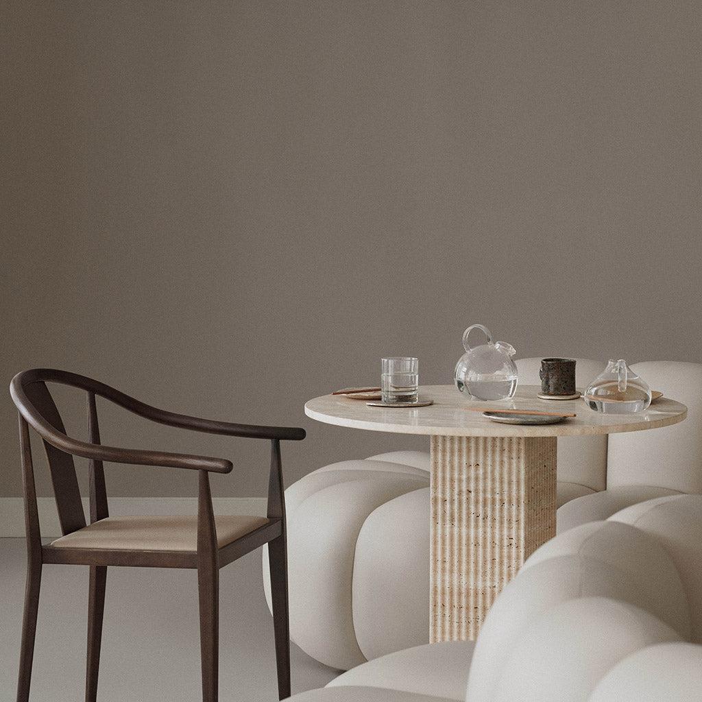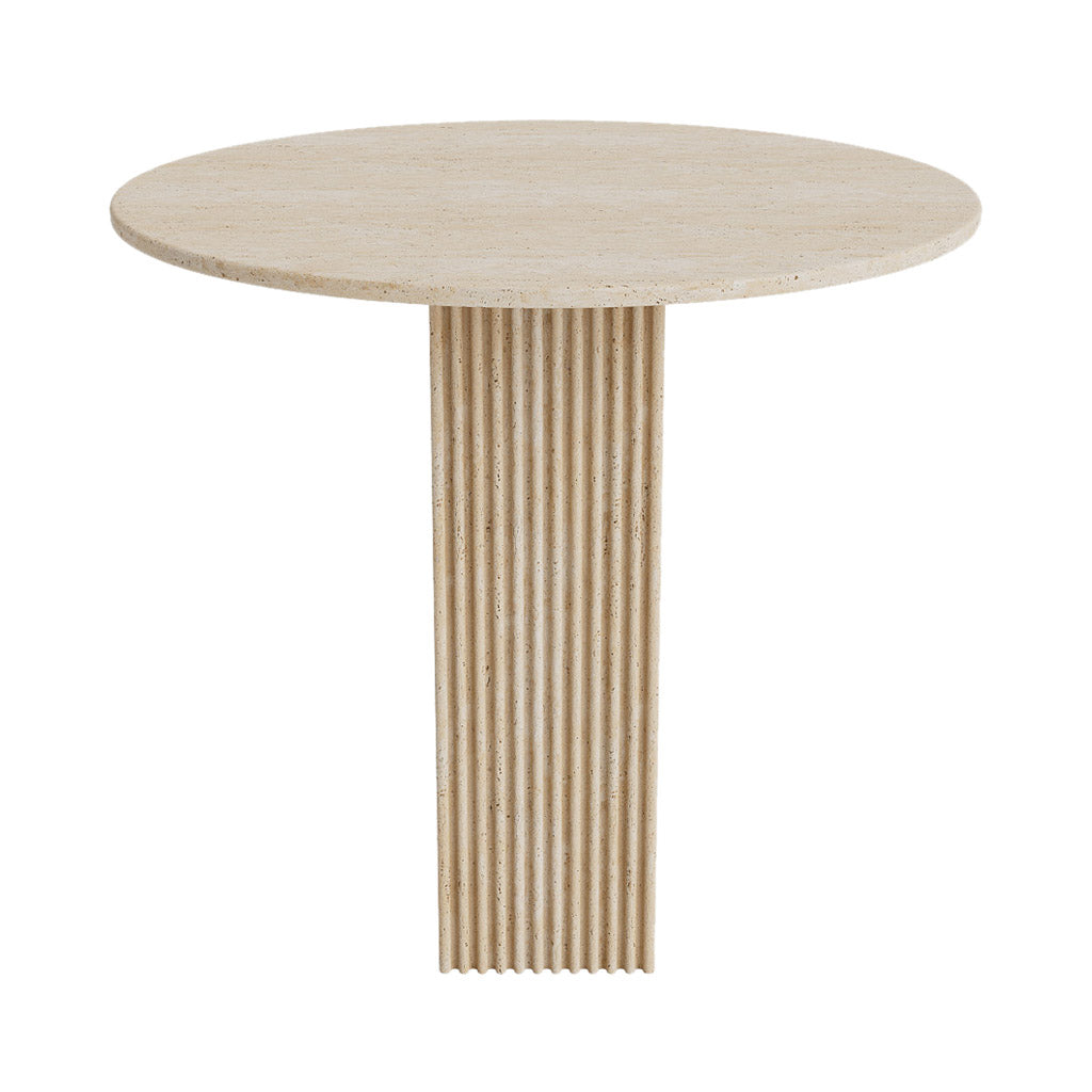 The Soho Dining Table is inspired by the fluted architectural facades of New York’s SoHo neighborhood. It is made from natural travertine stone, giving it a unique surface texture with visible small holes and imperfections that add character. Its vertical, slim profile plays with light and shadow throughout the day, enhancing its architectural presence. The Soho Dining Table is compact, making it ideal for intimate dining setups.