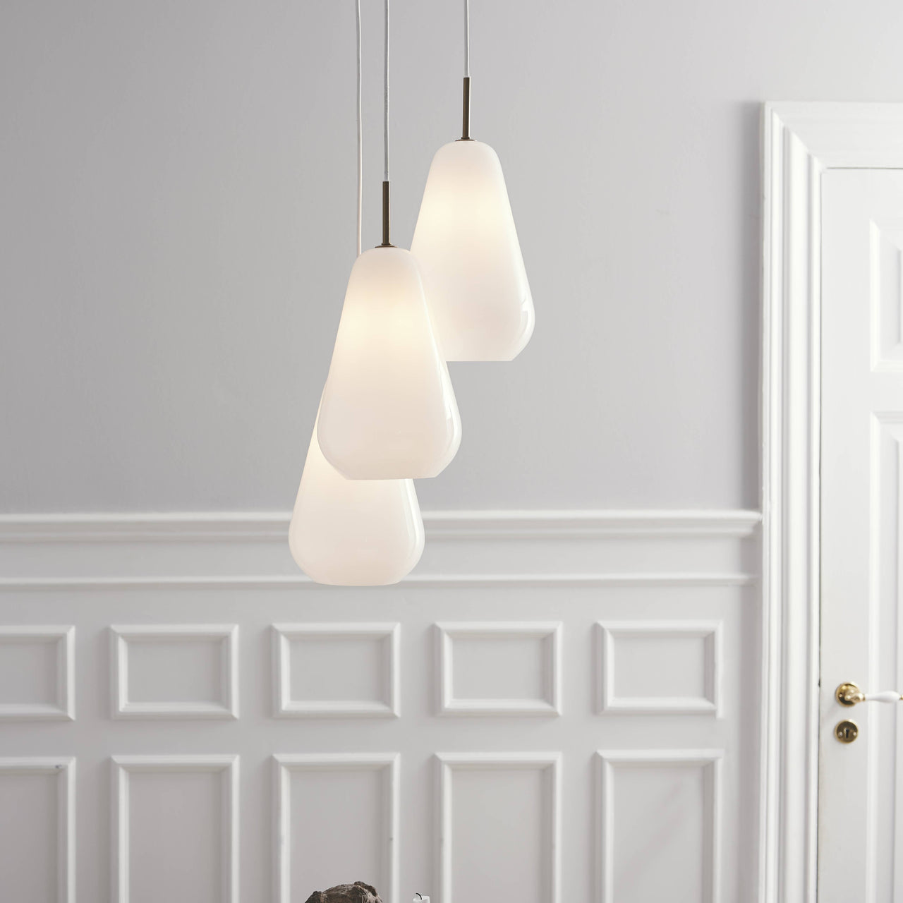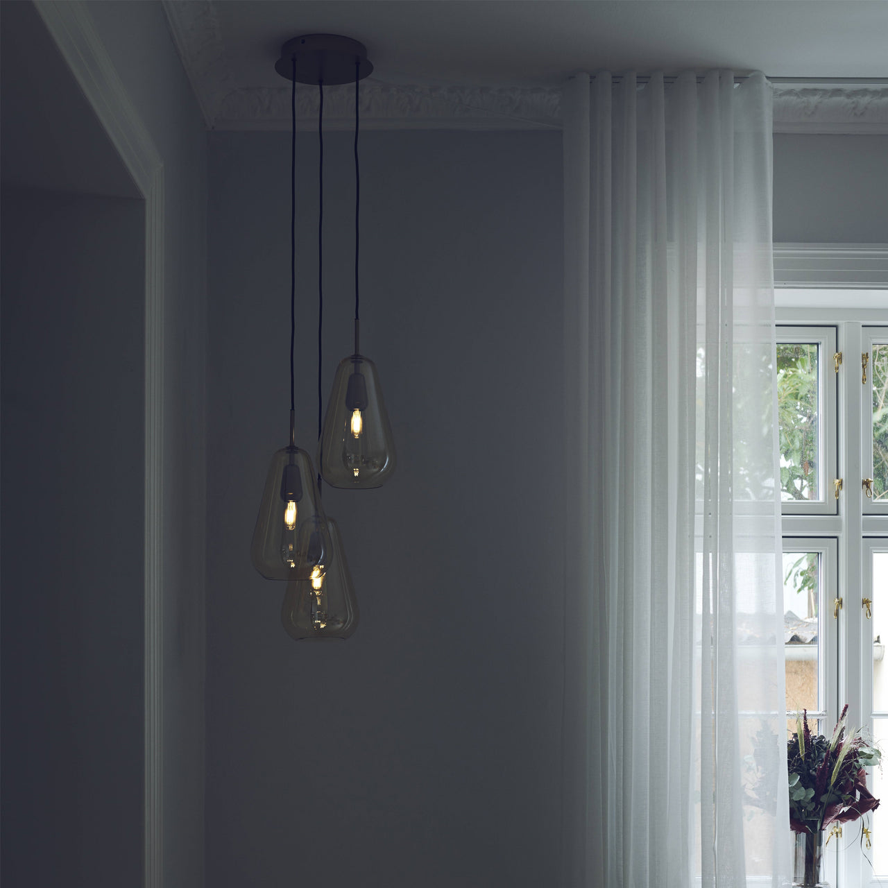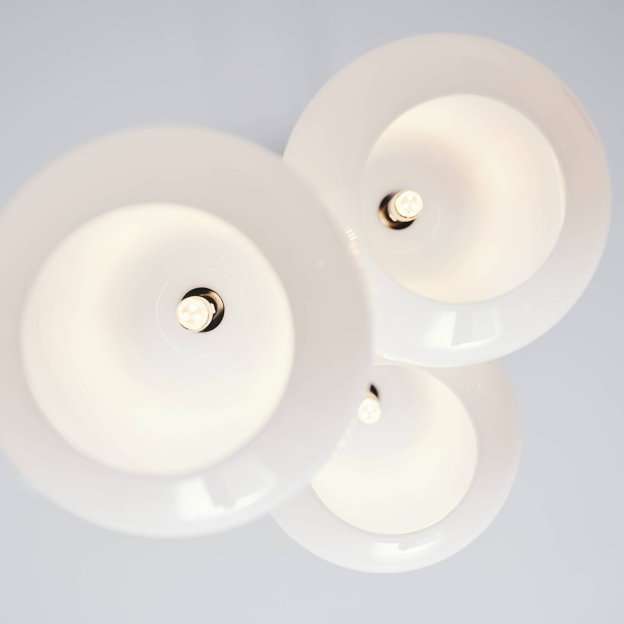 Designer Sofie Refer says her primary inspirations are the Nordic light and the generosity of nature–and the wondrous chandelier version in her Anoli series for Danish house Nuura seemingly reflects both of those imperatives. The trio of droplet-shaped shades in mouth-blown glass and hand-painted in a delicate golden color charmingly allude to her original vision of rain drops reflecting nature's luminescence. Enhanced with fittings of light gold metal, the trio of shades can be positioned in close proximity or spread out in sequence, either way producing an incomparable lighting effect in any setting.