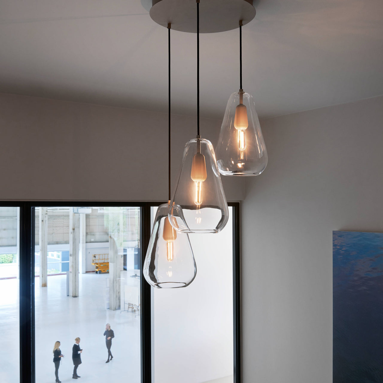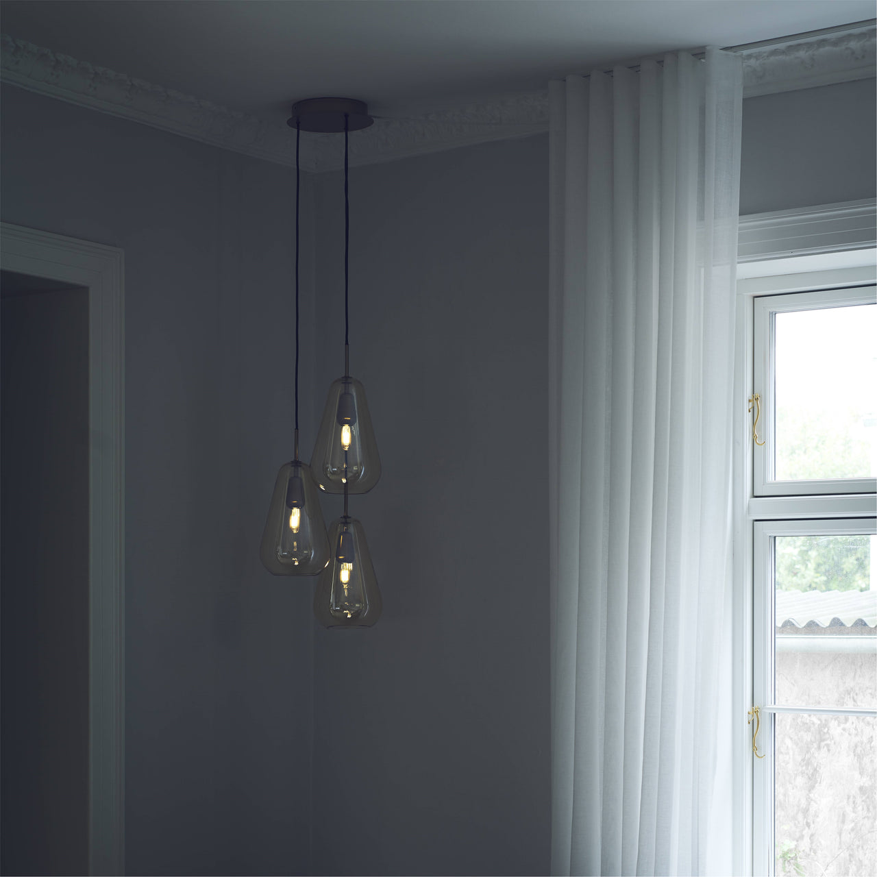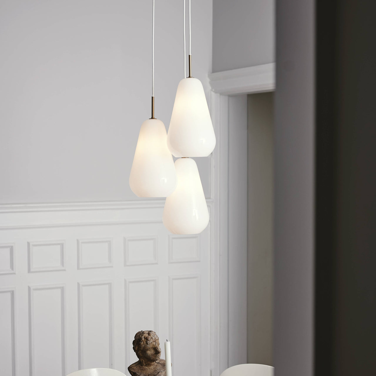 Designer Sofie Refer says her primary inspirations are the Nordic light and the generosity of nature–and the wondrous chandelier version in her Anoli series for Danish house Nuura seemingly reflects both of those imperatives. The trio of droplet-shaped shades in mouth-blown glass and hand-painted in a delicate golden color charmingly allude to her original vision of rain drops reflecting nature's luminescence. Enhanced with fittings of light gold metal, the trio of shades can be positioned in close proximity or spread out in sequence, either way producing an incomparable lighting effect in any setting.