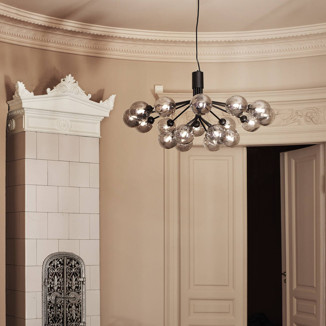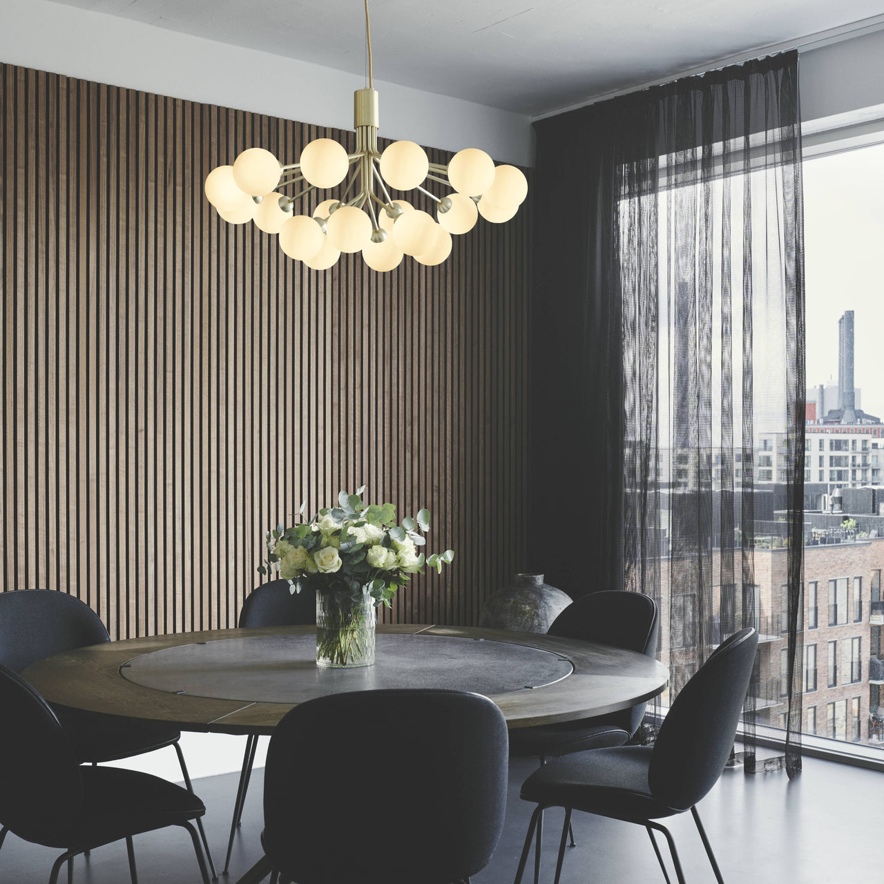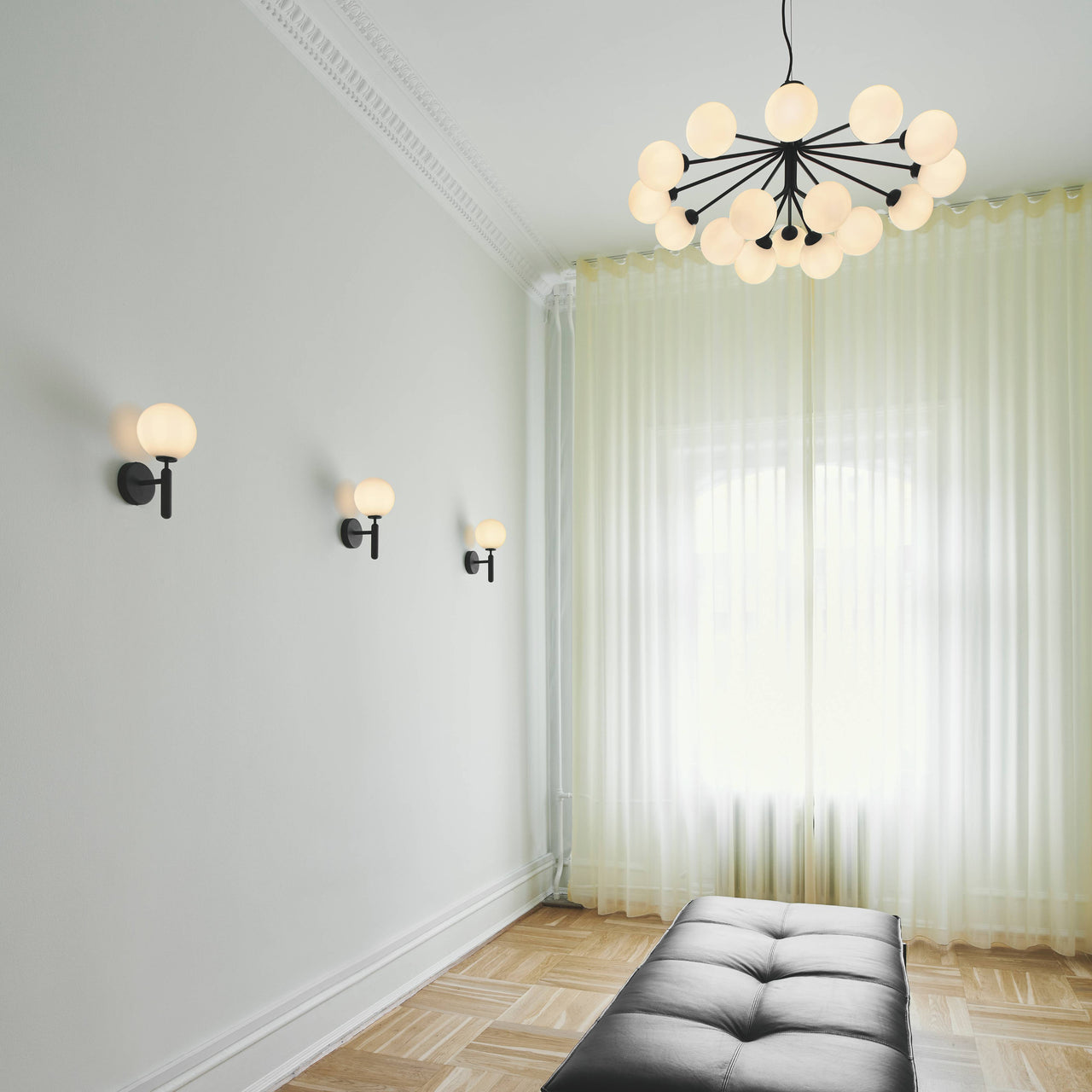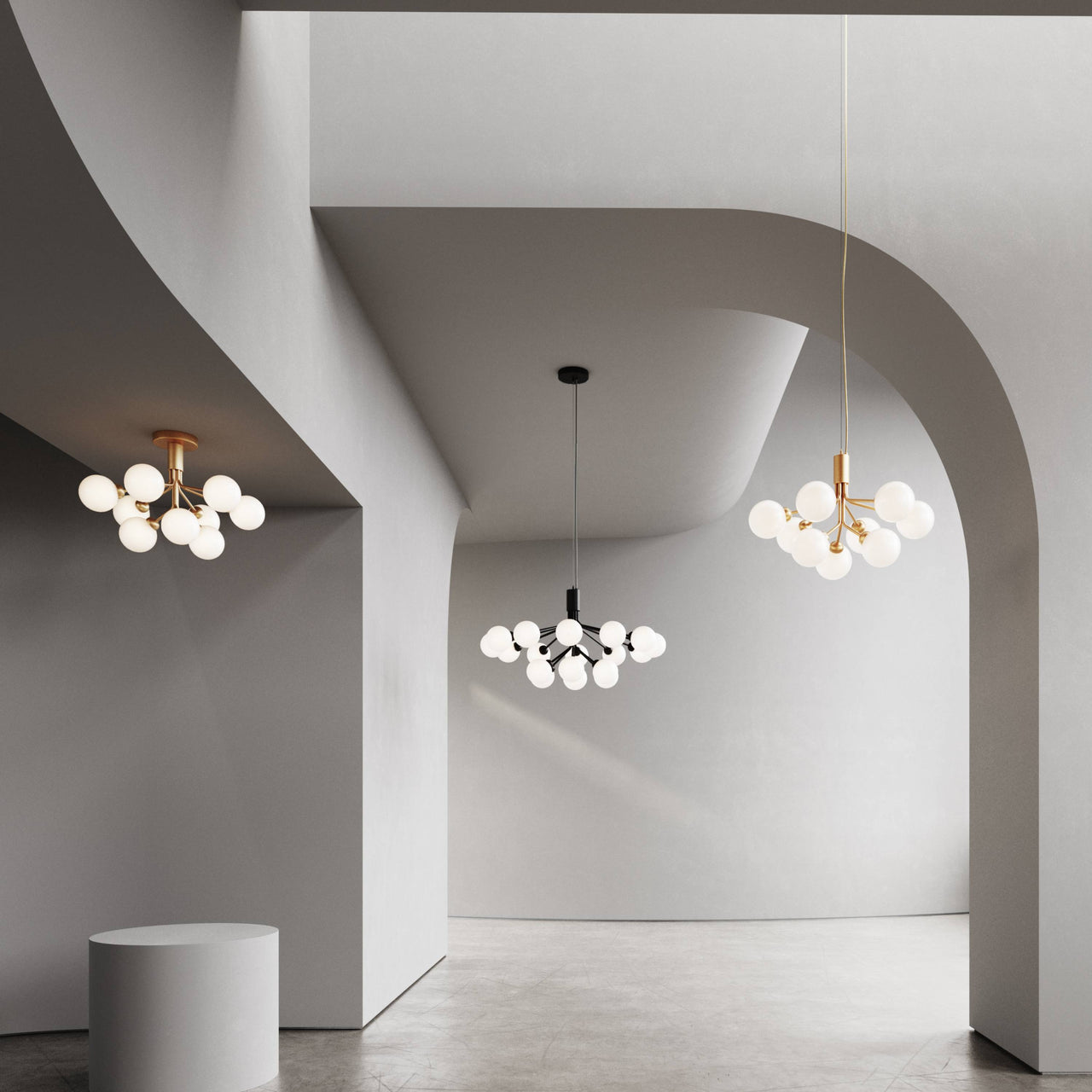 With a suitably grand gesture, fit to grace a large dining table or expanded entryway, Sofie Refer has created a dramatic bouquet of light. Apiales 18, the larger model in Nuura's collection, features that number of elegantly mouth-blown glass globes. Gathered and held together, they resemble flowers on individual "stalks," finished in a choice of golden Brush Brass or the smooth Satin Black, that create an eye-catching bloom of illumination.