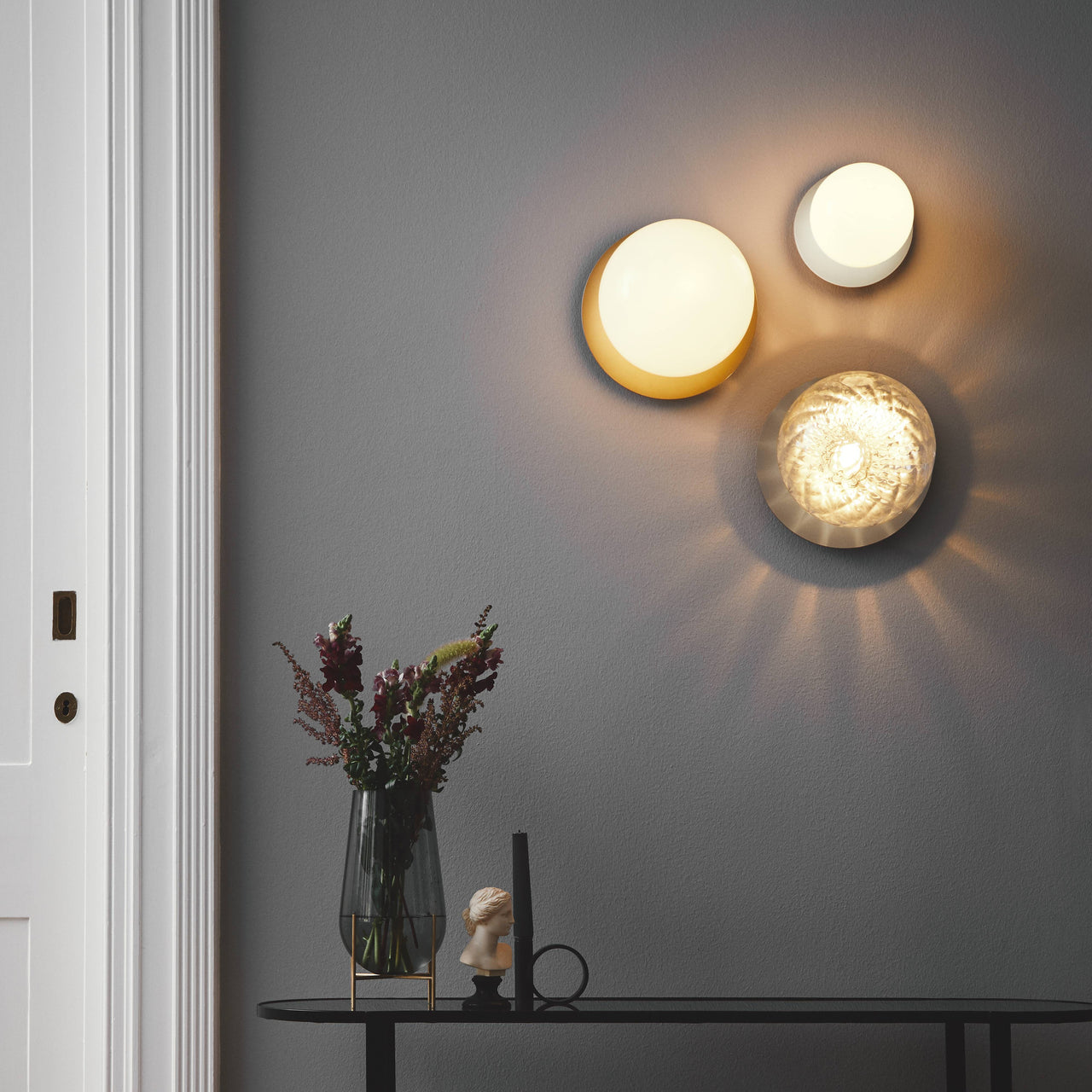 To mount on a wall or ceiling, this simple round light has an air of luxe indulgence with its mouth-blown glass globe and disc base in a pale metallic called Nordic gold. Choose Liila 1 in either optic clear glass with a pattern that creates sparkling reflections or in milky opal glass to render a soft glow. Nuura designer Sofie Refer once again reduces lighting to the elegant essentials with a fixture that works perfectly as a single, perhaps in an entrance hall or bath, or grouped in multiples to light larger spaces.