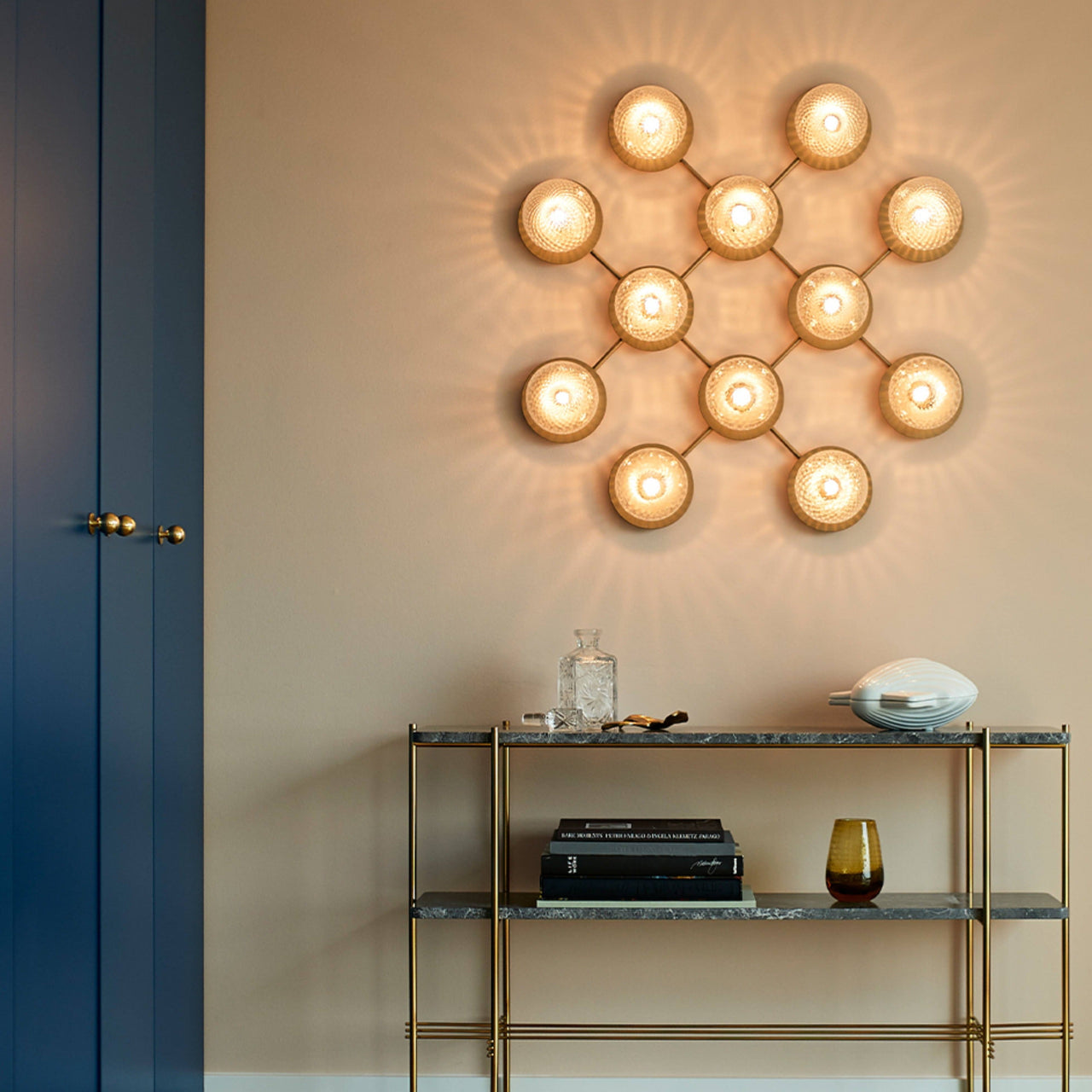 Nuura designer Sofie Refer has a knack for drop-dead lighting effects and, with this dazzling geometric stunner, she once again scores a knockout. Composed from a dozen individual lights on a grid of sublimely pale gold metal, Liila's mouth-blown globes are offered in either patterned clear optic glass or milky opal glass. With the former, the effect is all sparkly reflections while the latter yields a subtle glow of illumination.