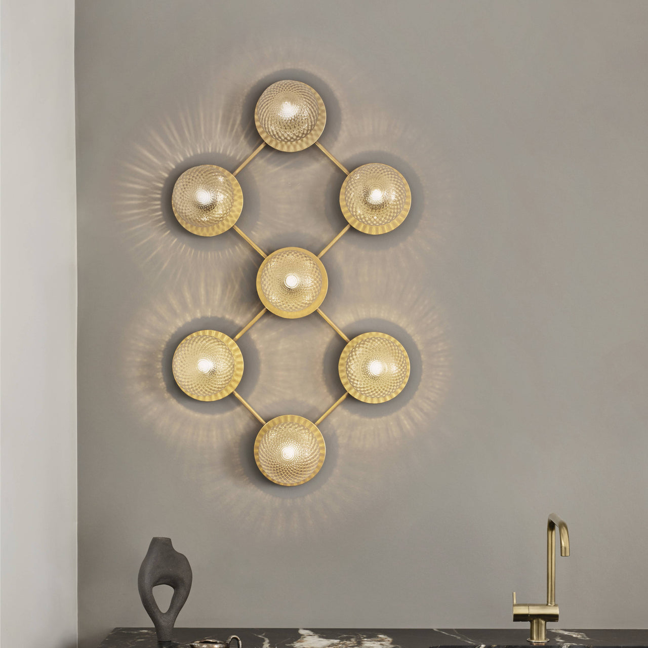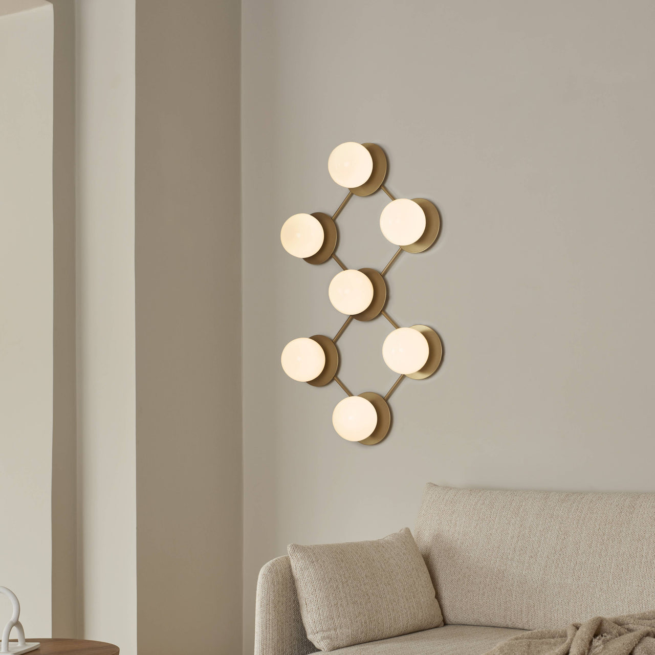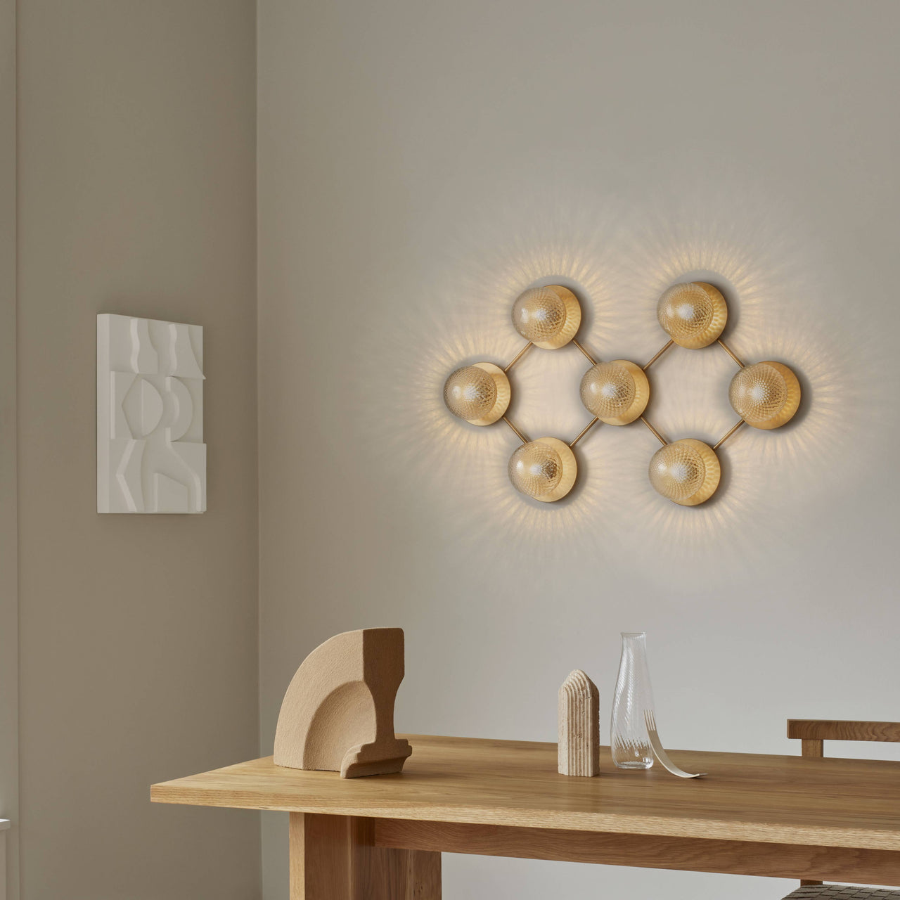 Liila 7 extends Nuura's simplistic but sensuous take on Nordic style to an elongated cluster that can be oriented vertically or horizontally. Mouth-blown glass in a choice of sparkling optic clear or matte opal white is elegantly framed by a soft-toned gold metallic. Danish designer Sofie Refer's fixture looks great in multiples as a light sculpture or in a line to stunning effect—or solo in a dining room or lounge area, above a headboard or on the ceiling in a narrow hall.
