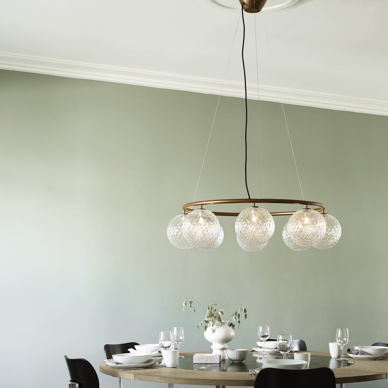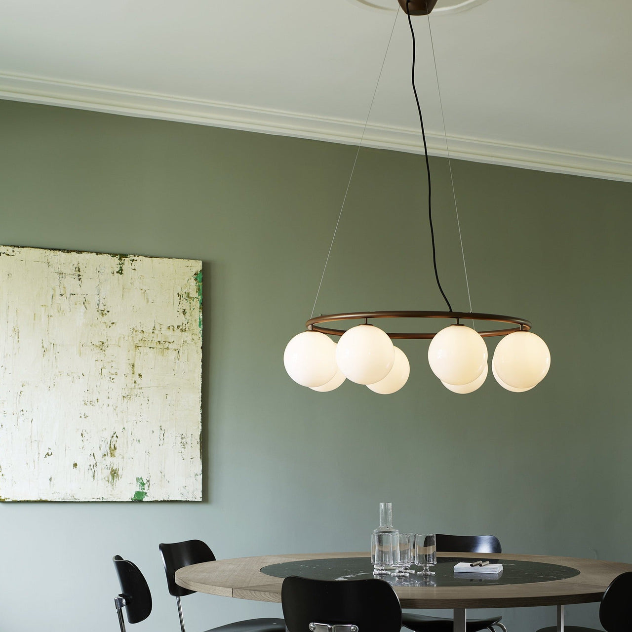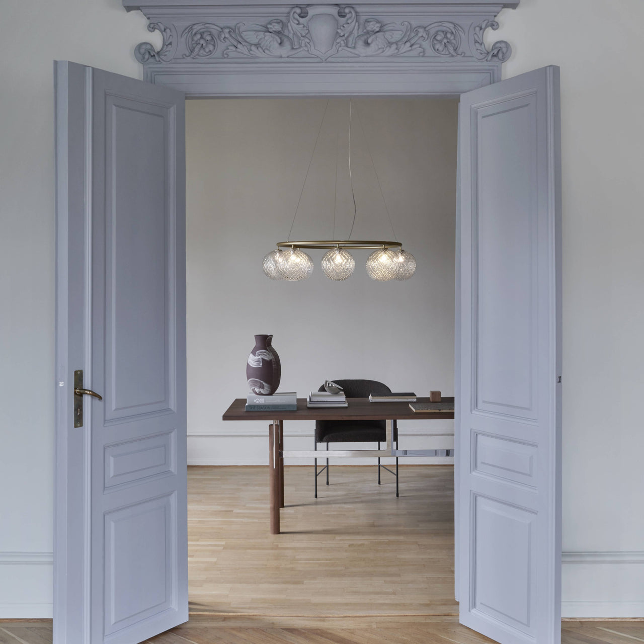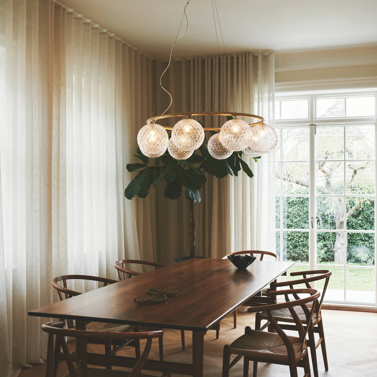 This chandelier version of Miira is a spellbinder, with 8 of the series' mouth-blown glass orbs mounted on a bronze-finish metal ring. Designed to hang high or low from the ceiling, a special wire system is used to adjust the height with ease (from 45 to 250 centimeters). Nuura's creative director Sofie Refer offers a choice of milky opal glass or optic clear glass with an embossed pattern—either way, Miira spreads an atmospheric illumination that gives a room an unmatched allure.