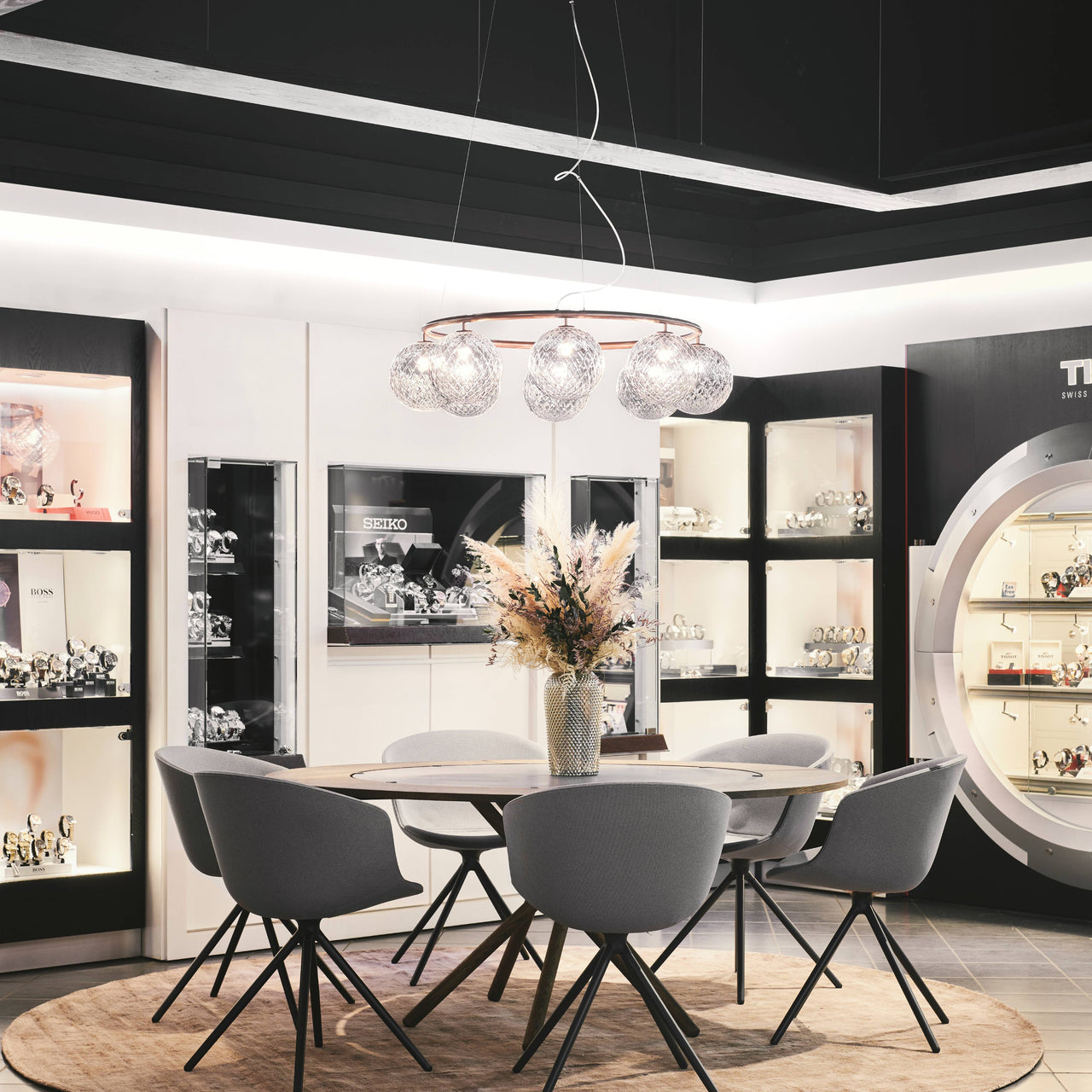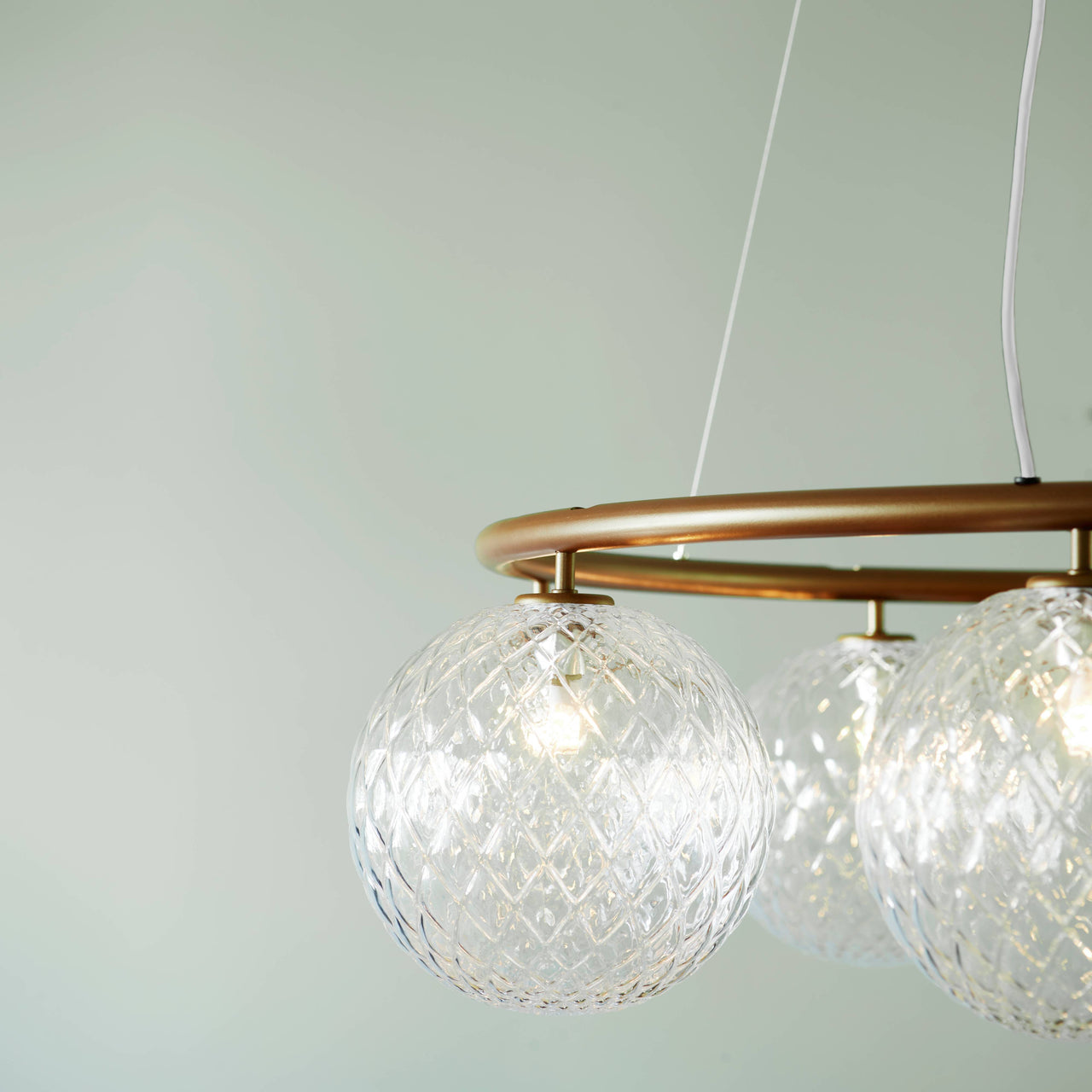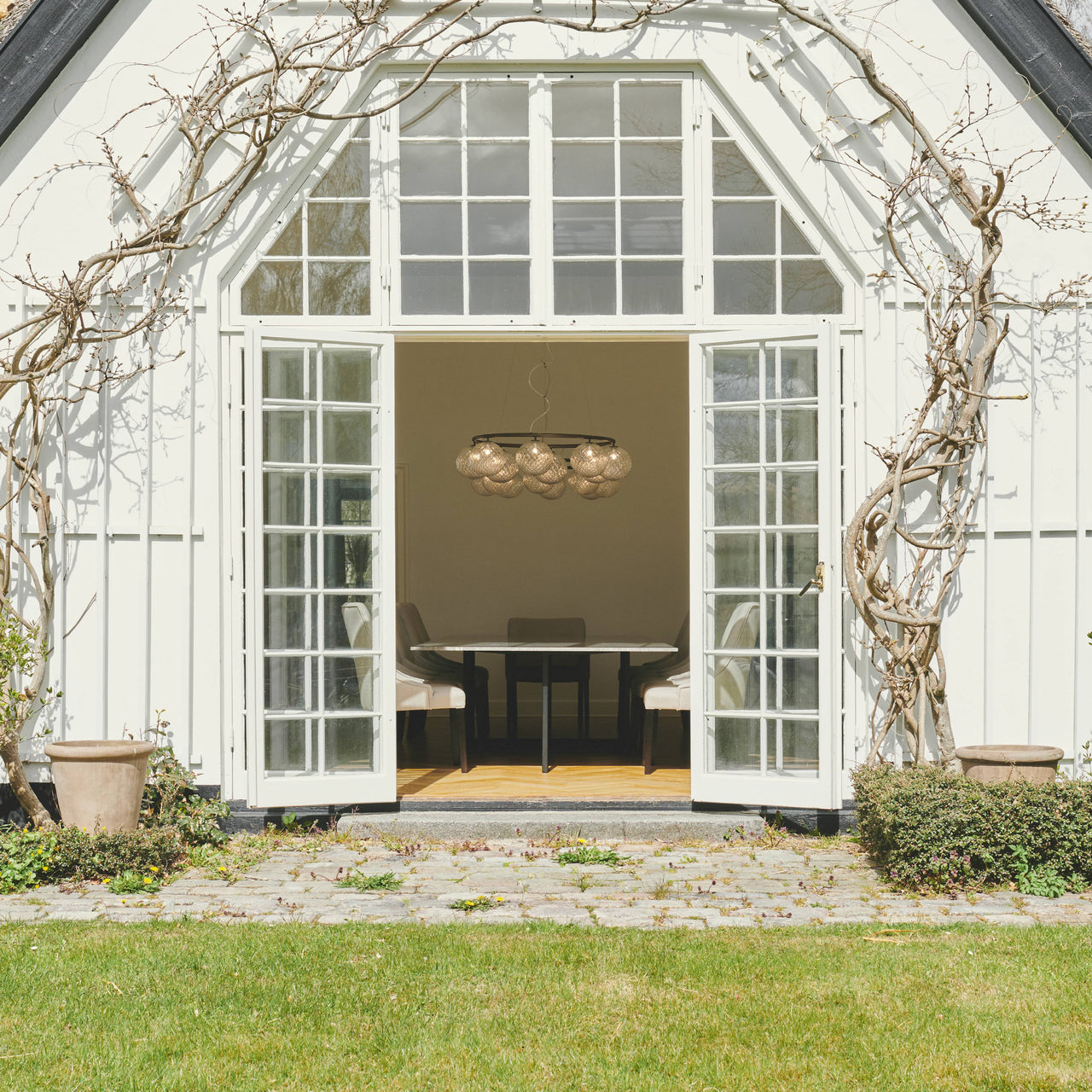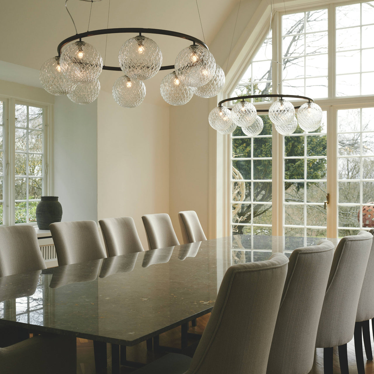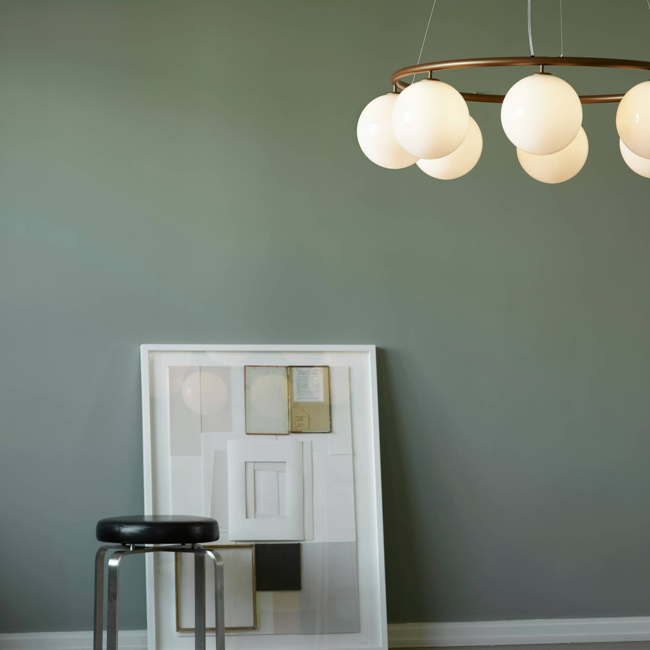 This chandelier version of Miira is a spellbinder, with 8 of the series' mouth-blown glass orbs mounted on a bronze-finish metal ring. Designed to hang high or low from the ceiling, a special wire system is used to adjust the height with ease (from 45 to 250 centimeters). Nuura's creative director Sofie Refer offers a choice of milky opal glass or optic clear glass with an embossed pattern—either way, Miira spreads an atmospheric illumination that gives a room an unmatched allure.