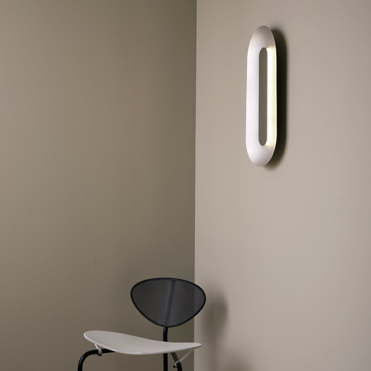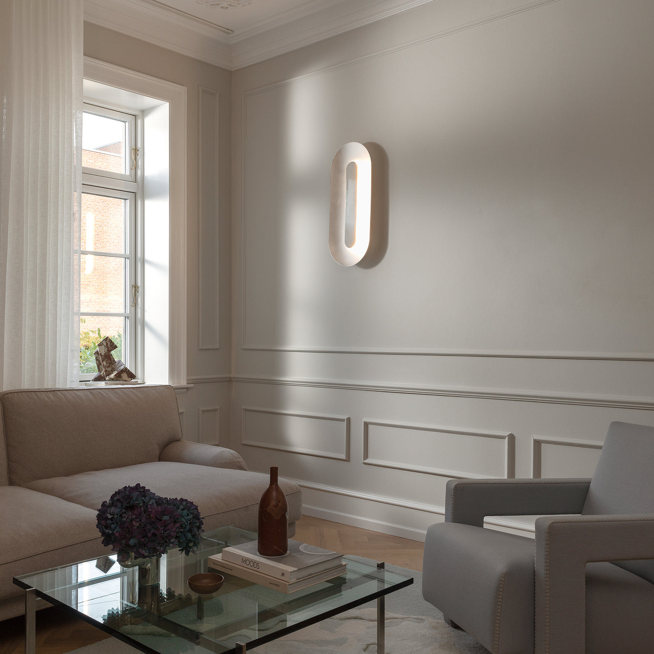 The Sasi Wall/Ceiling Lamp features an oval metal frame with a satin finish, complemented by a central polished metal shade. The integrated LED module emits indirect light, which is gently reflected by the surrounding frame. Available in 2 sizes and finishes of brass or silver.