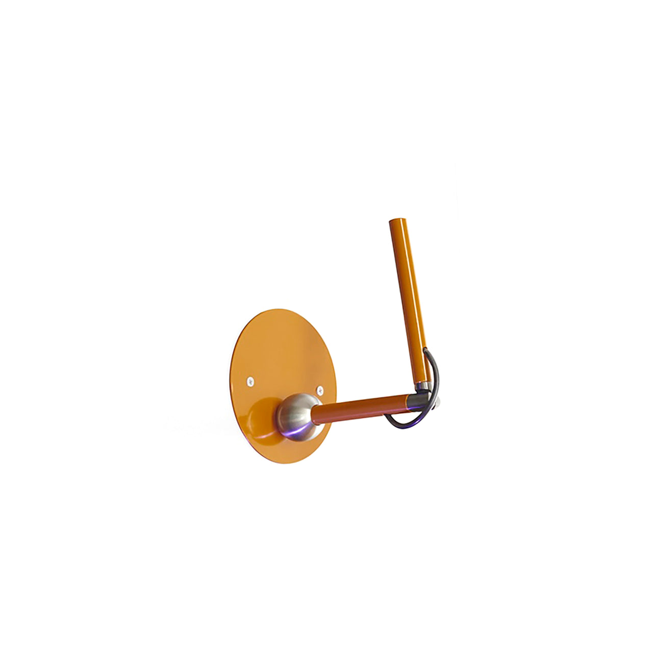 A pivoting head and articulated arm allow this wall-mounted lamp to direct focused light with precision. Two slender cylindrical stems are connected by a pivot, enabling flexible orientation of the light source. Finished in glossy lacquered tones scarlet red, mustard yellow, and satin black nickel.