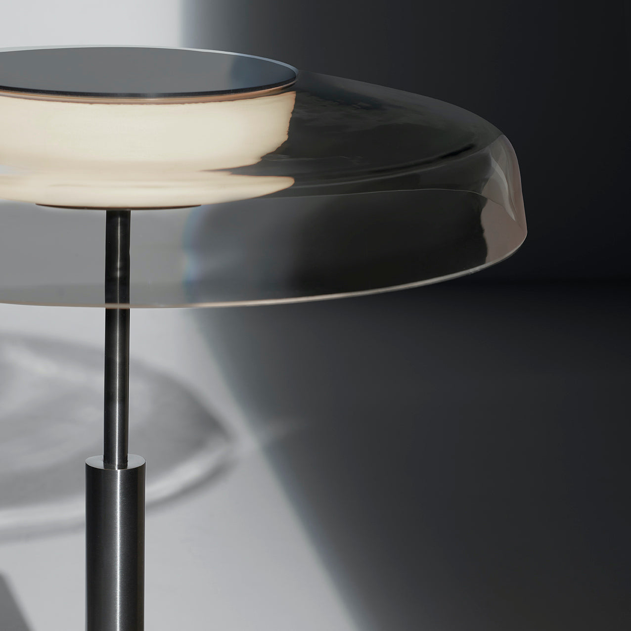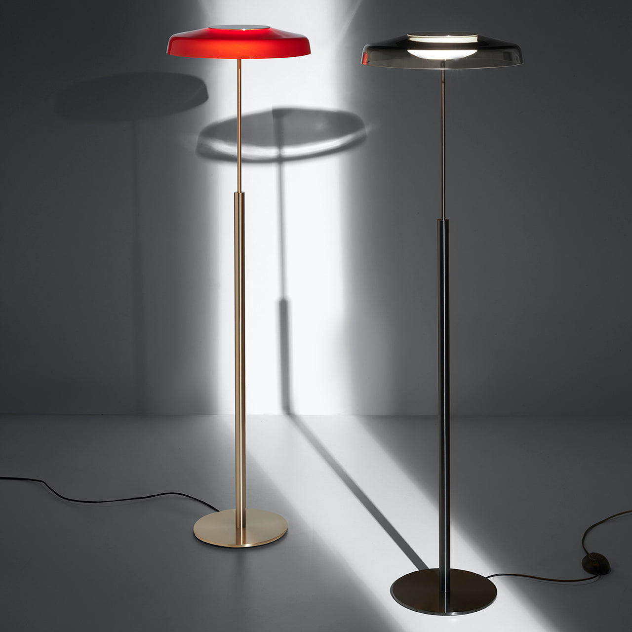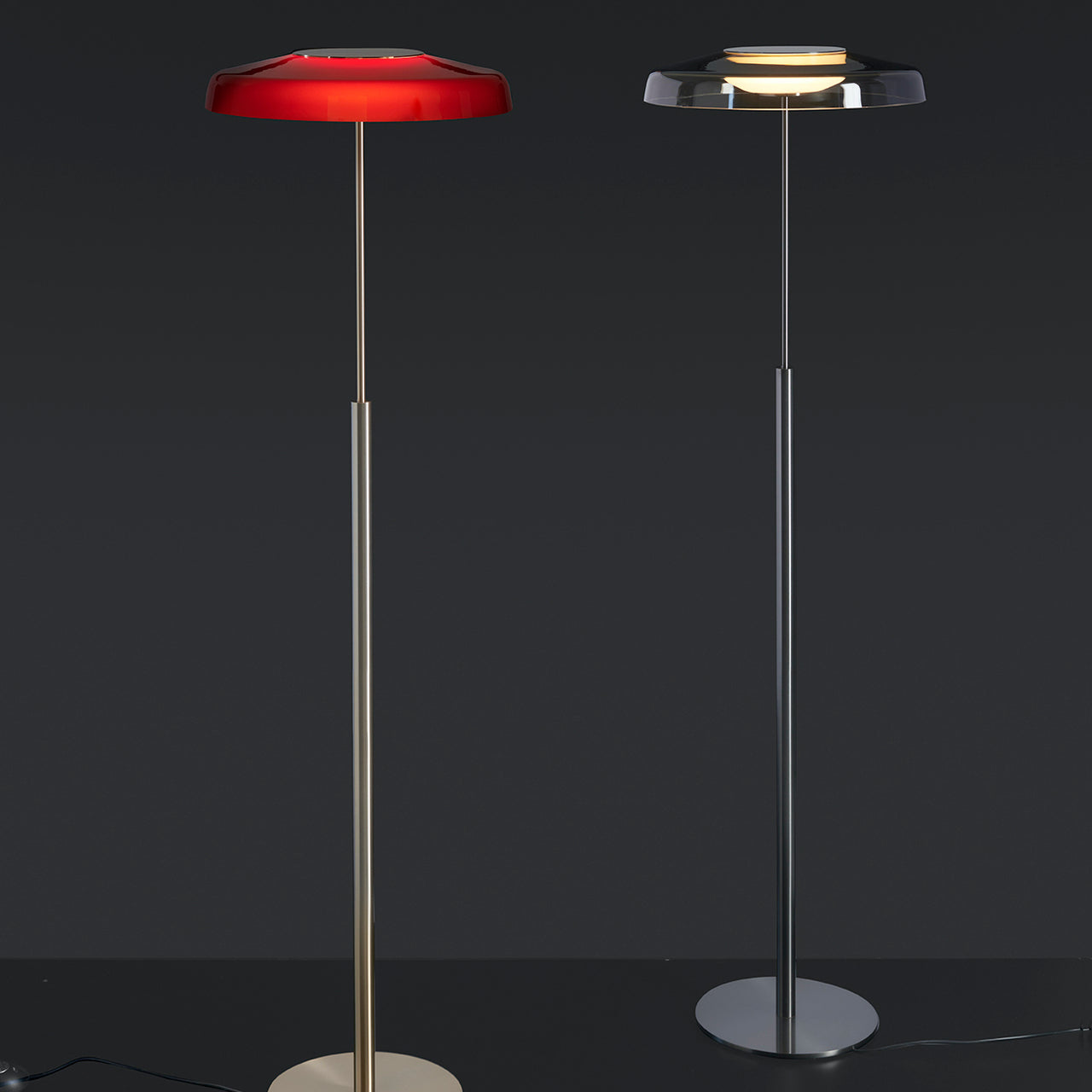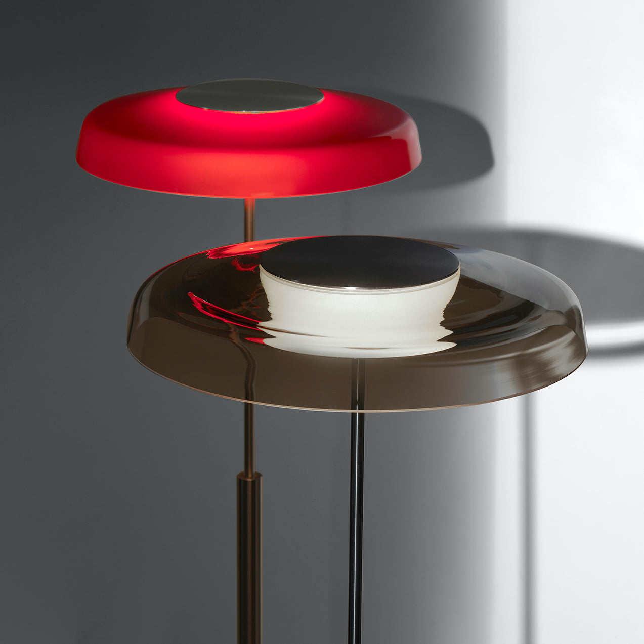 Studio Angelettruzza’s elegant floor lamp for Italian lighting maestros Oluce balances the warmth of a light-diffusing tinted glass lampshade with a minimalist metal stem and footing. Dora offers both direct and diffused LED illumination and a choice of interpretations for the lustrous satin-finished structure and blown-glass domed diffuser anchored by an upper metal disc.