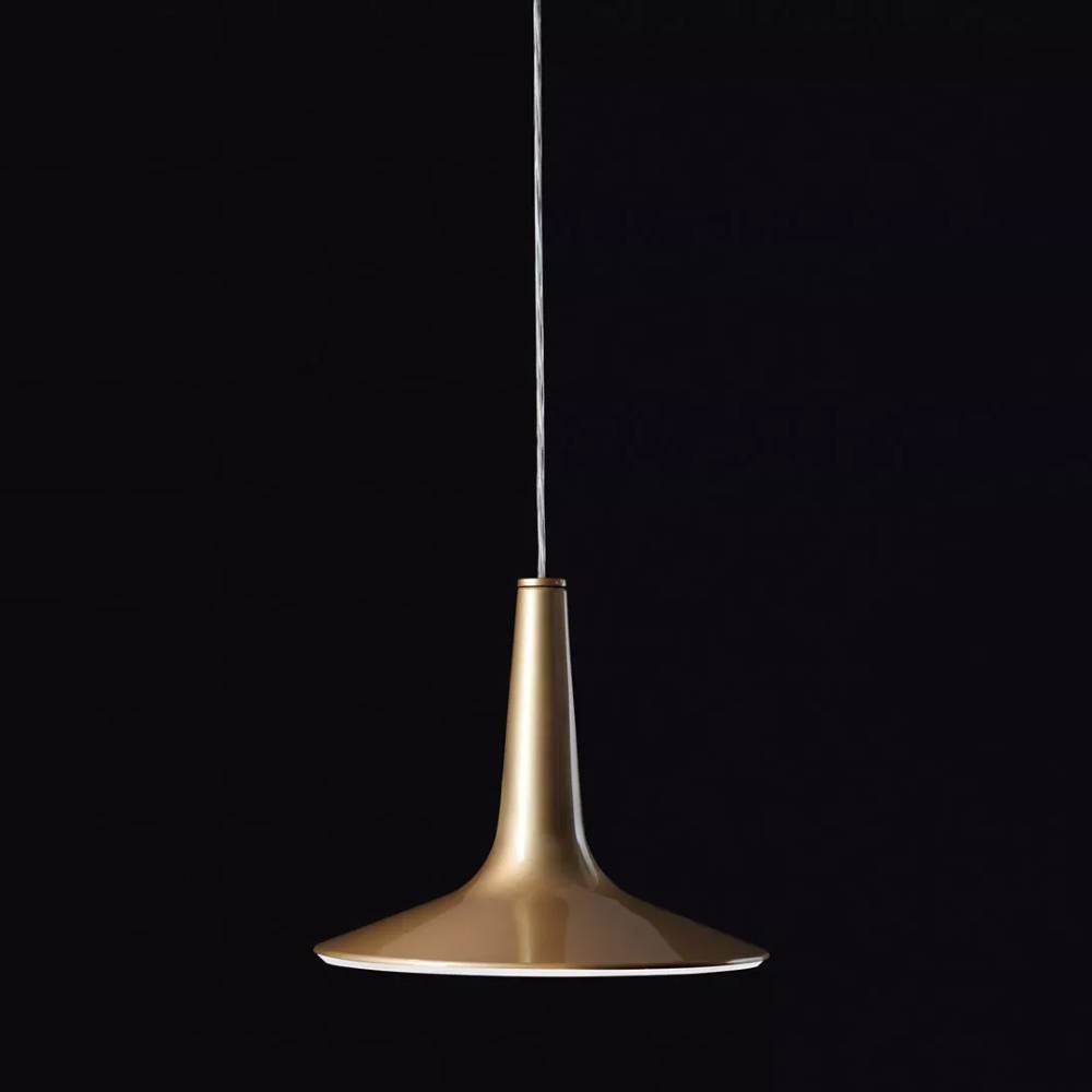 The Kin Suspension Lamp by Oluce, designed by Francesco Rota, features a flared cast aluminum body with slim profiles, closed with a methacrylate disc that diffuses LED light. Available in two sizes and finishes—satin gold glaze and anodic bronze—Kin integrates seamlessly into various domestic and contract environments.