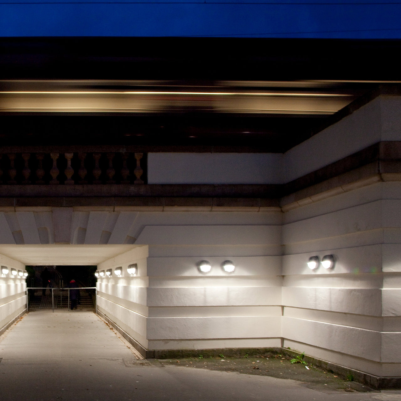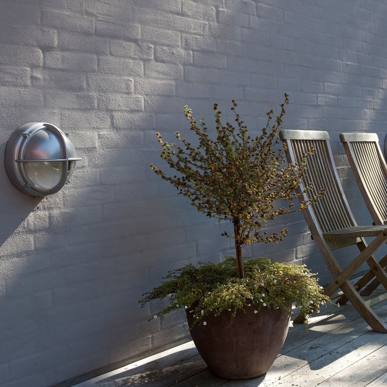 Skot was designed in the early 1900s by Lauritz Knudsen for ships and maritime areas, but its compact, sturdy utility translates easily to other outdoor uses. In die-cast aluminum with an injection-molded, opal polycarbonate diffuser, the fixture is available in full or half-shaded versions and either natural painted aluminum or a powder-coated silver finishes.