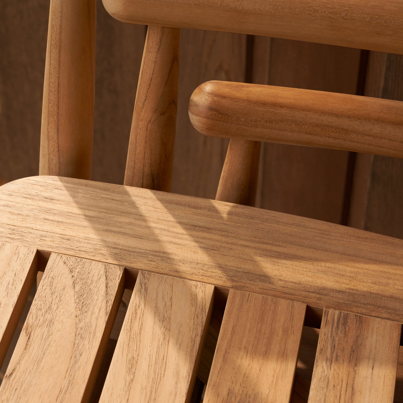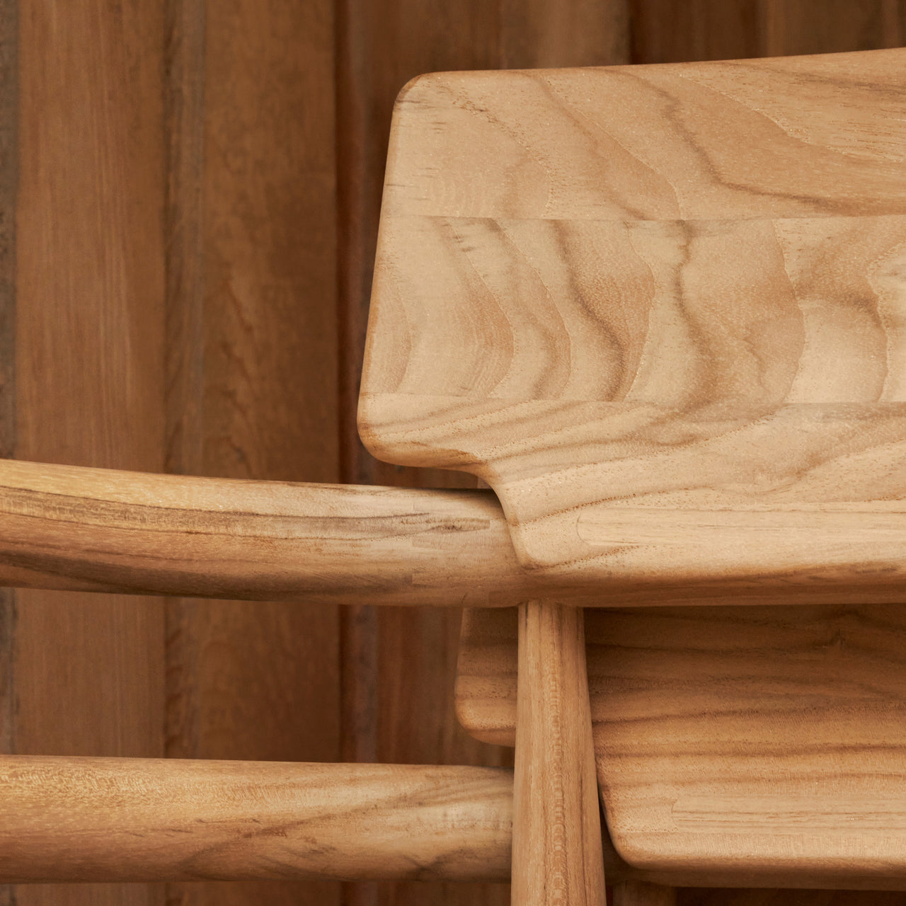 Design trio EOOS builds on its Embrace range for Carl Hansen with E008, an outdoor dining chair that echoes the silhouette of the series' original interior armchair. Crafted from untreated FSC-certified teak that develops a unique patina over time, the comfortable outdoor seating adds the option of a weather-resistant seat cushion. E008 can also be stacked for convenience.