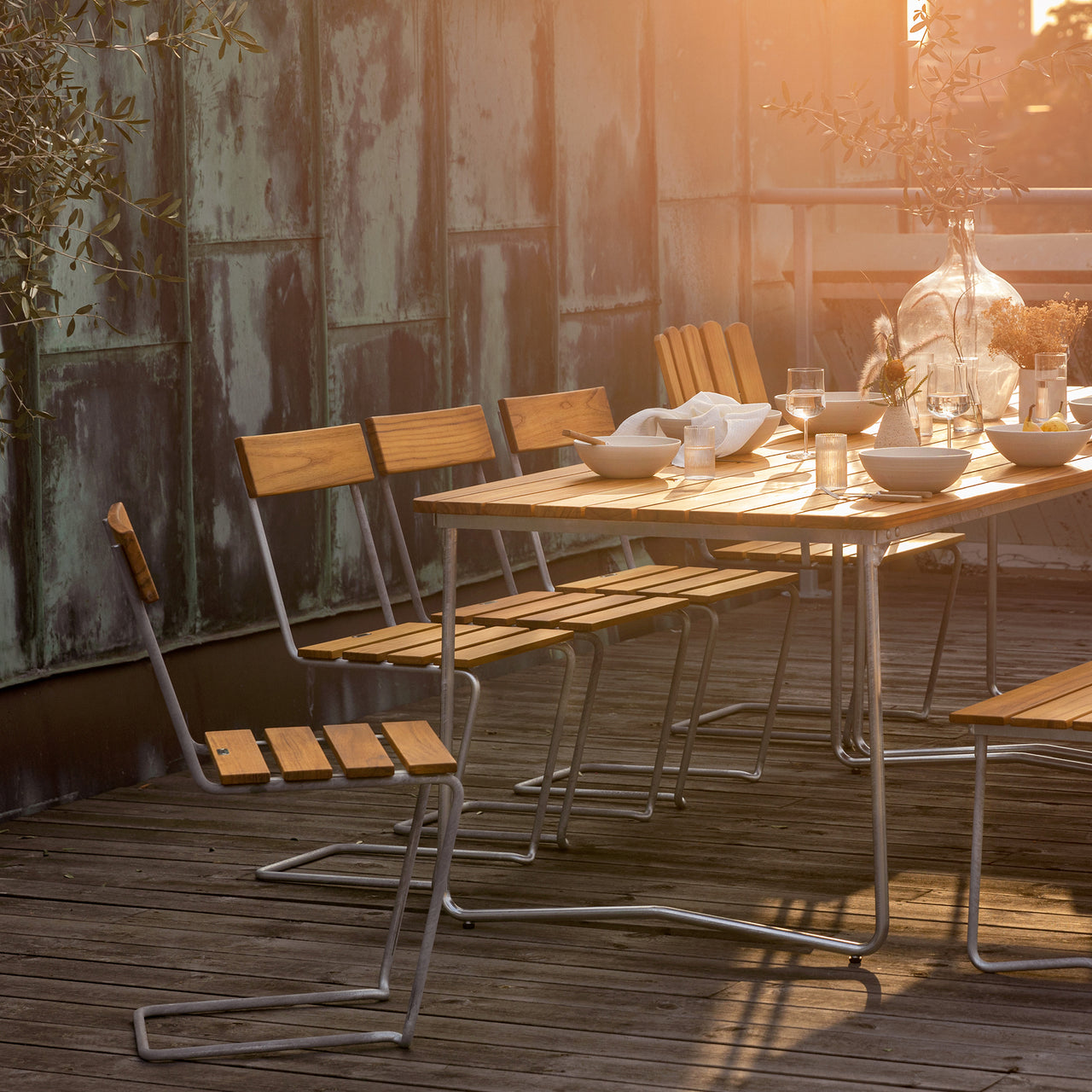 Chair 1 by Grythyttan, designed by Artur Lindqvist in the 1930s, is the smaller sibling of the renowned Armchair A2. It features a slender, stackable galvanized steel frame, including untreated teak. This durable chair provides a gentle rocking motion, making it ideal for outdoor settings such as patios, balconies, and gardens.