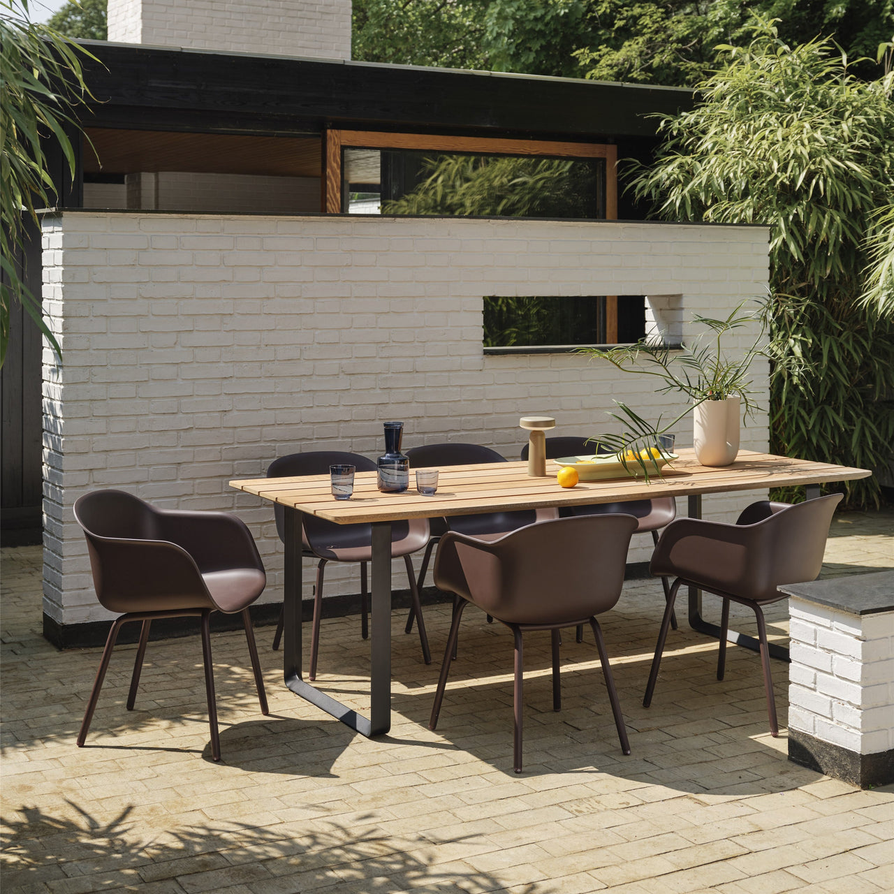 Muuto’s innovative molded Fiber Armchair gets a version made of 100% recycled plastic in an outdoor iteration that brings the same friendly curves and celebrated comfort to patios, terraces and gardens. Available in a range of subtle shades with matching powder-coated steel legs, the seat composite has added UV stabilizers, protecting the color of the chair from the wear and tear of outside life.