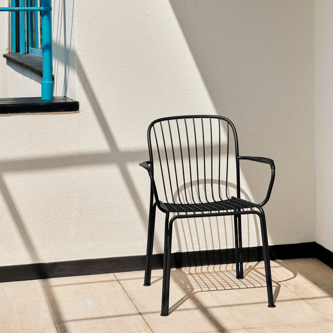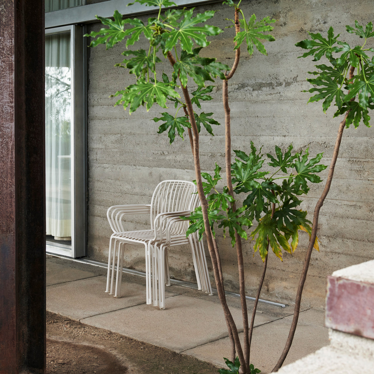 Crafted with a steel frame and a grid structure, this stackable armchair is both lightweight and durable. Its design, featuring sculpted silhouettes and an interplay of light and shadow, was inspired by the neoclassical art of Bertel Thorvald. Complemented by cushions made from eco-friendly materials, this armchair seamlessly blends durability with style.