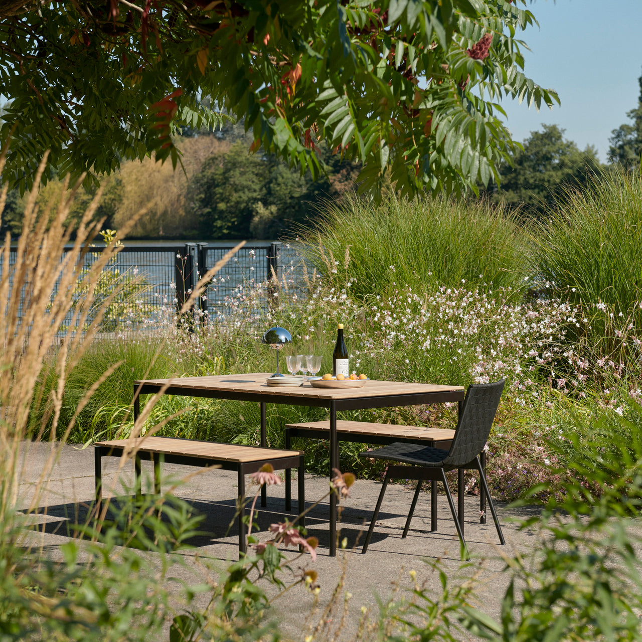 Like its sister armchair, Ville side model’s curved seat is crafted from polyester webbing, selected for its comfort and responsiveness to body temperature. Webbed by hand, the curved surface sits in a powder-coated steel frame with natural teak arms and the seating also stacks up to 8 pieces when not in use.