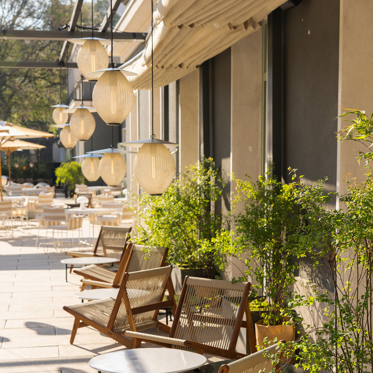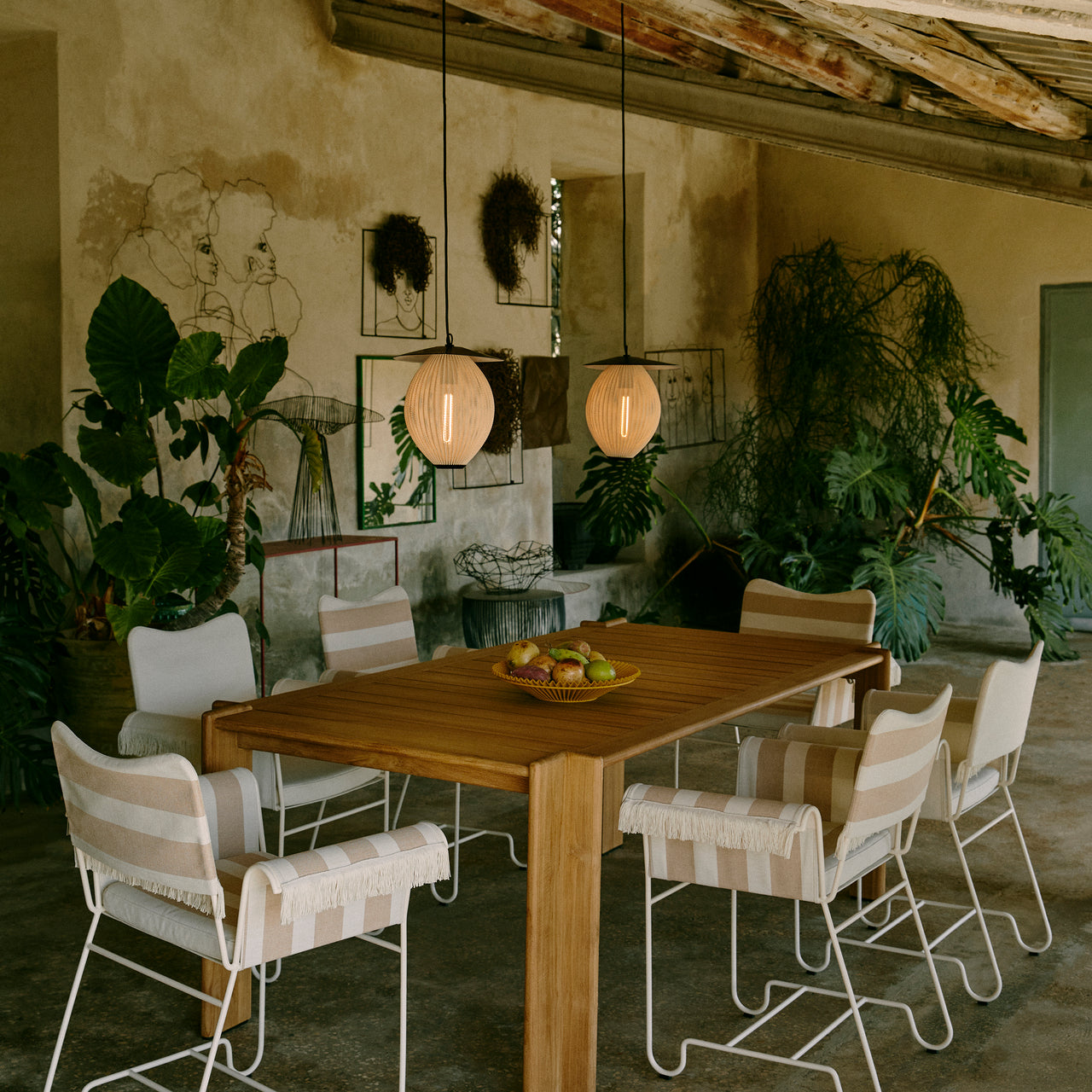 Gubi’s reimagined Satellite Outdoor Pendant adapts Mathieu Matégot’s whimsical 1953 original specifically for alfresco use, down to the ovoid shade crafted from a perforated sheet of stainless steel topped with an aluminum cap that helps direct the light. Ideal for installation on covered patios, verandas or other sheltered dining areas, the pendant comes in a choice of 2 sizes with the semi-matte shade in either cream or mustardy gold.