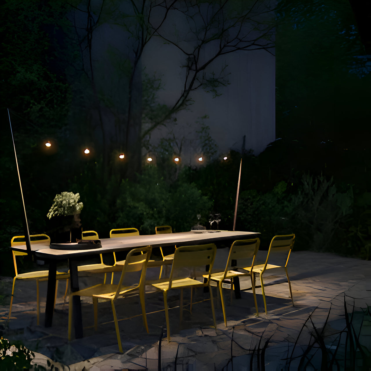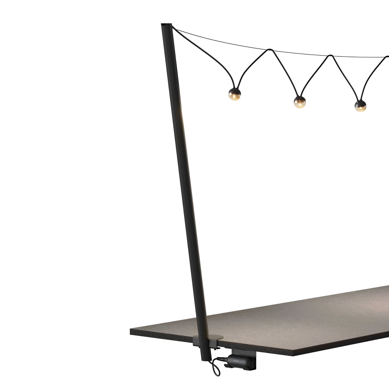 The Cherry Bubbls Canes is a lighting accessory that enhances tables for any occasion. It features a powder-coated steel holder that attaches to table tops and includes a discreet power bank and driver beneath the table. The light chain has seven spherical luminaires made of black silicone and smoke-colored glass, emitting warm white light. Powered by a rechargeable battery, it offers flexible placement and up to 40 hours of use, depending on brightness. The setup is ideal for tables 2 to 4.5 meters wide and comes in a sleek black finish.