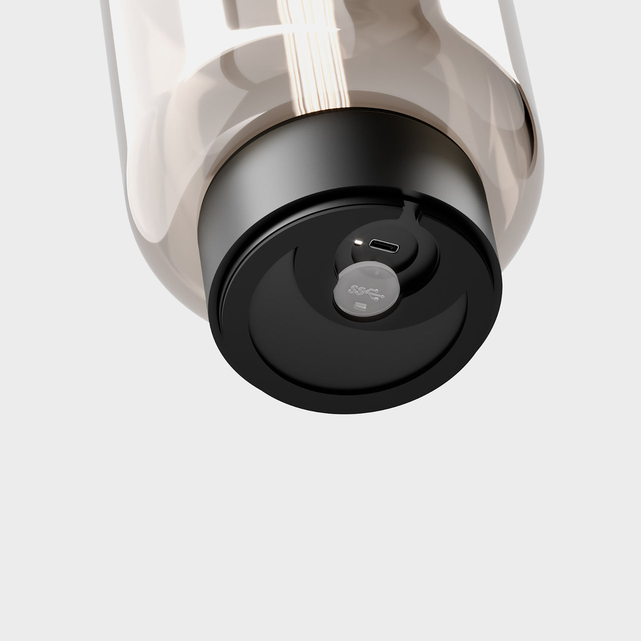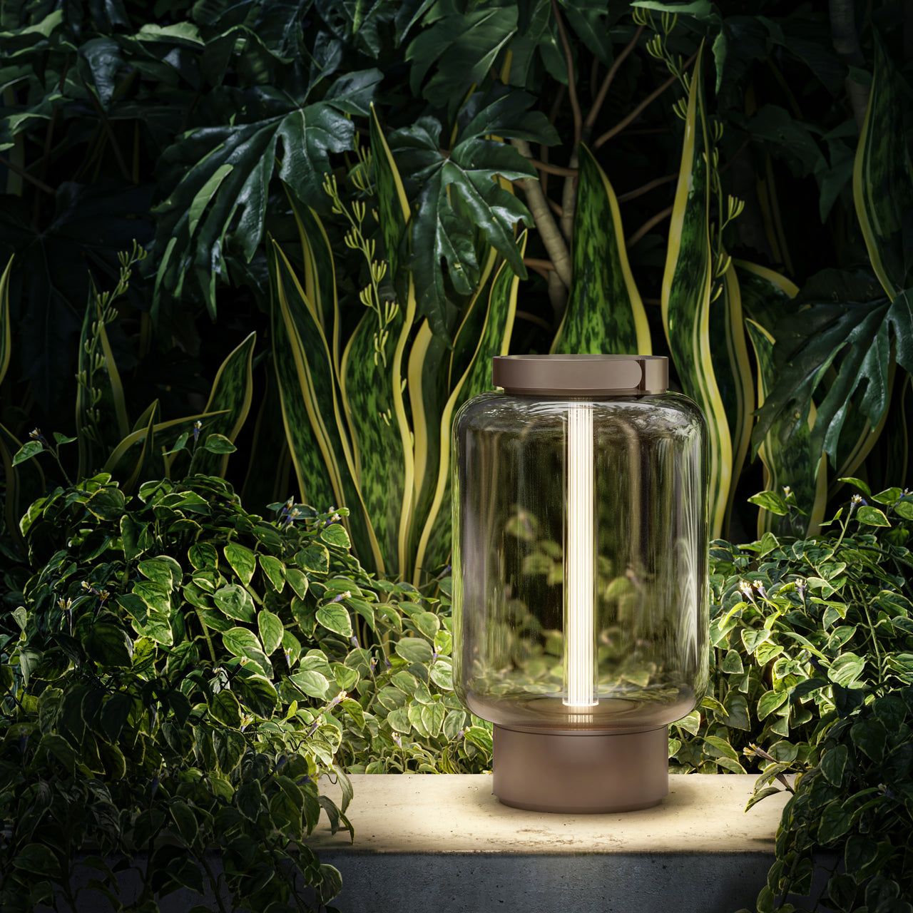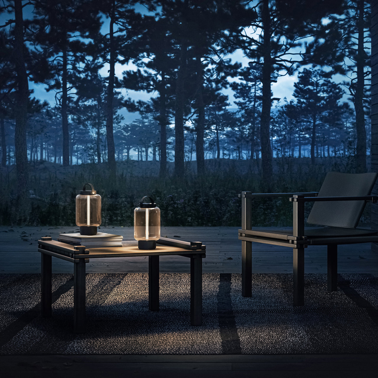 The Qu Table Light is a portable lantern designed for both indoor and outdoor use. It features a 3-step touch dimmer and is available in bright bronze or jet black. Powered by a rechargeable lithium-ion battery, the light provides up to 20 hours of illumination on the lowest dimming level. The lamp is charged via a USB-C cable and offers an IP44 protection rating, offering resistance to dust and water.