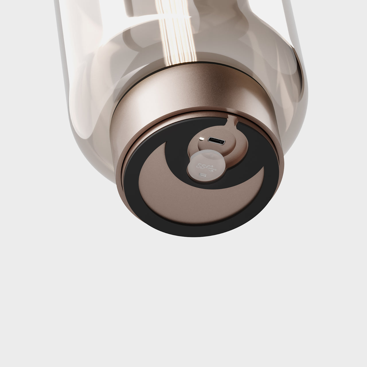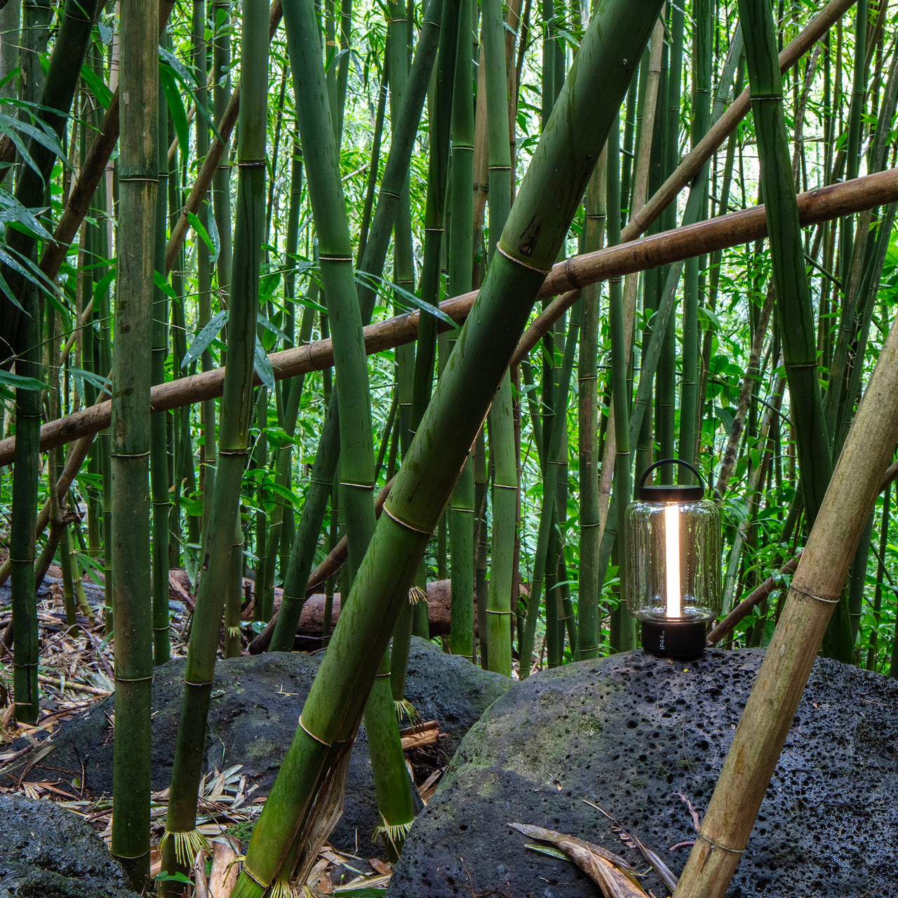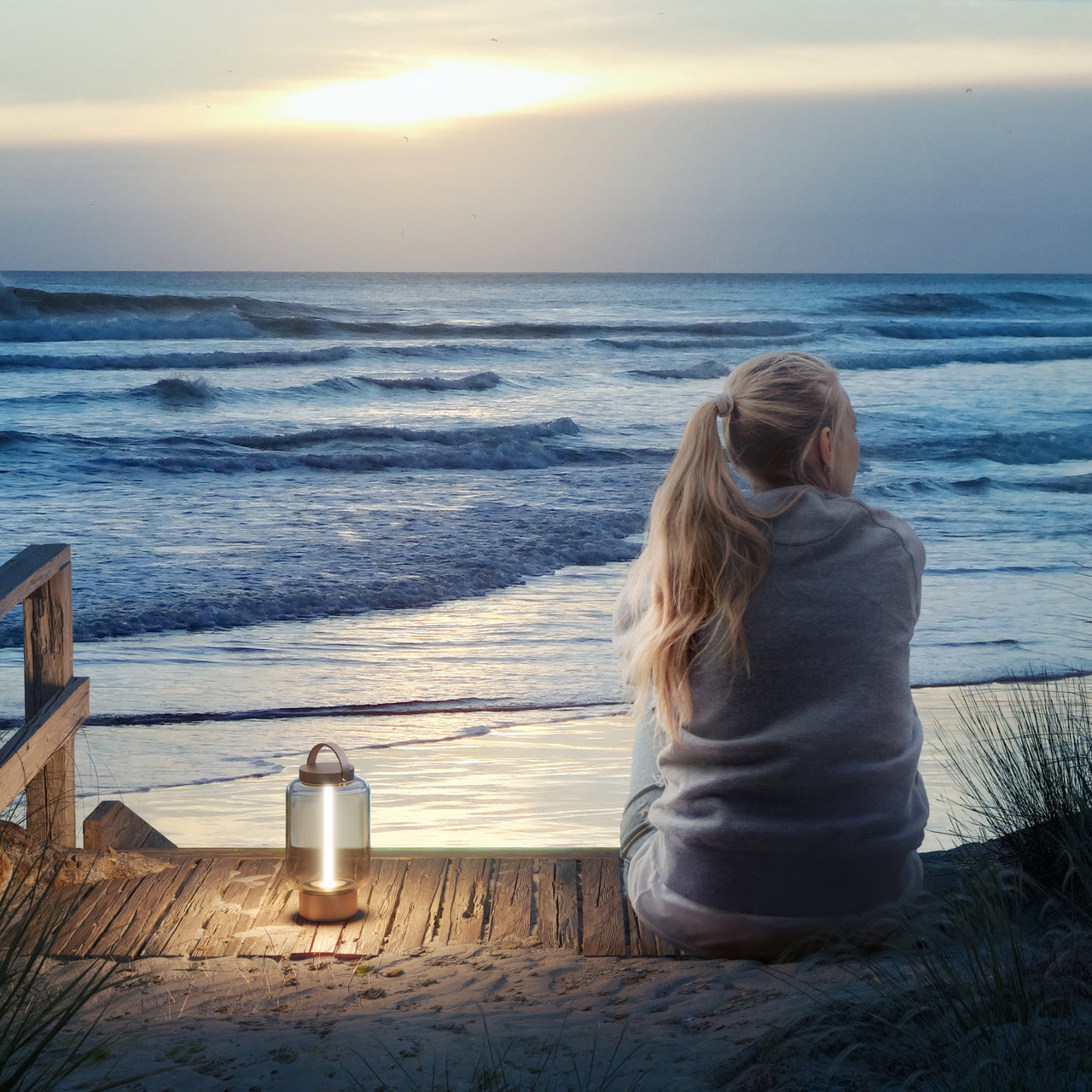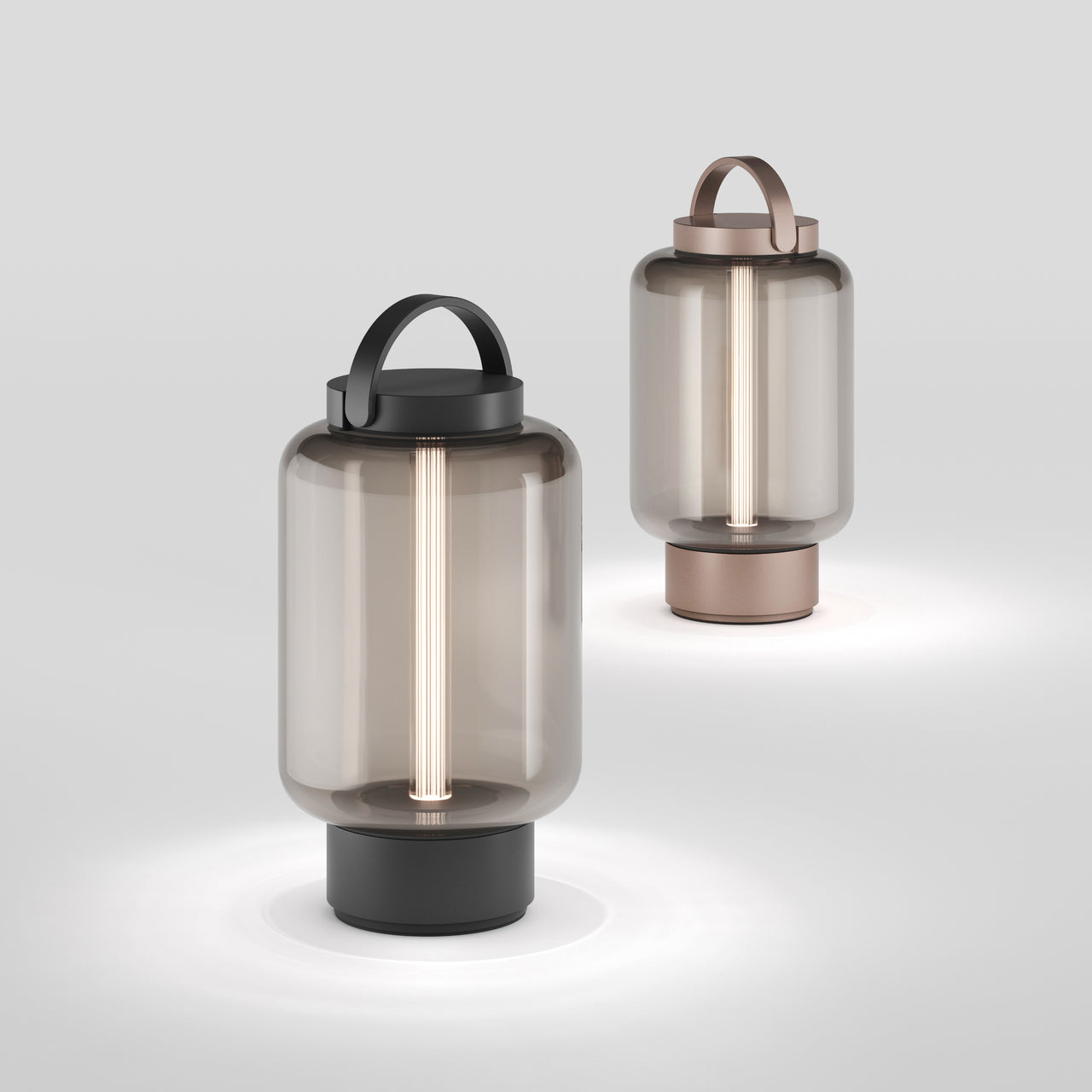 The Qu Table Light is a portable lantern designed for both indoor and outdoor use. It features a 3-step touch dimmer and is available in bright bronze or jet black. Powered by a rechargeable lithium-ion battery, the light provides up to 20 hours of illumination on the lowest dimming level. The lamp is charged via a USB-C cable and offers an IP44 protection rating, offering resistance to dust and water.