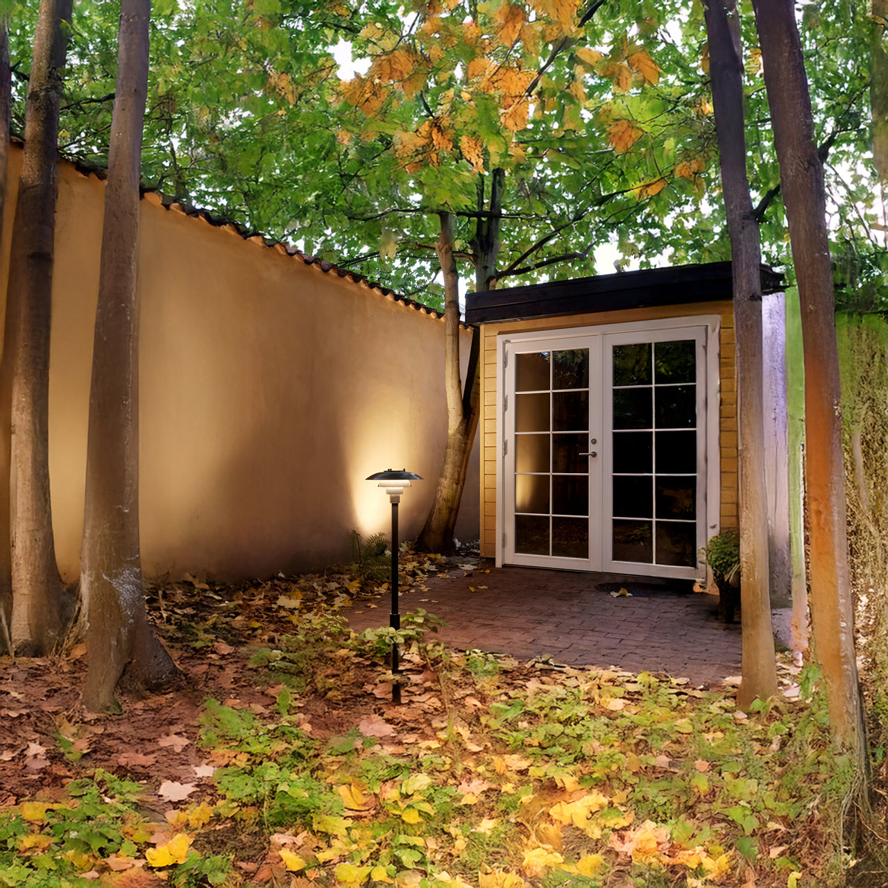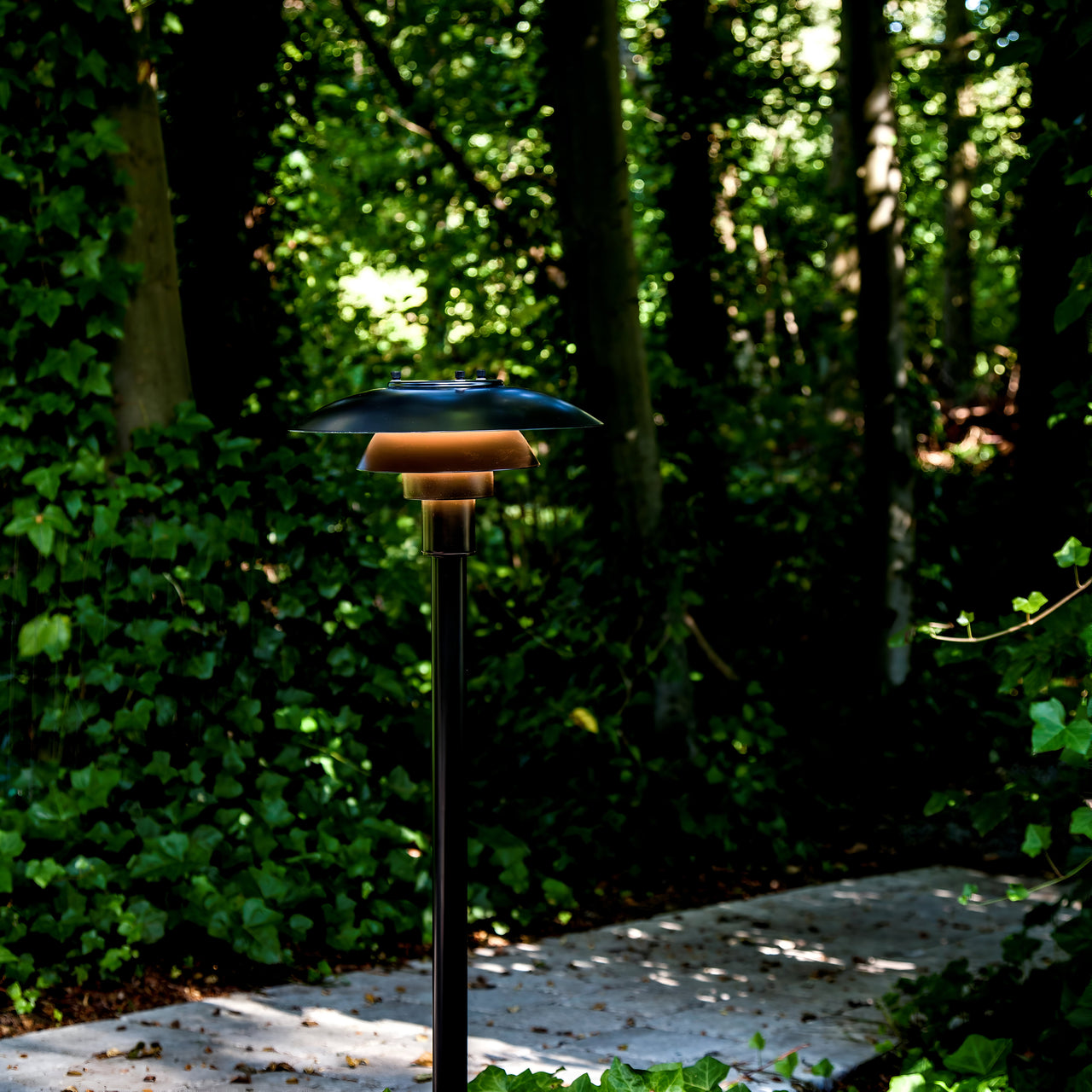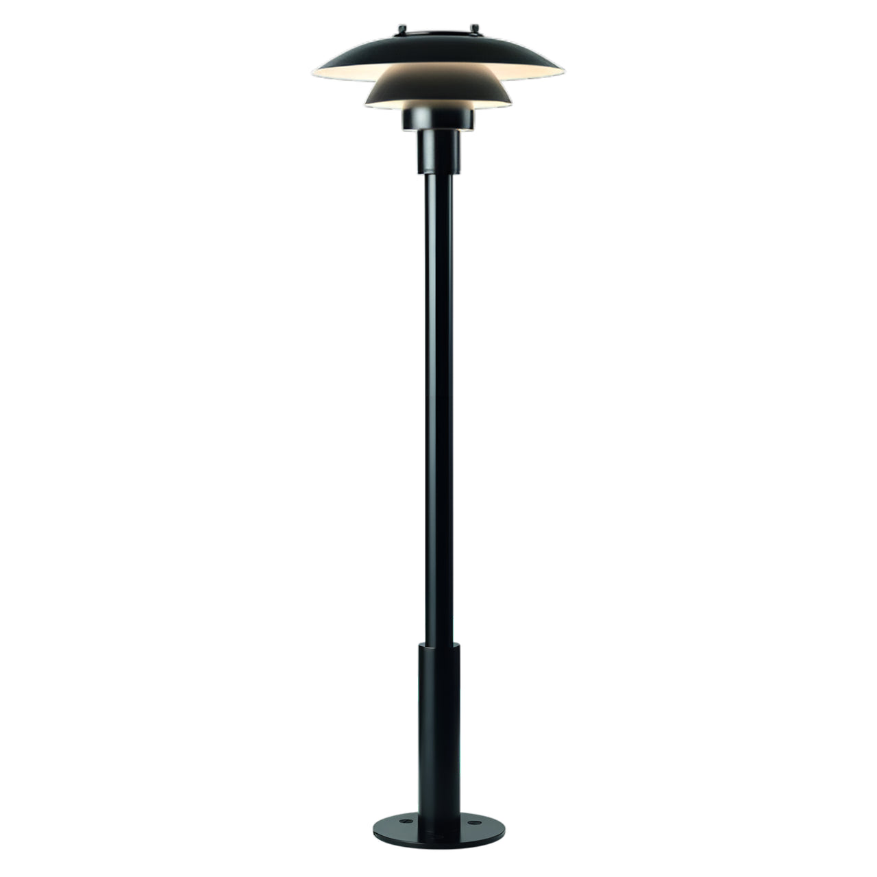 The PH 3-2½ Bollard provides glare-free illumination for outdoor spaces. Designed by Poul Henningsen, it utilizes a three-shade system to direct light downward, creating a comfortable ambiance. The fixture is constructed with metal shades and a glass shade holder, ensuring durability in various weather conditions. Its black finish complements diverse exterior settings. This design is based on the logarithmic spiral, achieving even light distribution.