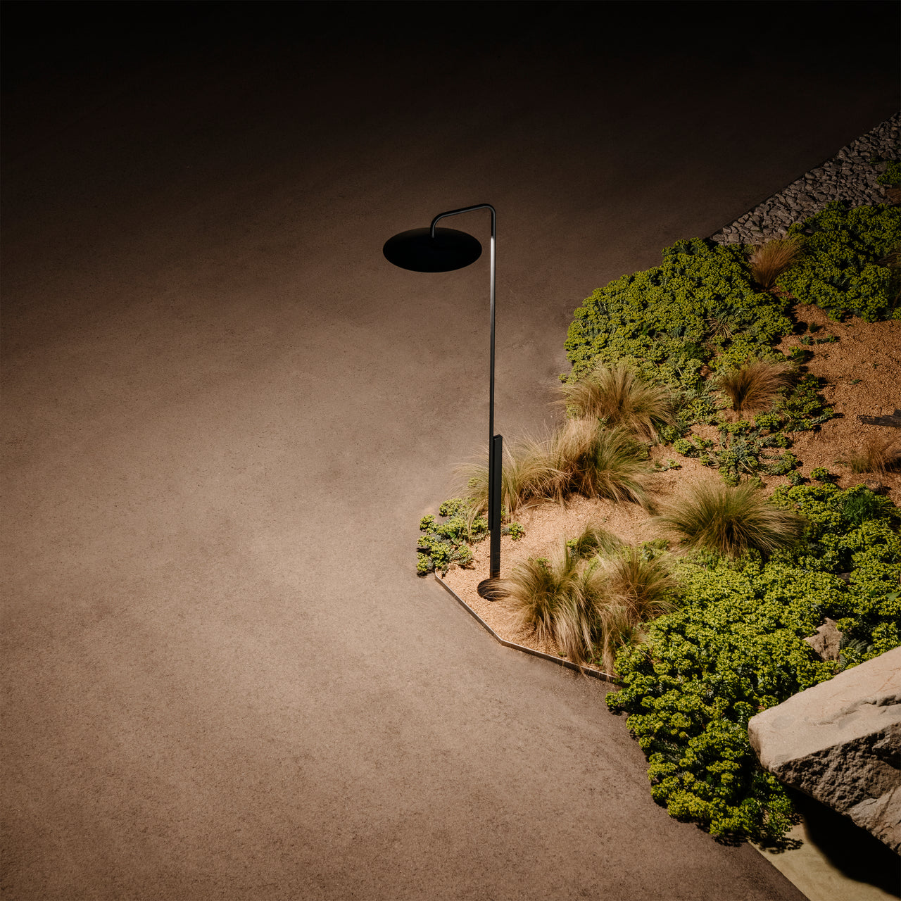 A modernist take on a streetlamp centers the array of outdoor additions to Barcelona designer Joan Gaspar’s signature Ginger collection. Lamppost stretches almost 3 meters high to discreetly illuminate a garden or outdoor entryway. In matte black, the lacquered steel structure features an integrated LED plate and a lacquer-red aluminum diffuser with a reflective white interior.