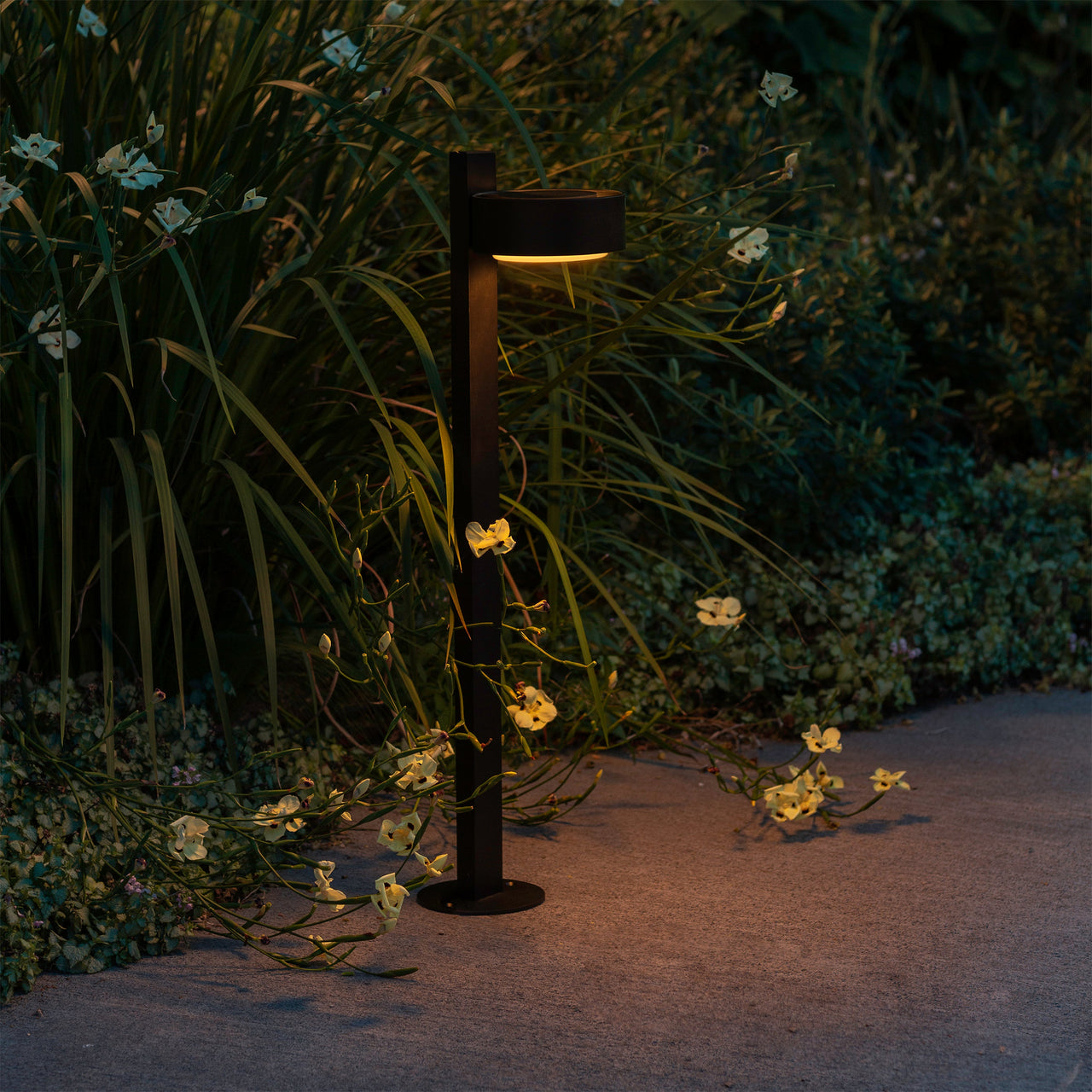 Expanding its reach into outdoor spaces, Barcelona designer Joan Gaspar's amusingly named Plaff-On! series adds a bollard version to illuminate pathways or areas of a garden. As in the companion styles from Marset's collection, it features a white blown-glass diffuser that seems to float, detached from the ring that envelops it. Fixed on its structure made of black-lacquered aluminum, the light wafts down, creating a luminous halo of ambient illumination.