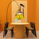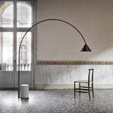 The journey to Ozz begins with its large, look-at-me arc, a standout in any room setting. Anchored by a solid concrete form, Miniforms soaring floor lamp ends in a cone-shaped lampshade. Between the base and the endpoint, the adjustable shaft curves in a dramatic trajectory of engineering, a graphic curl in black-lacquered metal.