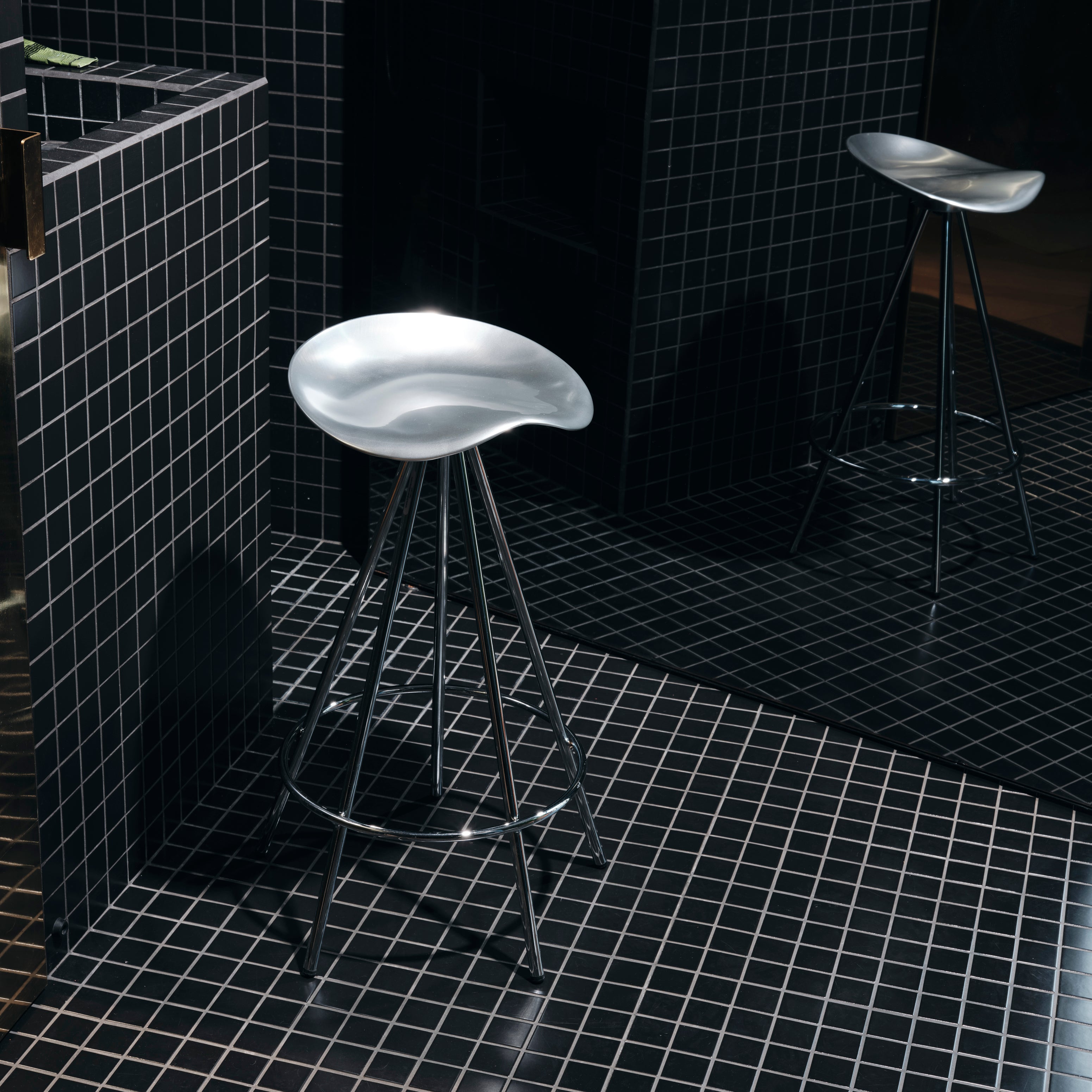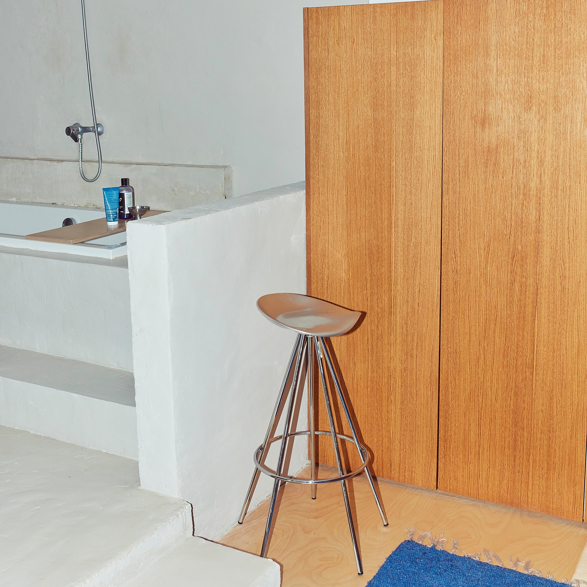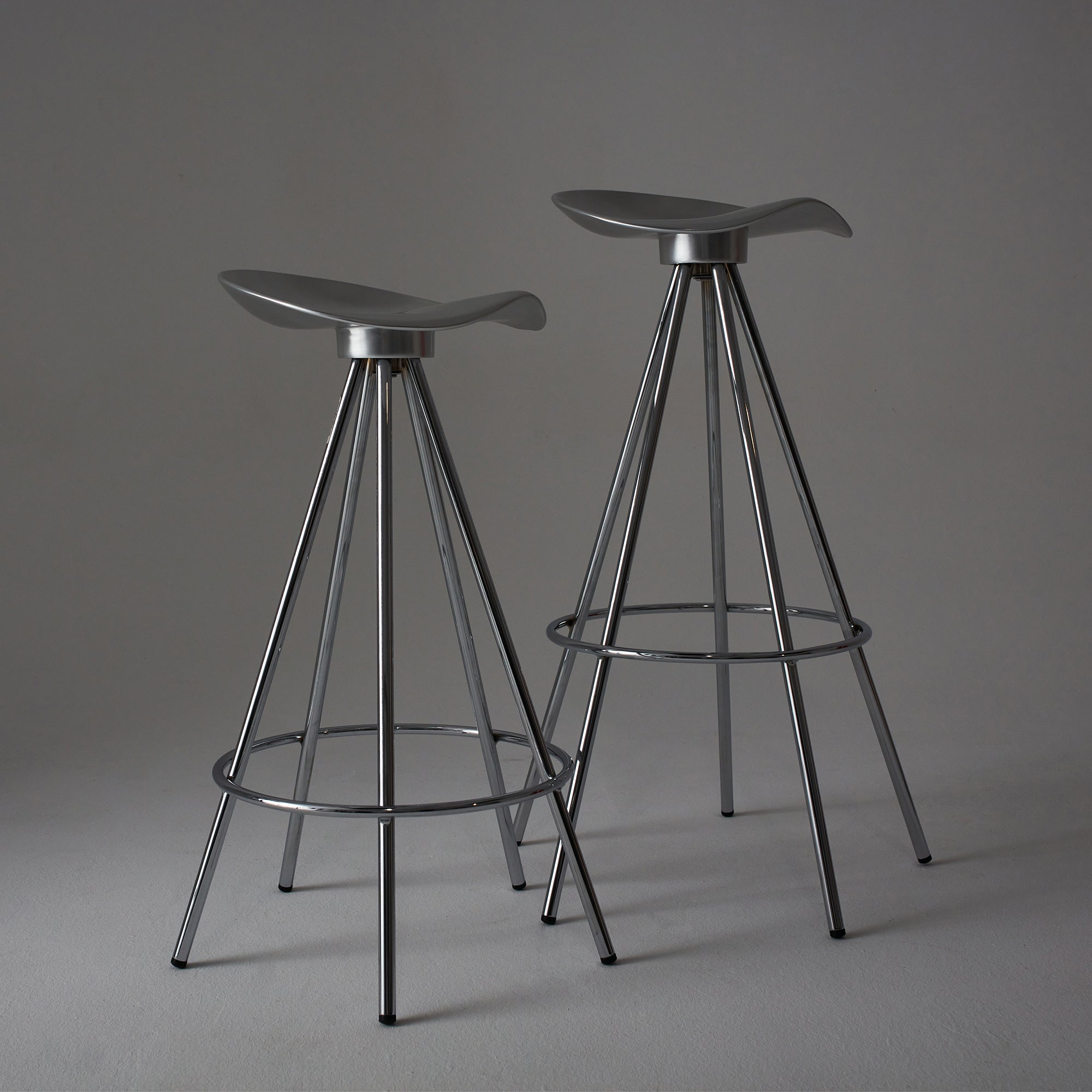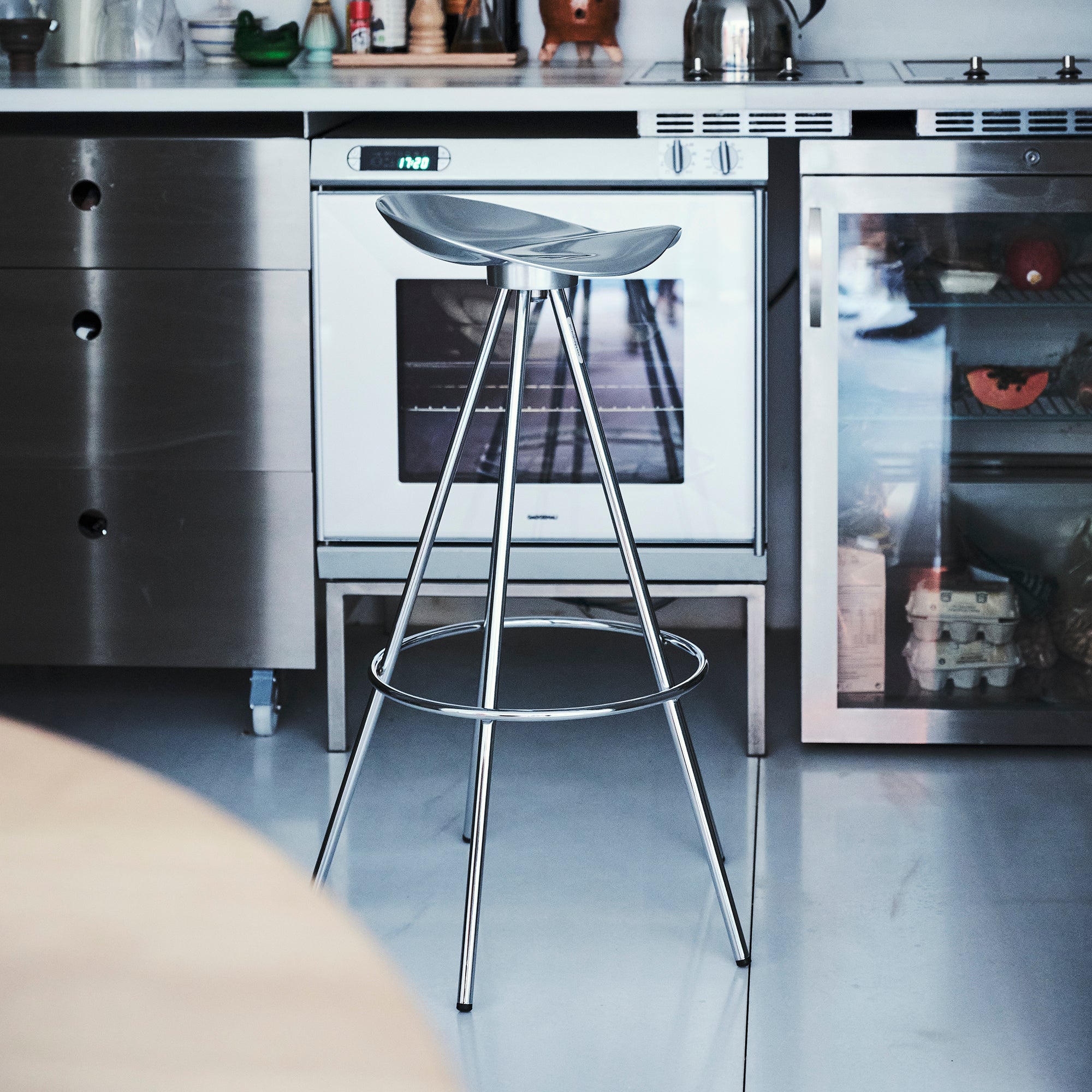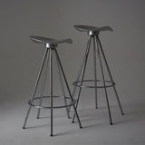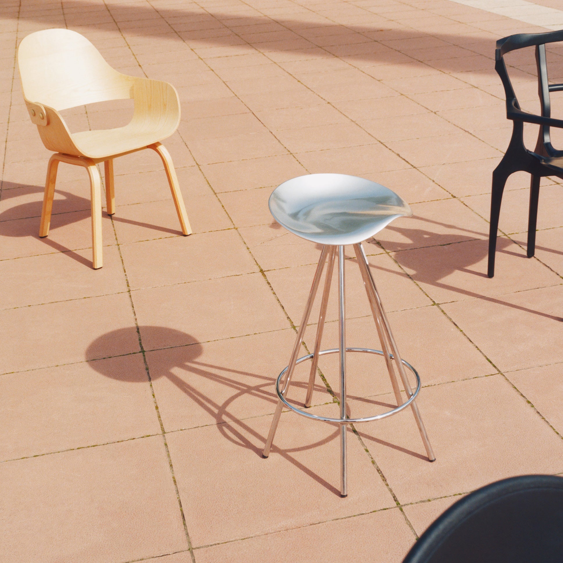 Originally created for the bar at a '90s Catalan discotheque, Jamaica has a distinctive but timeless look with an emphasis on its ergonomically shaped swivel seat in silvered aluminum or solid varnished beechwood. Offered in both bar or counter heights, the stool has a 5-legged steel tubing base that comes in a choice of complementary chromed or black-stained finishes.