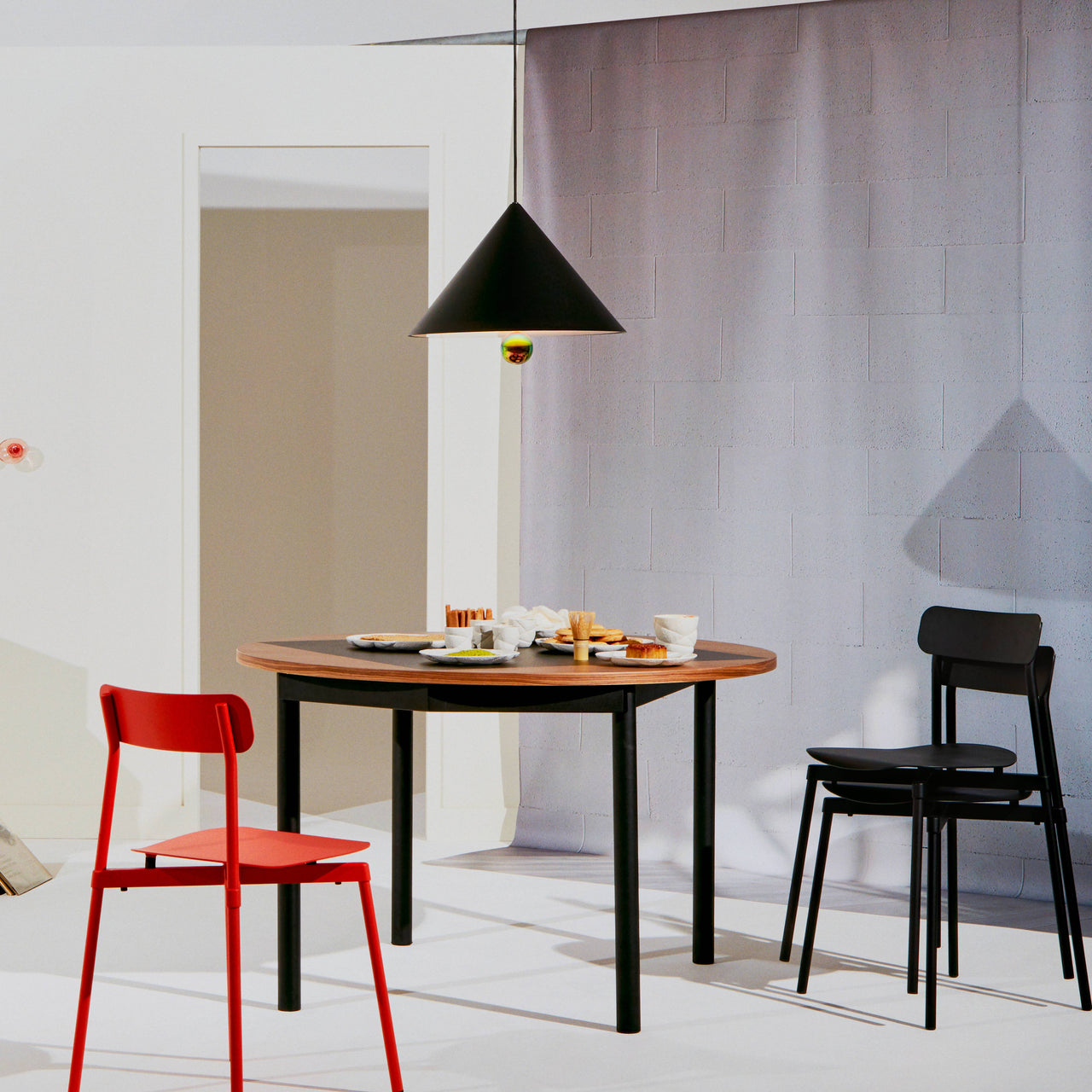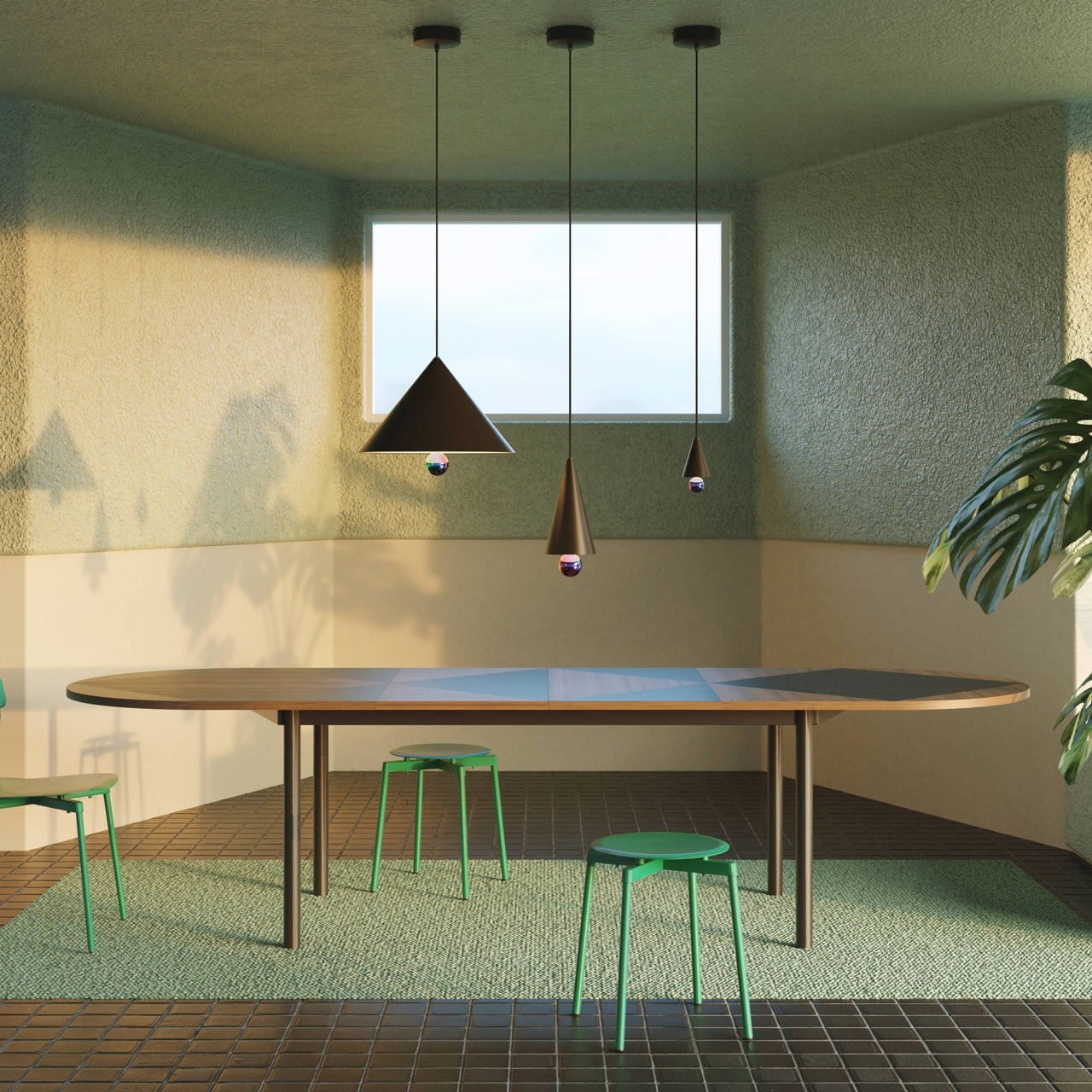 This Cherry pops with shimmering reflections of light. The elemental cone shape is capped with a diffused shade that reflects off the mirror-finish metal "cherry." There's sleek shade coupled with the shiny ball—in golden or iridescent finish—makes for an effect that conjures a Venetian harlequin. It's a whimsical yet sophisticated aesthetic by Australia-based design studio Daniel Emma—as in Daniel To and Emma Aiston—that is right in line with French House Petite Friture.