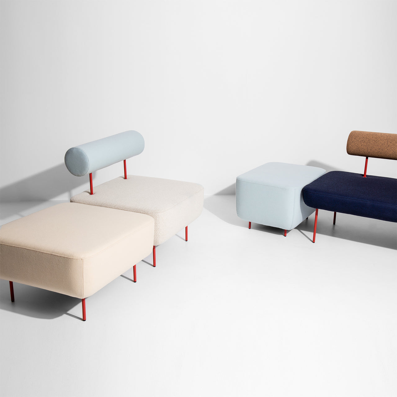 The larger of 2 modern stools, with a broader seat and moderately deep cushion, is one of just 4 elements in the versatile Hoff furnishings series. Yet designers Morten & Jonas’ imaginative modular pieces can combine to make a single seating unit or furnish an entire living room. Looking at contrasting fabric swatches led to the designers’ vision of the contrasting sizes and shapes of this uniquely stylish collection.