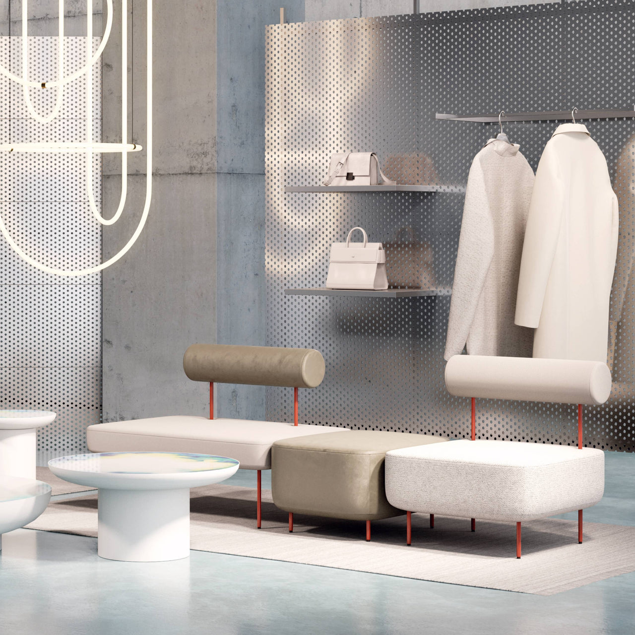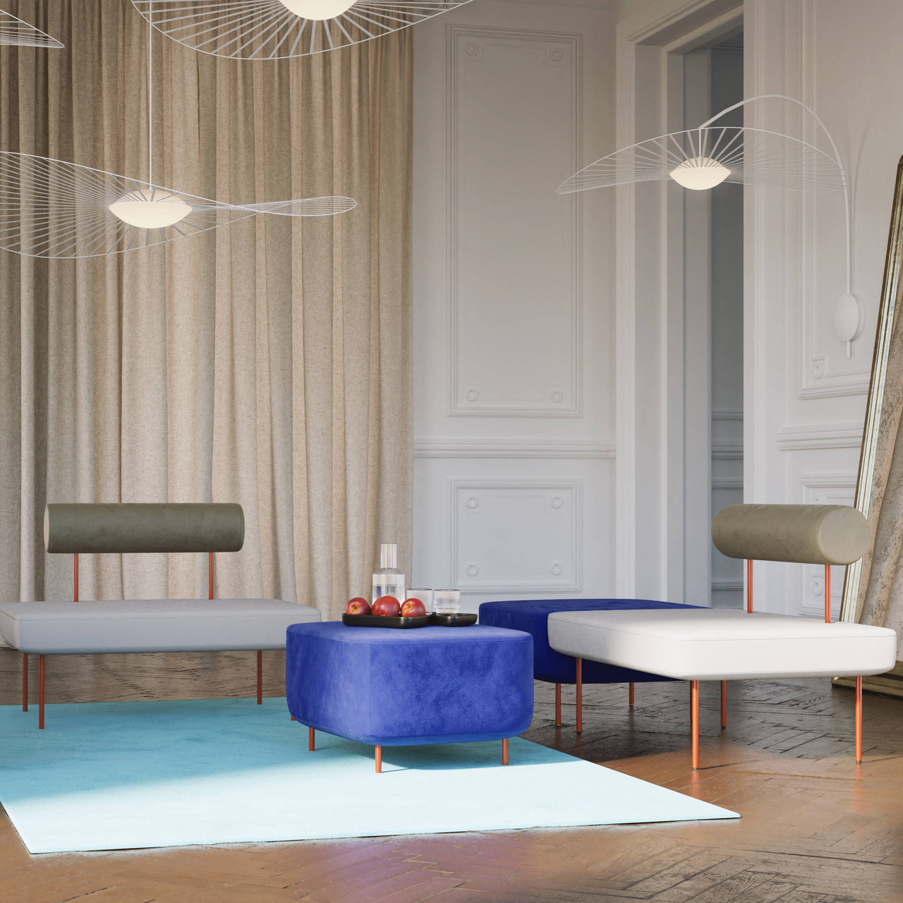 Hoff’s smaller of 2 modular stools features the series’ deepest upholstered cushion and a narrower seat. Along with the larger model and a pair of companion chairs, they were originally inspired by looking at contrasting fabric swatches, say designers Morten & Jonas. Exploring the visual and tactile qualities of the materials led to conceiving the varied furniture pieces that can combine to make a sofa or furnish an entire living room.