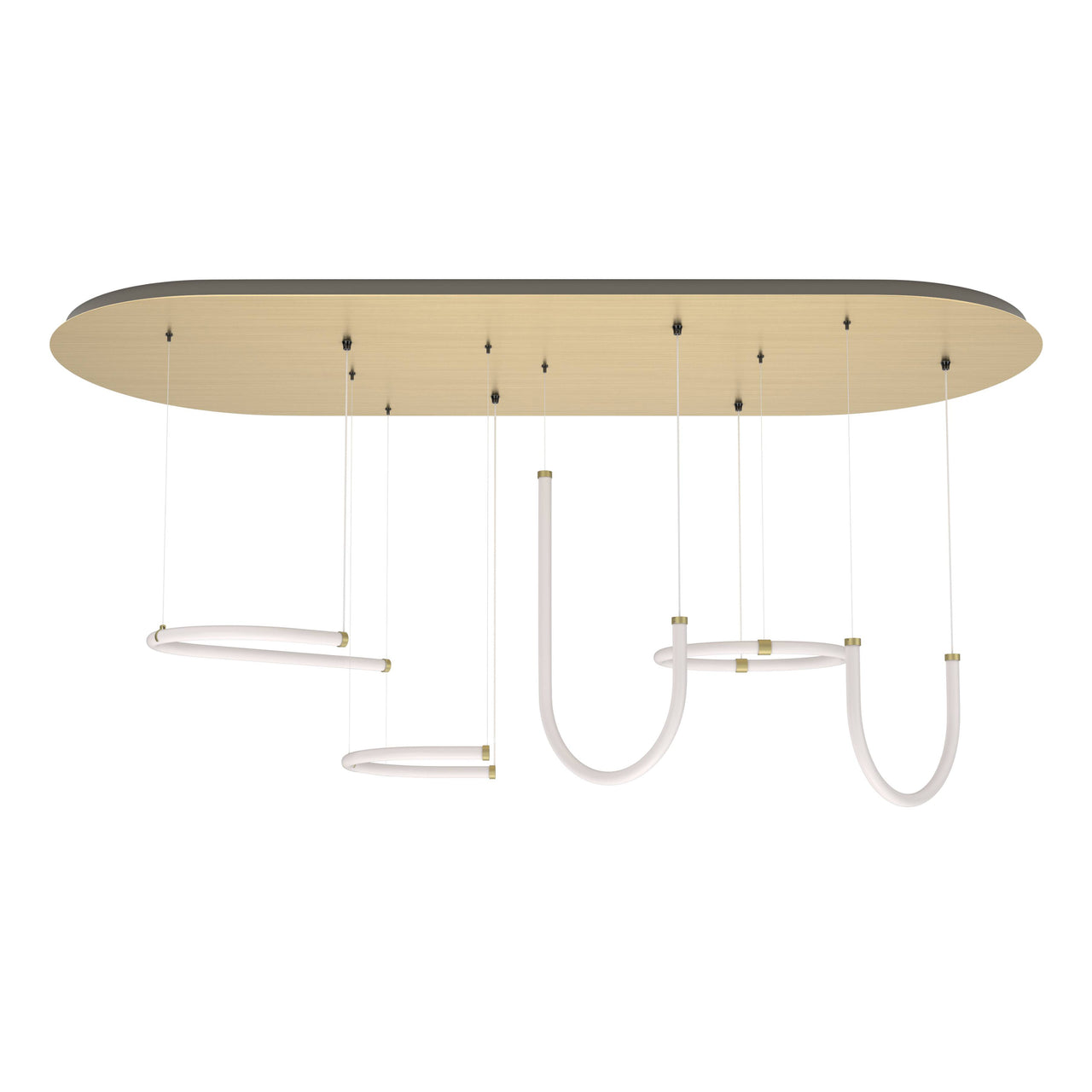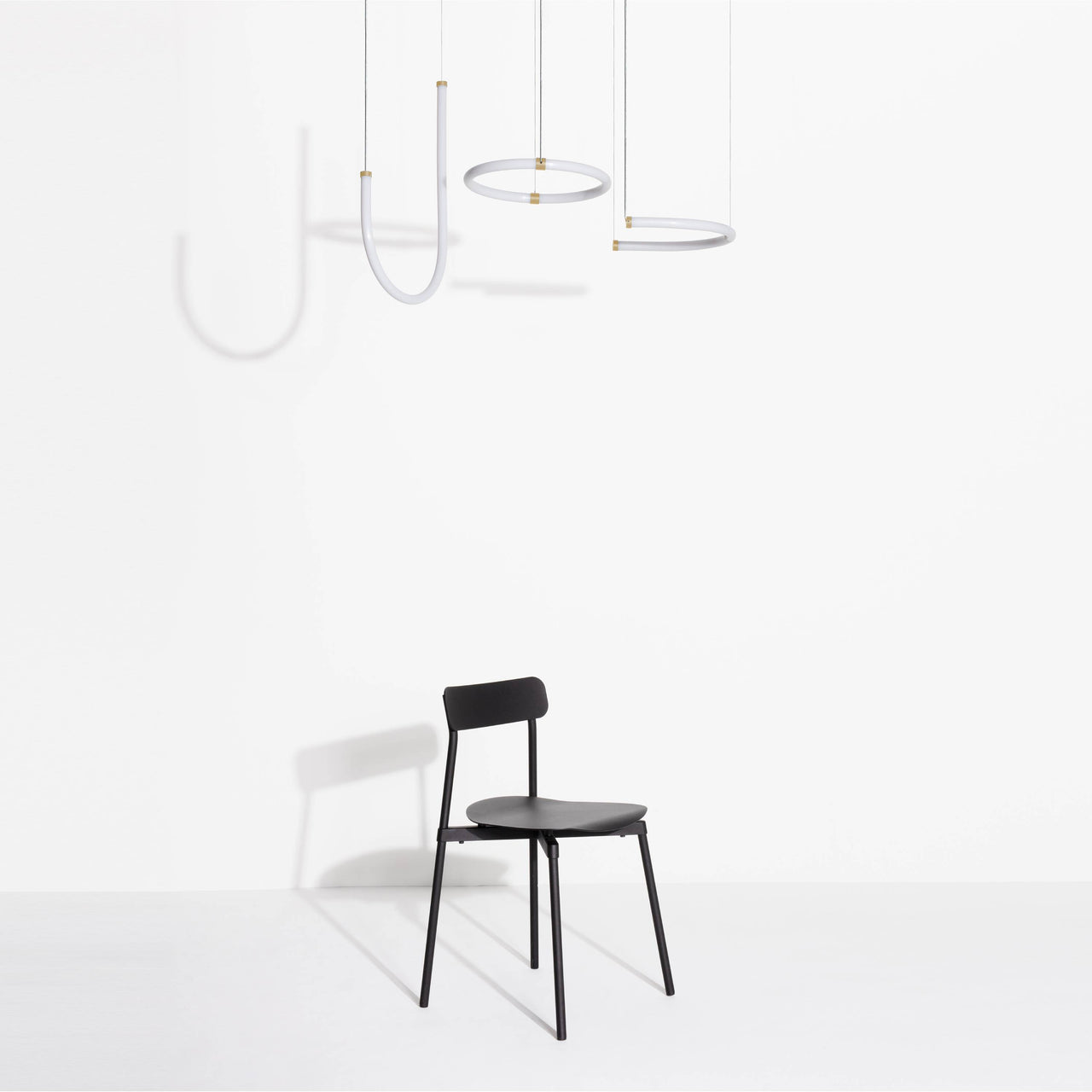 Petite Friture's trio of varied pendants in its tubular Unseen series is paired in preconfigured groupings of 3 for an intoxicating light installation. Designers Arianna Lelli Mami and Chiara di Pinto of Milan's Studiopepe were inspired by mood-changing neon lights and have replicated that glowing effervescence with updated LED technology in U, J or O formations. Suspended from a canopy of polished brass, the assemblage of different shapes also casts multiple shadows on the walls, with a glint of metallic accenting each suspension light.