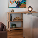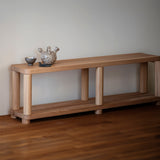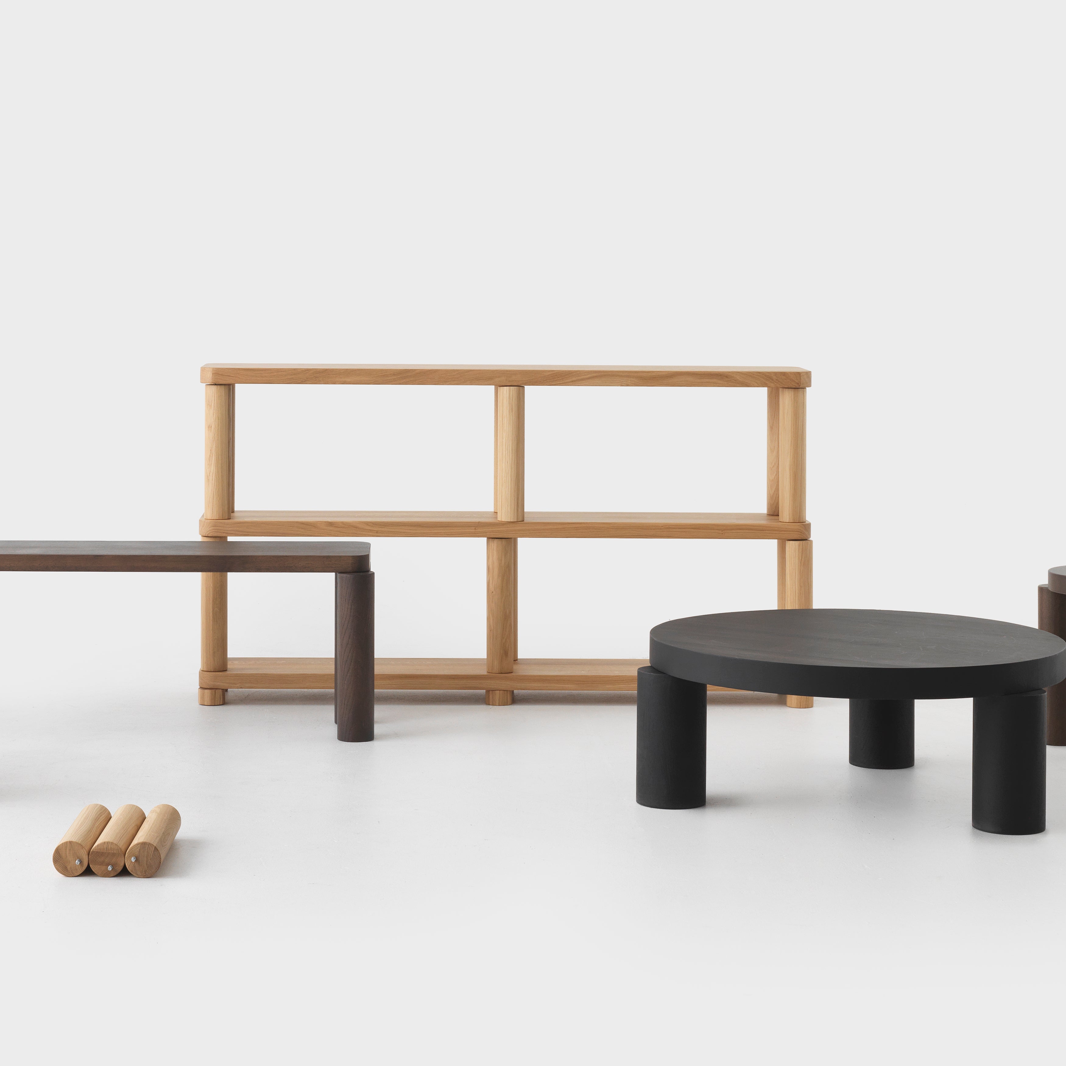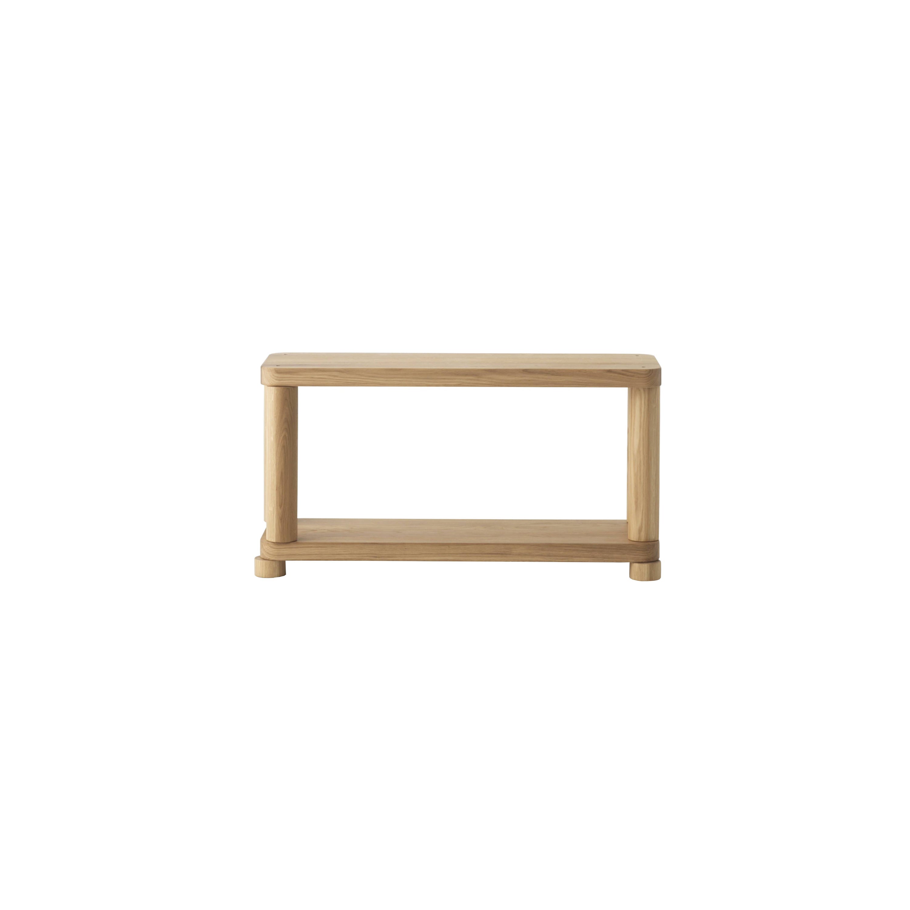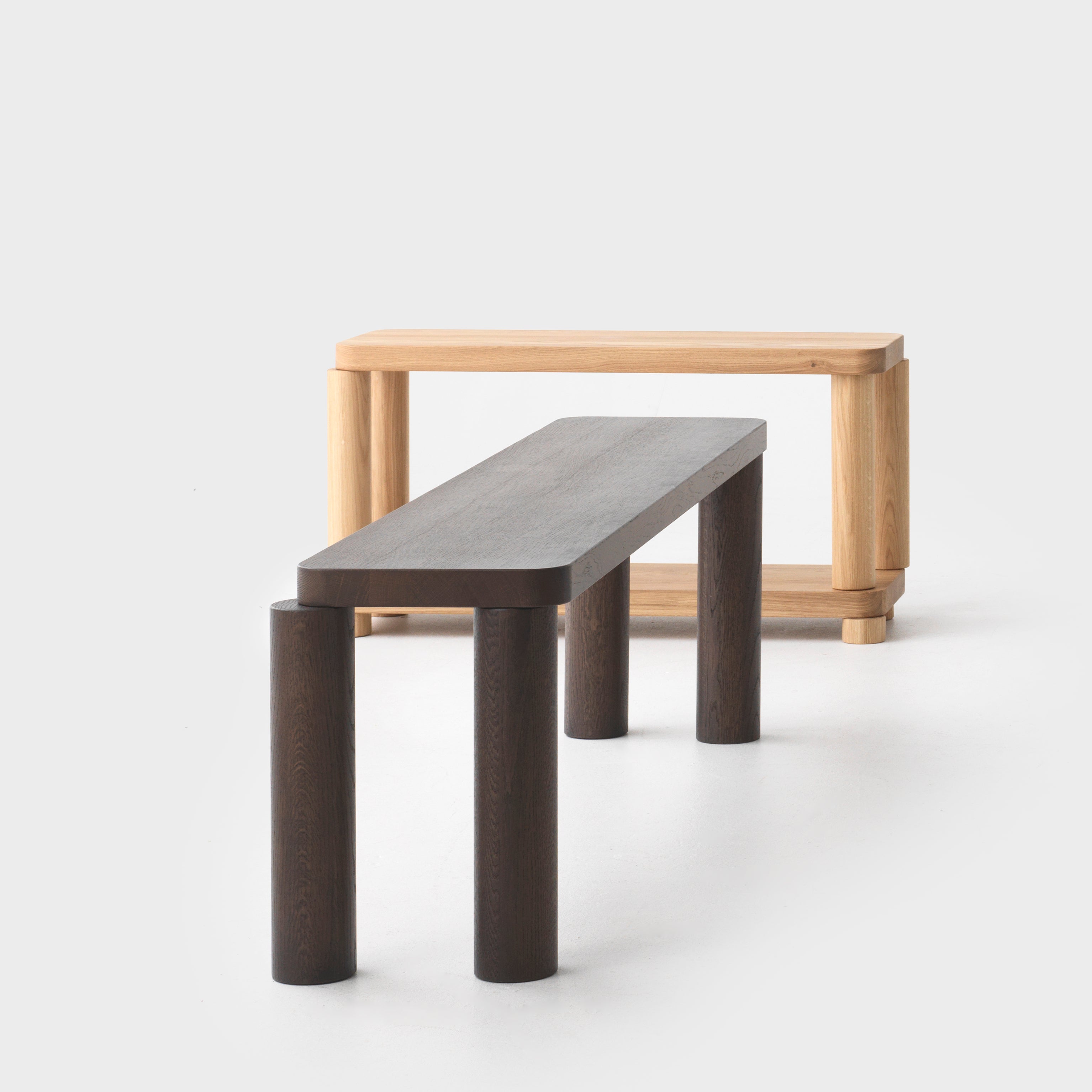 With a burly aesthetic balanced by a playful signature design element, Philippe Malouin adds a shelf version to his Offset range. Embracing the thickset beauty of solid oak, the unit lives up to its name with each leg appearing slightly off-center, via an adjustable threaded connector that enables it to sit in an individualized position. Available in natural and umber stained finishes, this Offset offers both storage and display possibilities in a choice of 2 lengths and single or double-tier models.