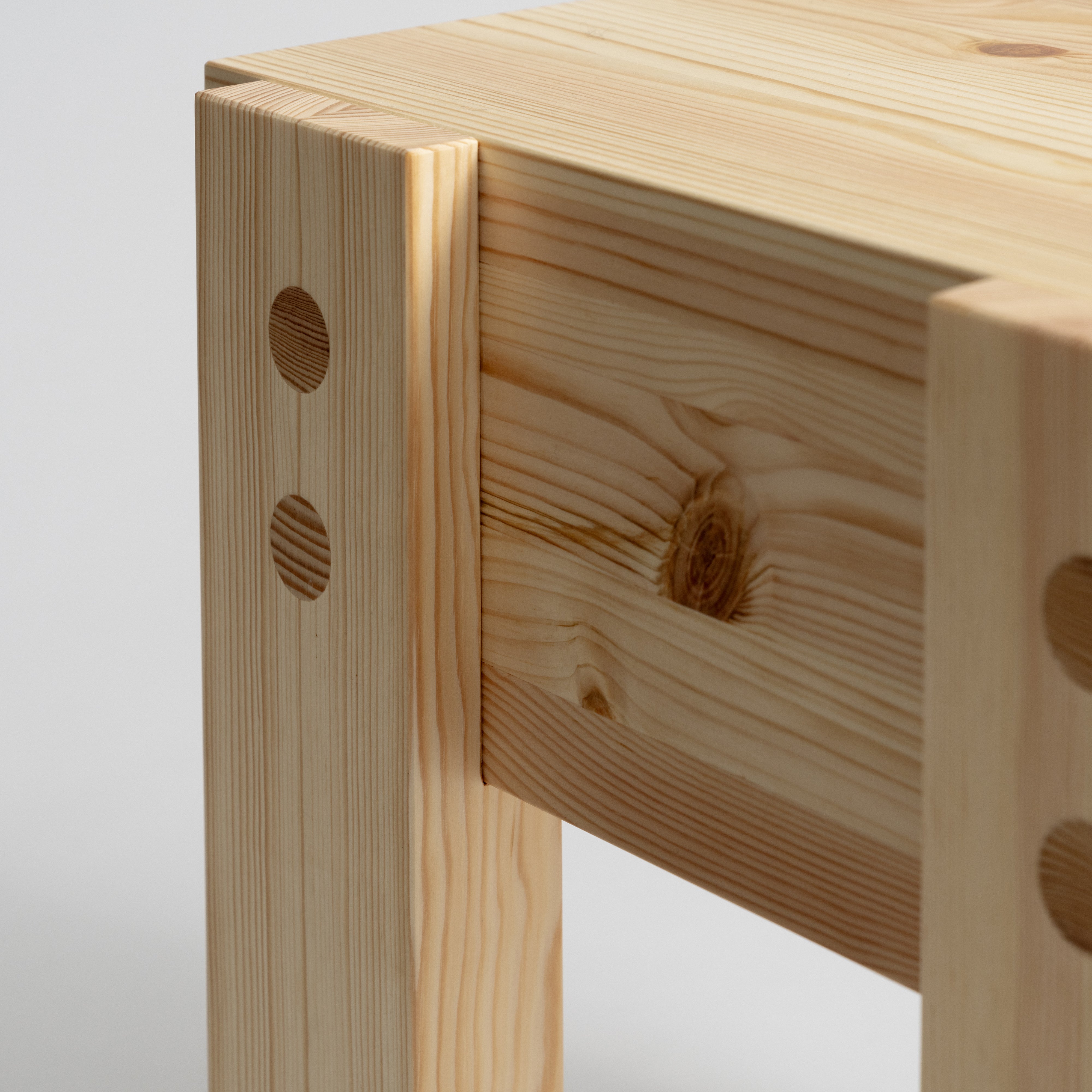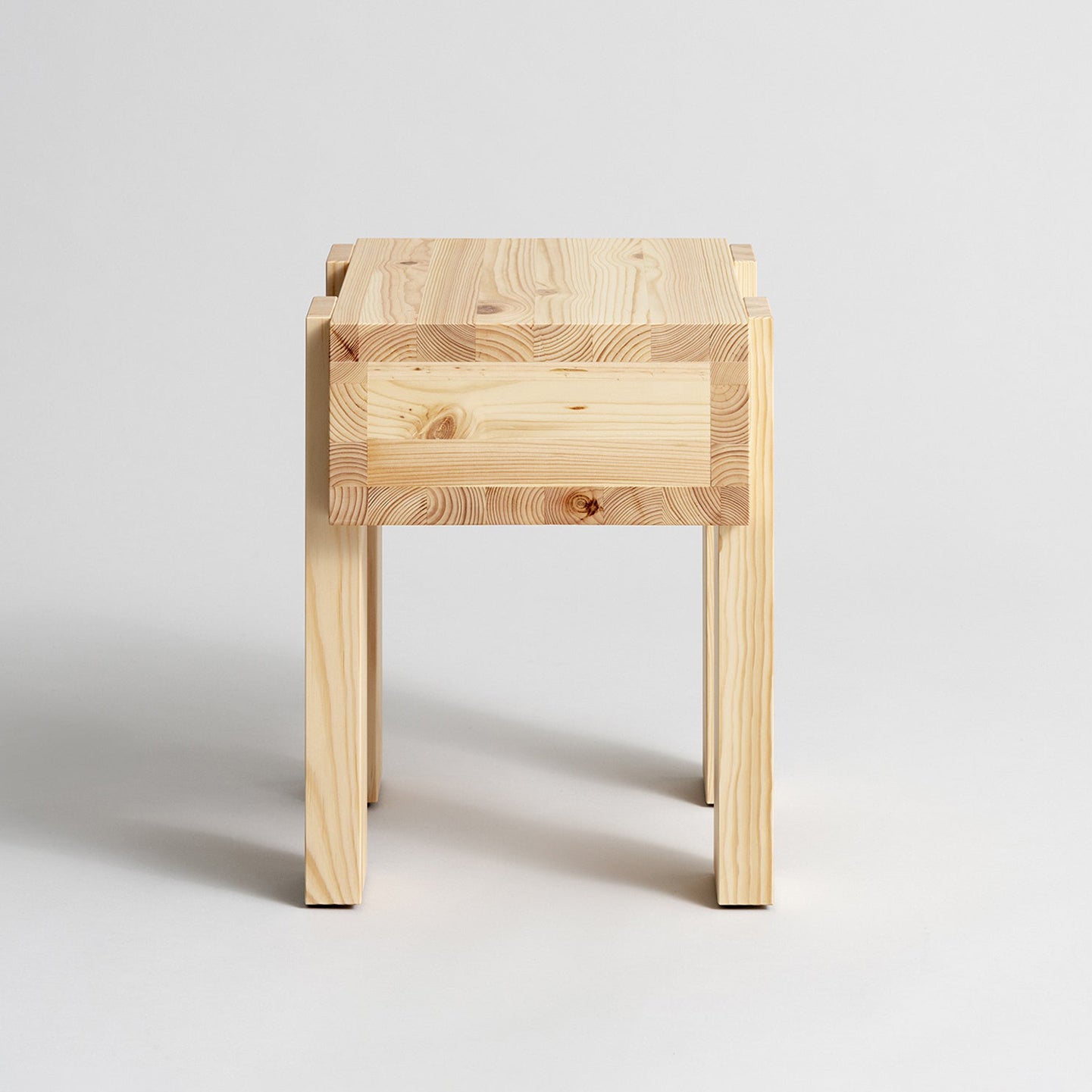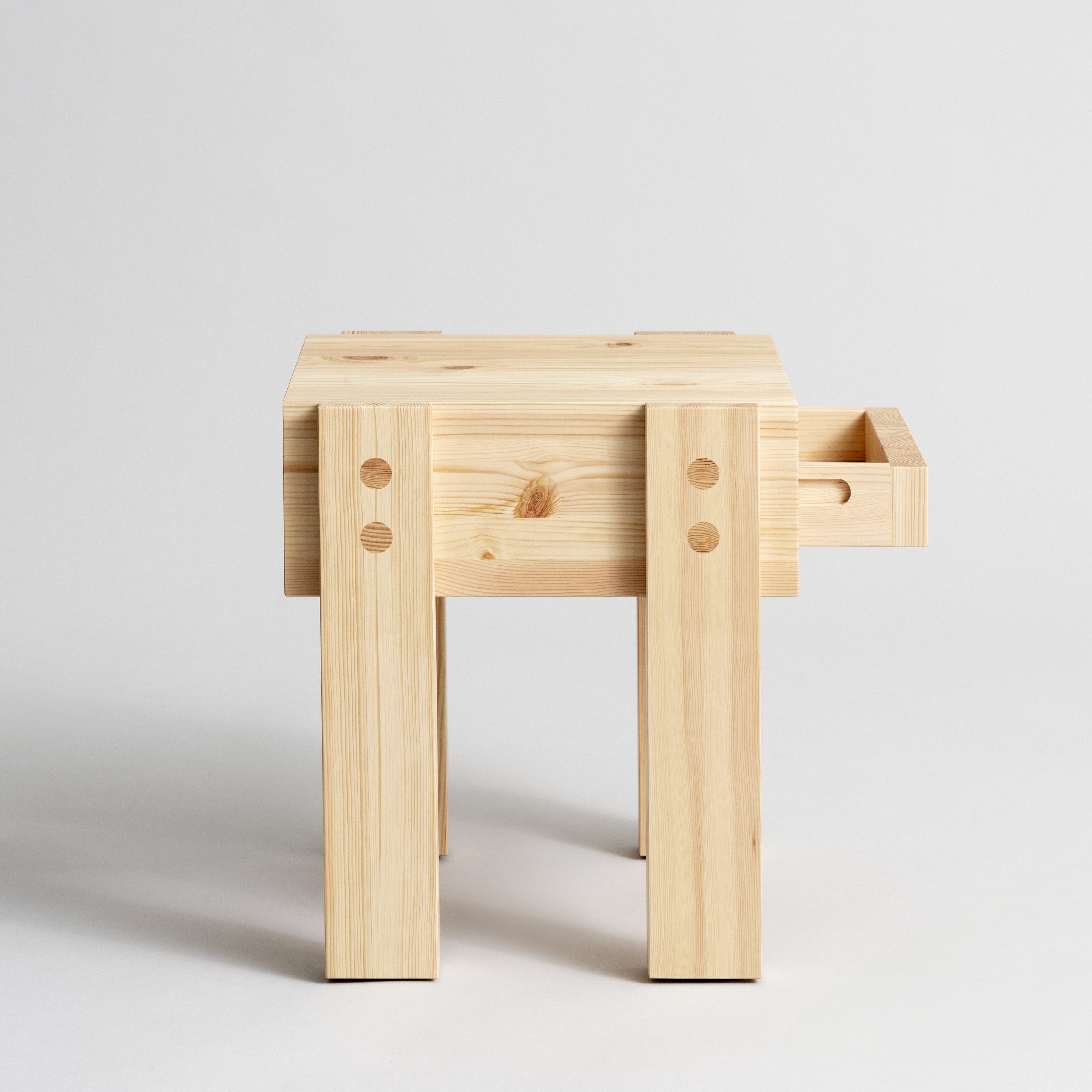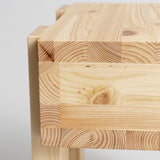The 003 Side Table draws inspiration from the architecture of lakeside cabins in Quebec and Finland. Its standout feature is the elevated design, with a sleek drawer that appears to "float" above the ground, supported by four slender, stilt-like legs. Made from Finnish pinewood, the table highlights the wood's natural grain and knots, which darken and develop a warm honey tone over time. With a rustic yet refined aesthetic, this durable piece works perfectly as a bedside or side table.