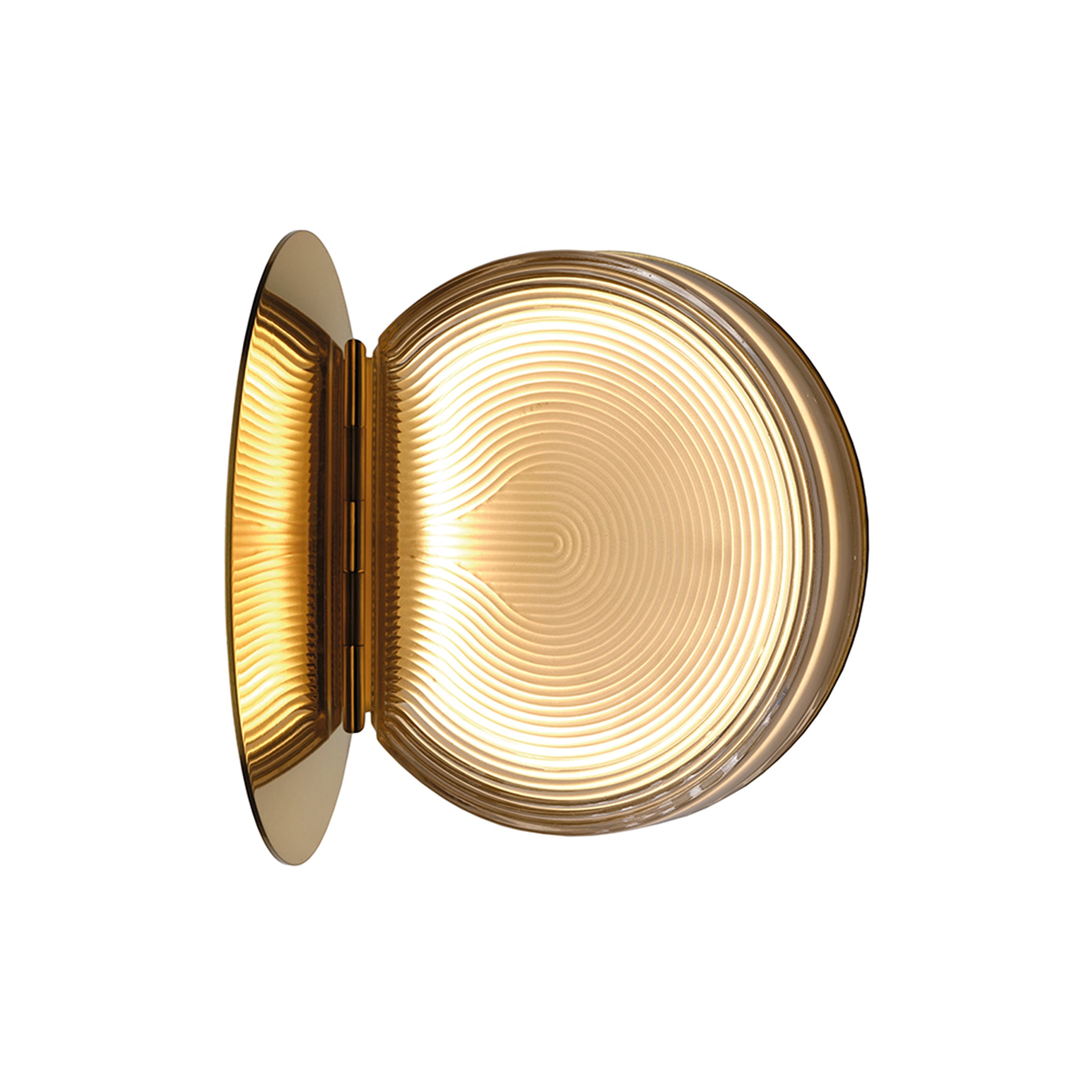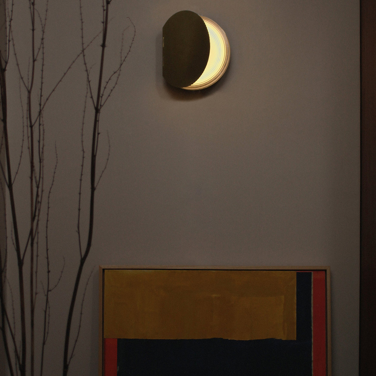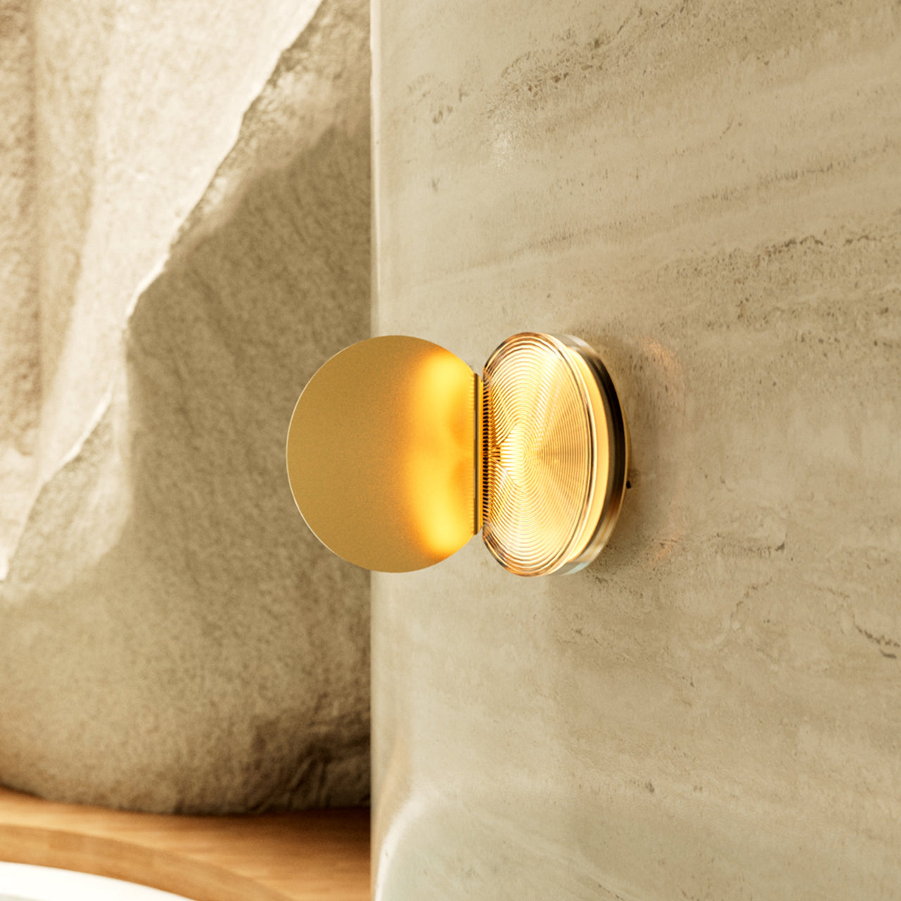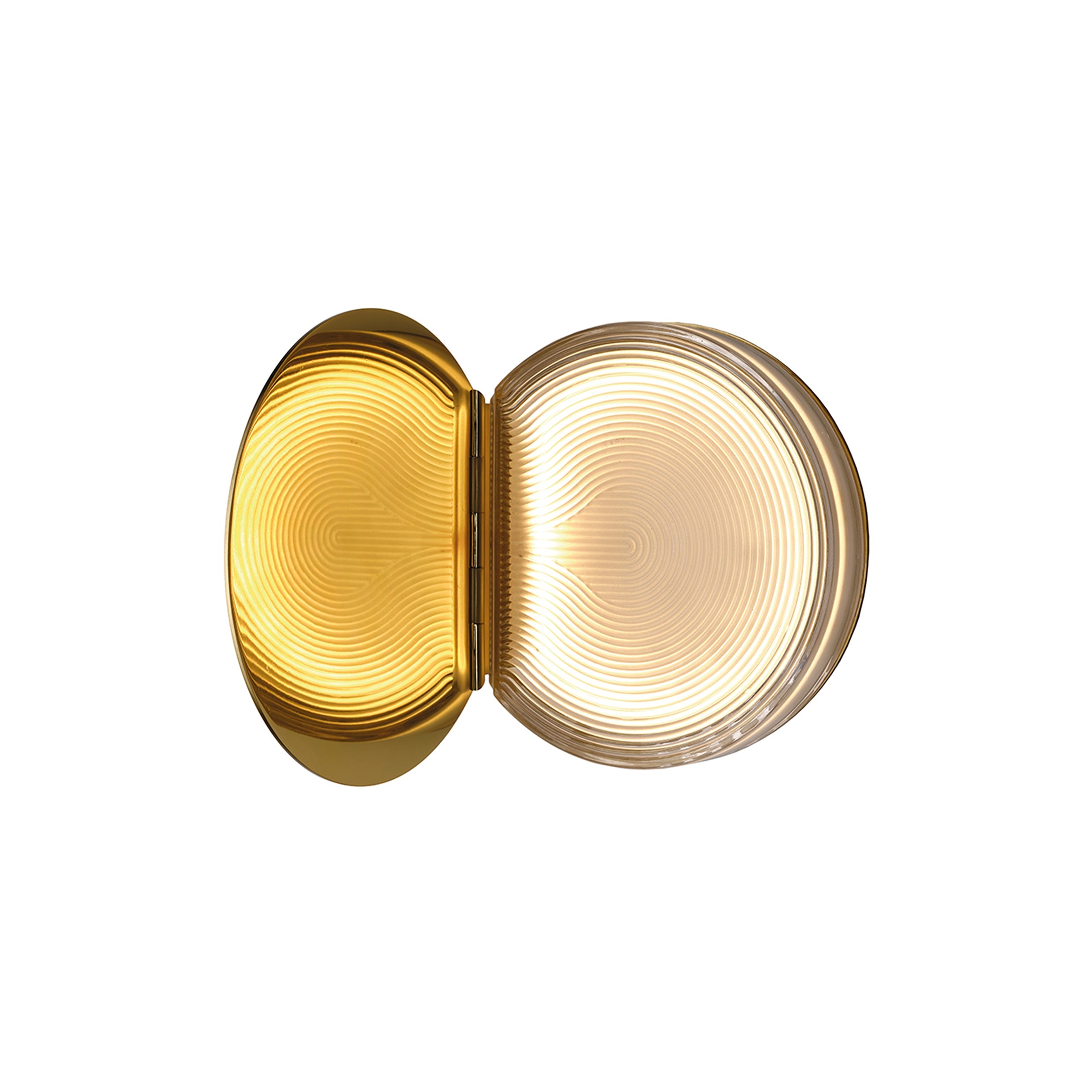 Poudrier alludes to the satisfying “click” of a makeup compact, the mechanical action making the object reassuring and immediately understandable. Similarly, the wall lamp’s illumination is diffused by a thick glass pane while the polished brass flap acts as a pivoting mirror, making the light level adjustable, not with a dimmer but like a camera shutter that opens and closes.