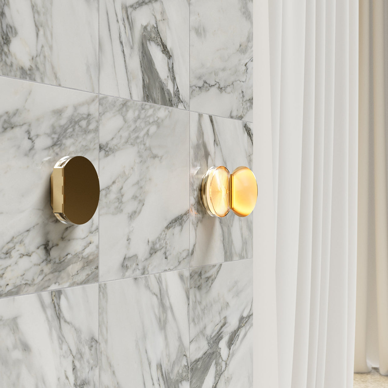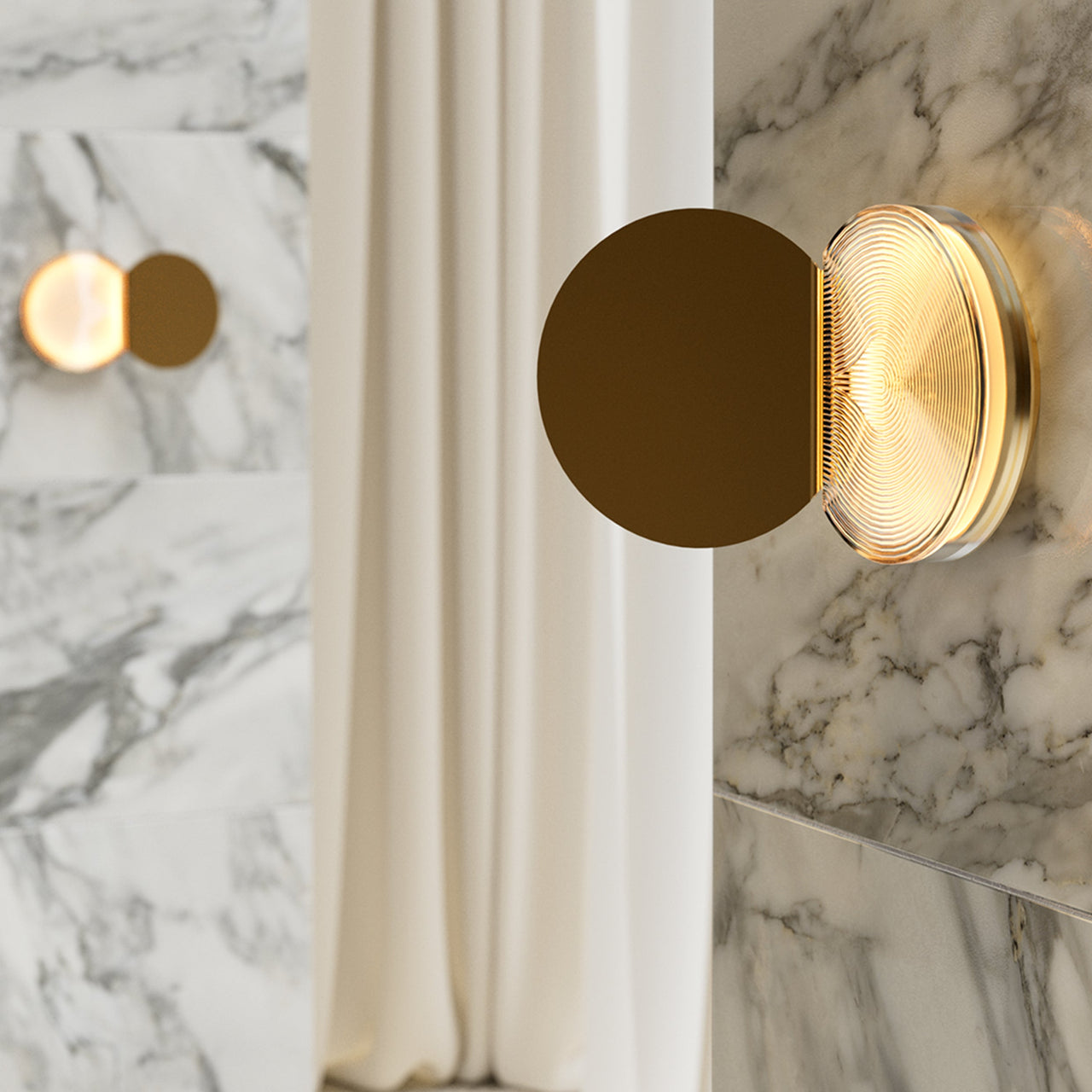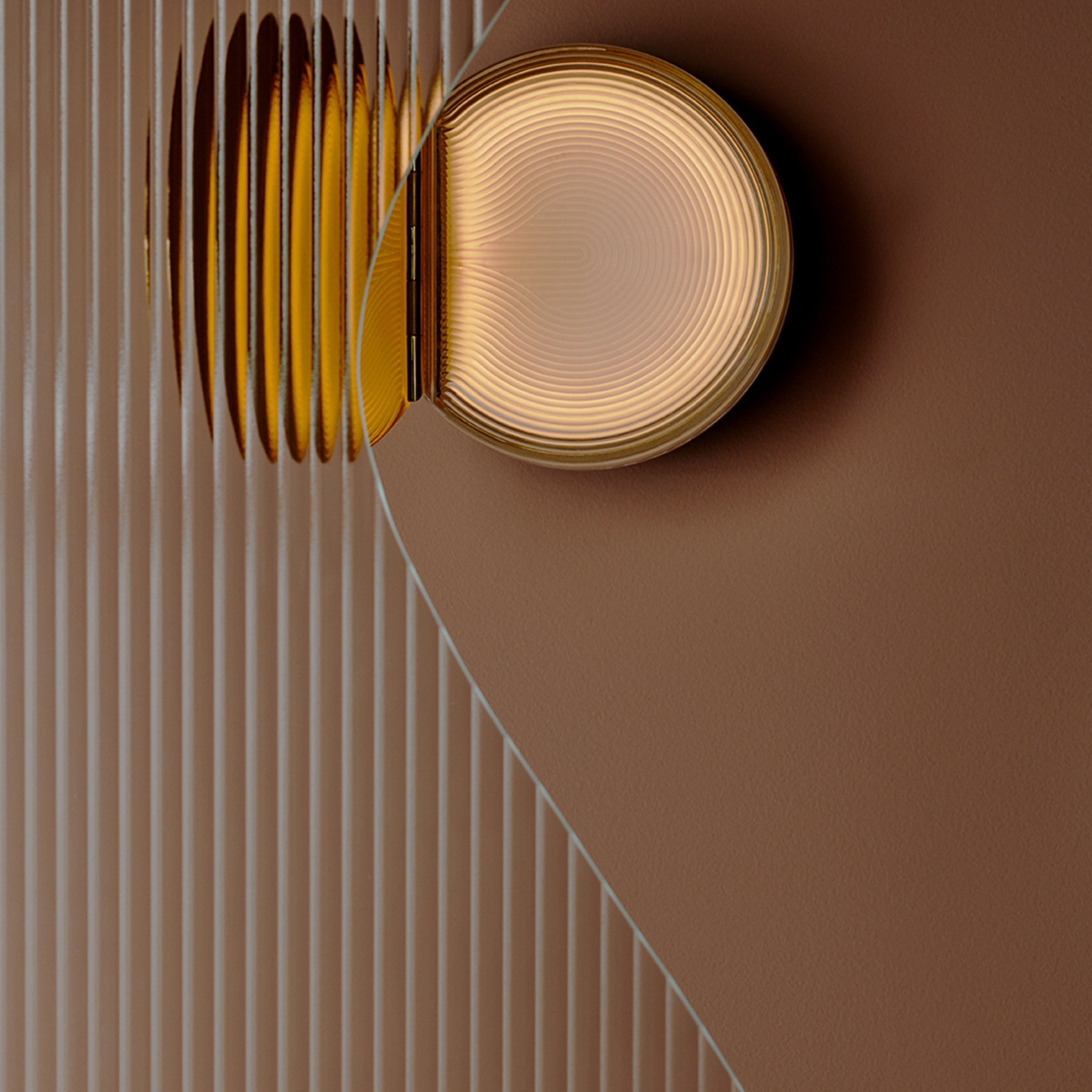 Poudrier alludes to the satisfying “click” of a makeup compact, the mechanical action making the object reassuring and immediately understandable. Similarly, the wall lamp’s illumination is diffused by a thick glass pane while the polished brass flap acts as a pivoting mirror, making the light level adjustable, not with a dimmer but like a camera shutter that opens and closes.