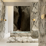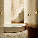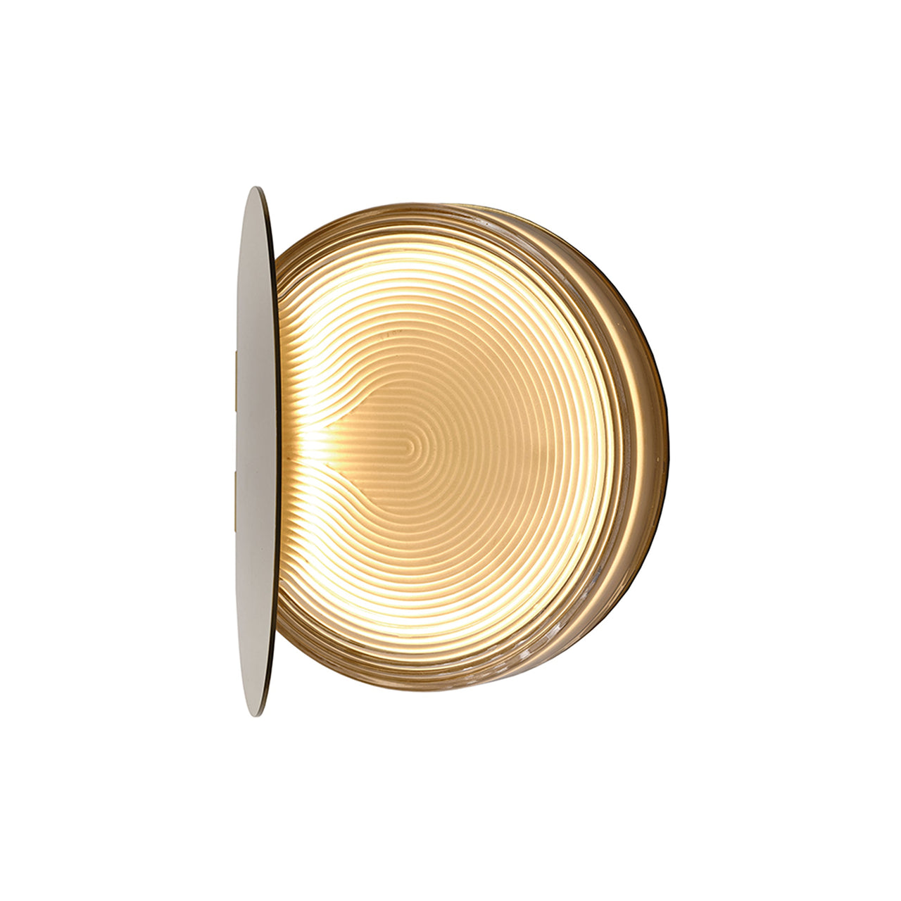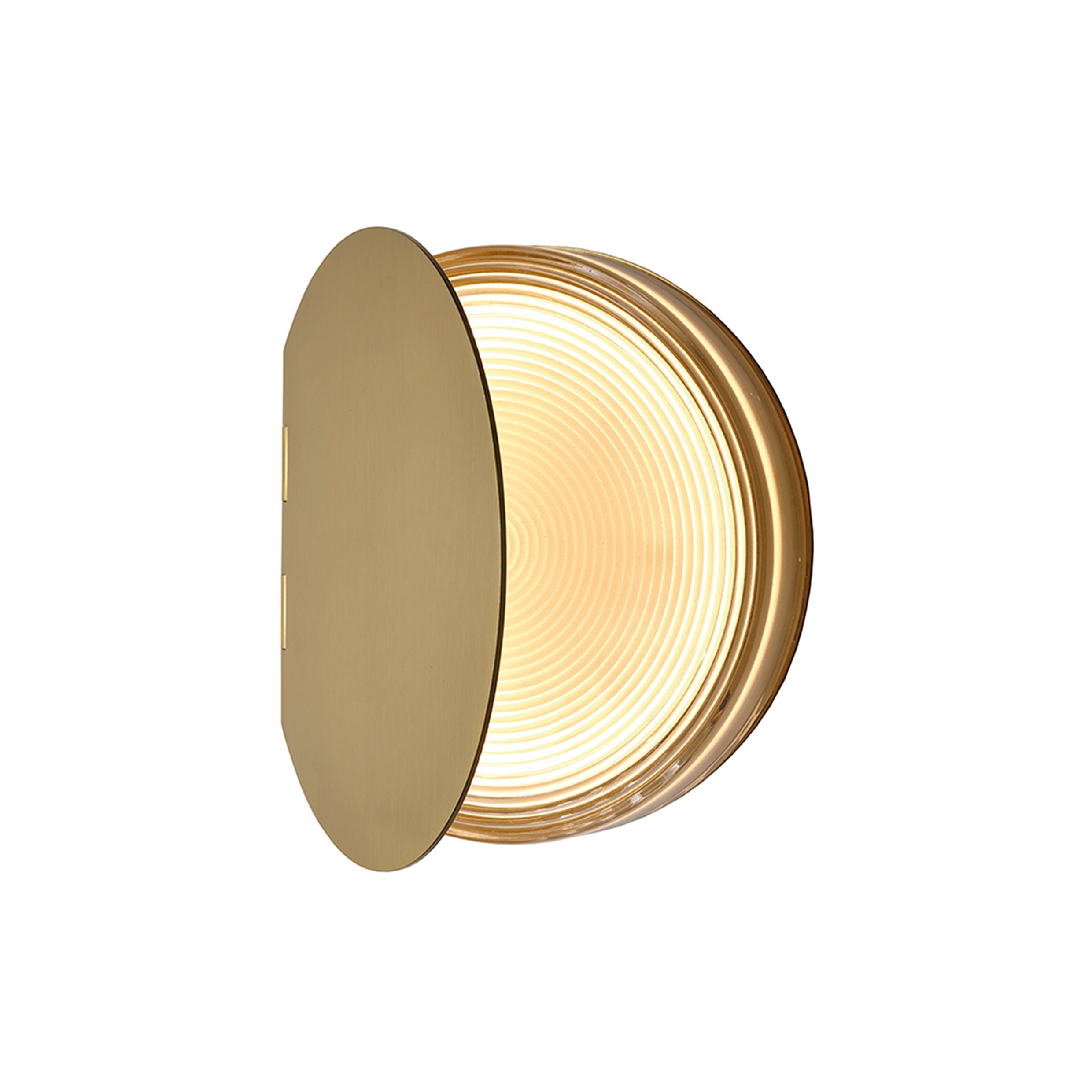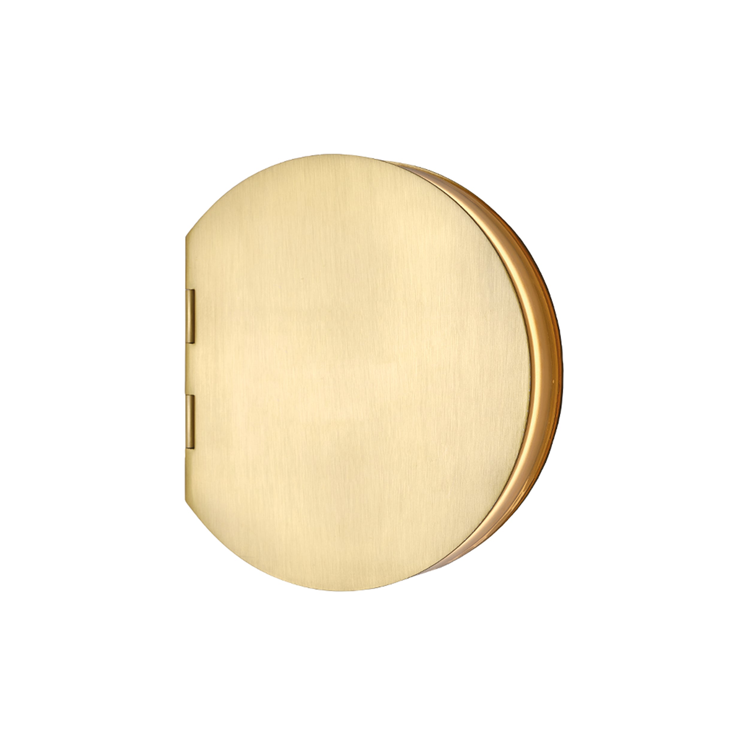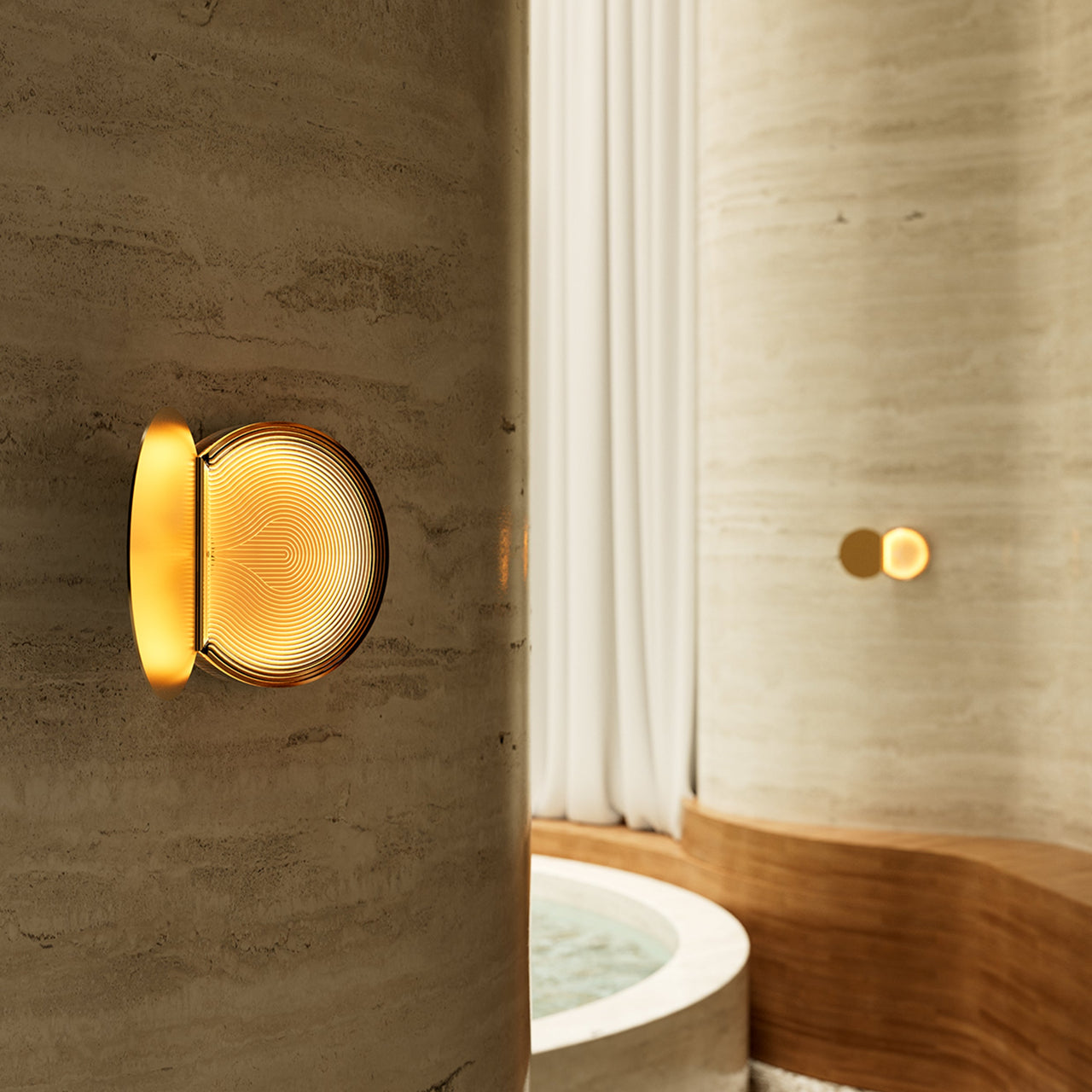 Poudrier alludes to the satisfying “click” of a makeup compact, the mechanical action making the object reassuring and immediately understandable. Similarly, the wall lamp’s illumination is diffused by a thick glass pane while the polished brass flap acts as a pivoting mirror, making the light level adjustable, not with a dimmer but like a camera shutter that opens and closes.