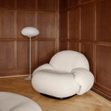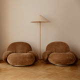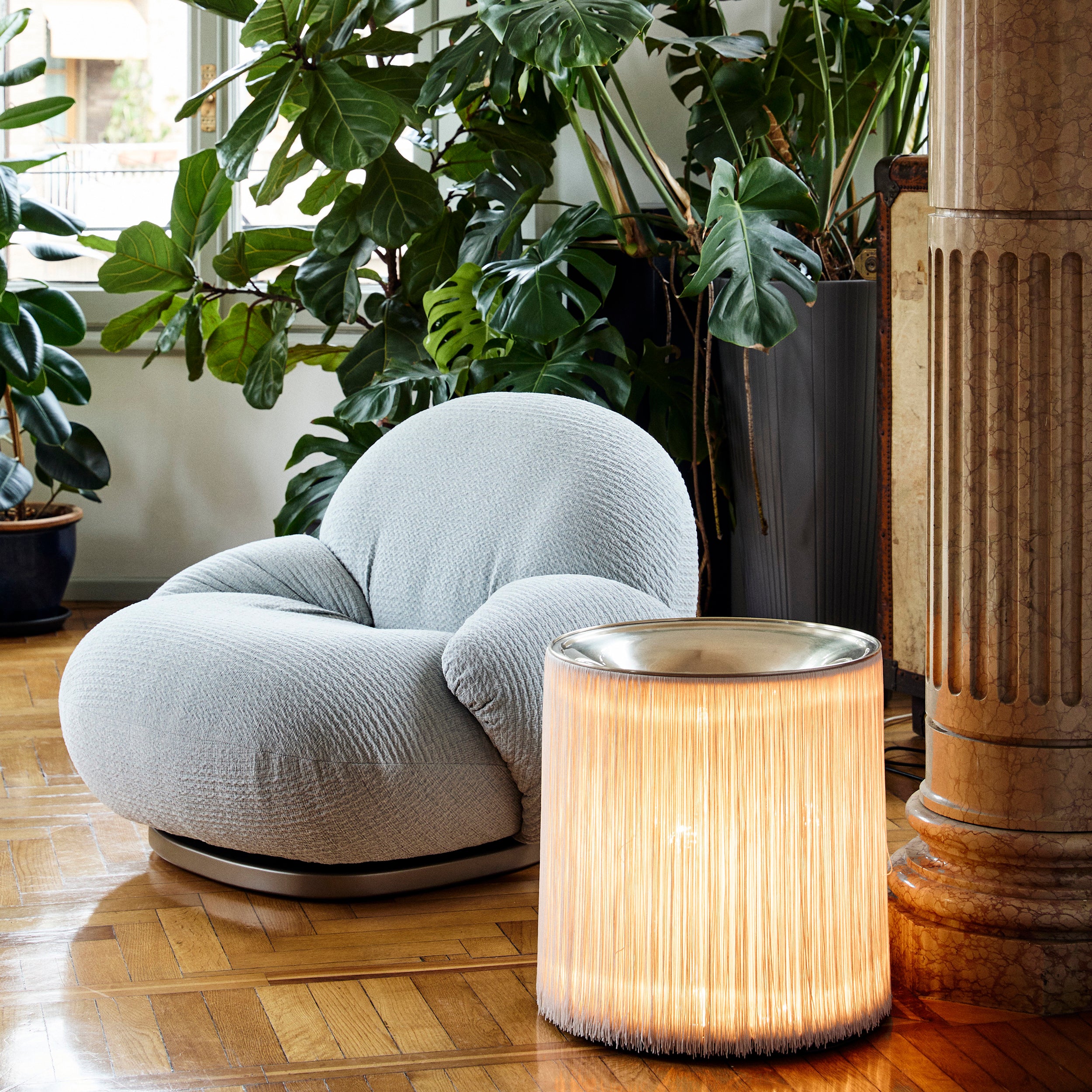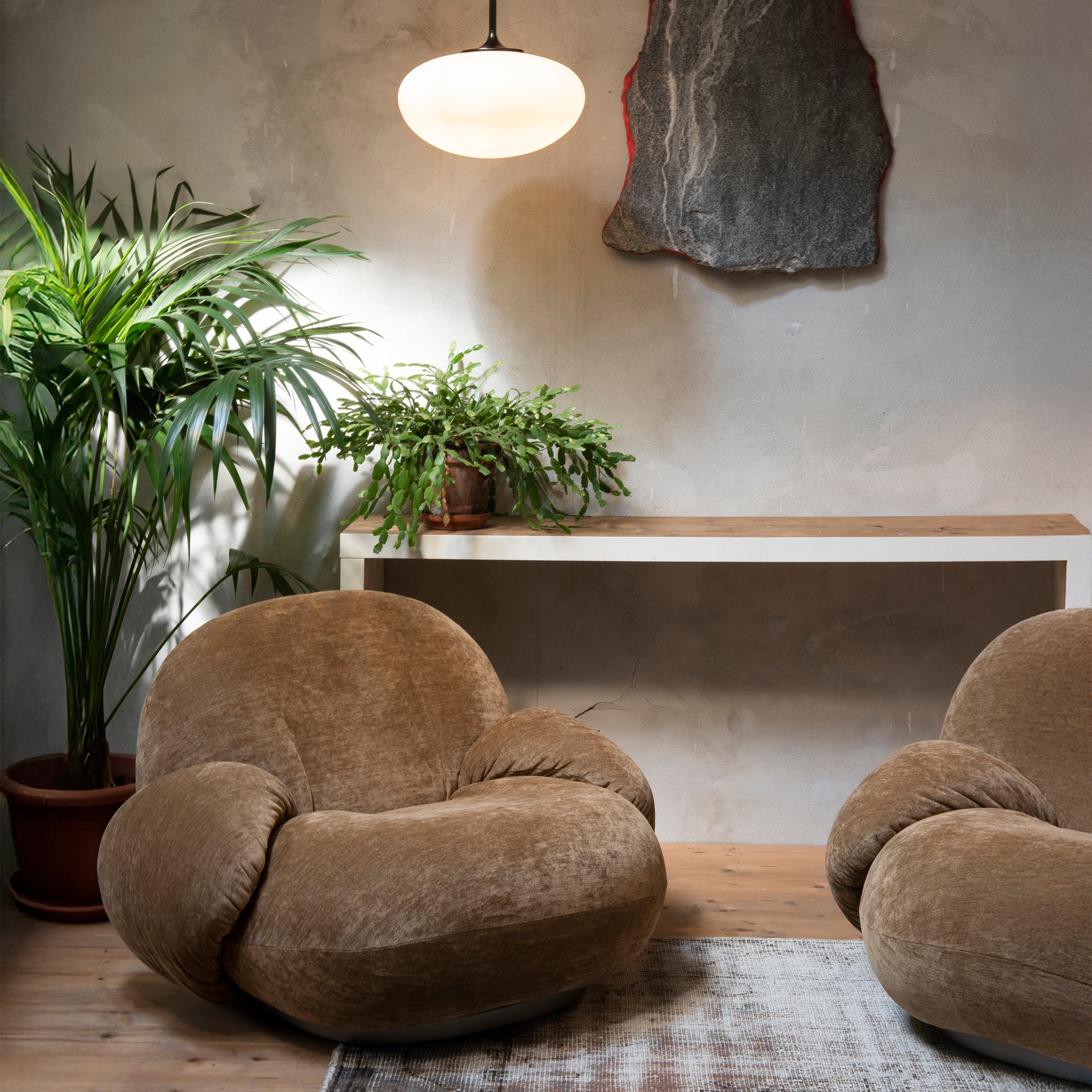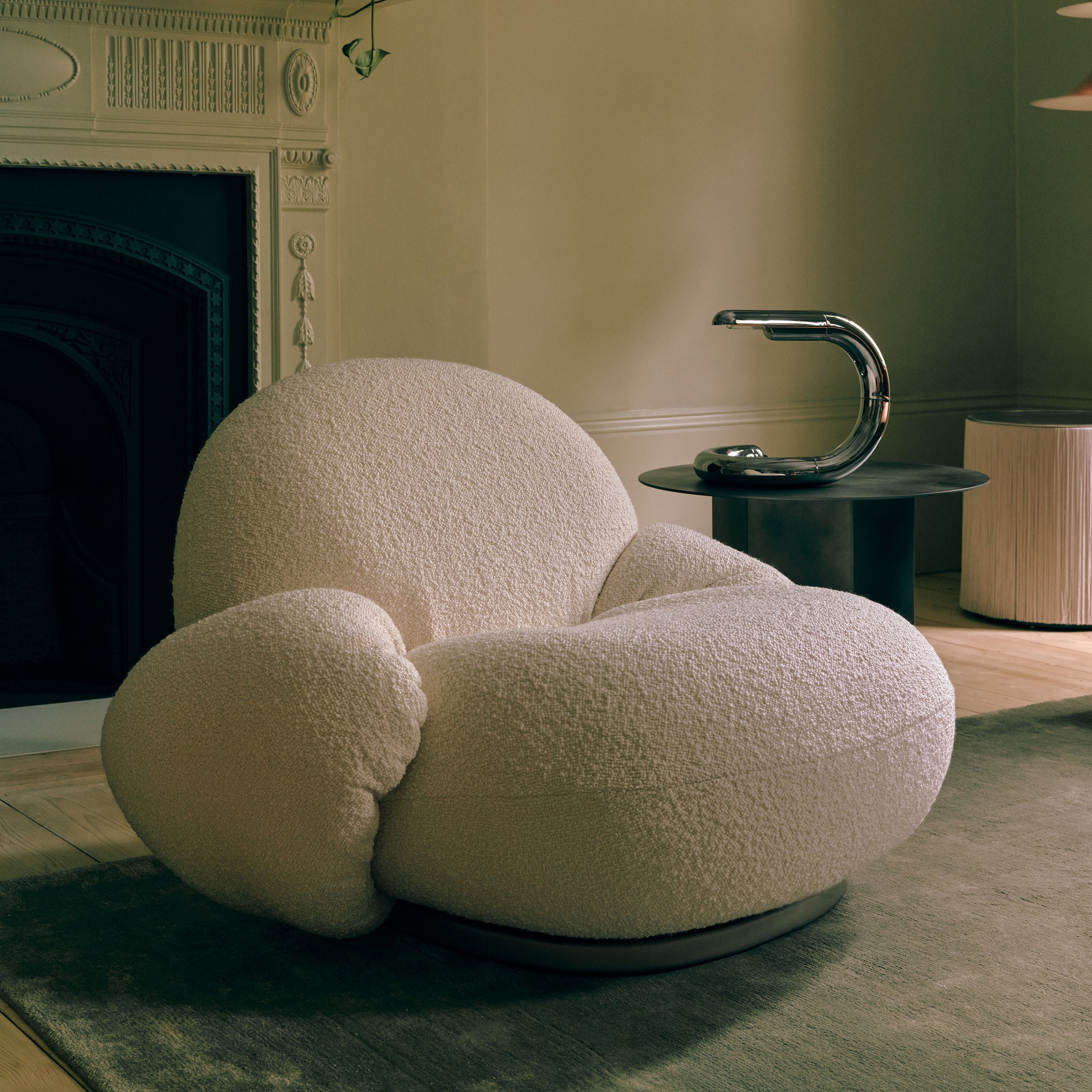 Designer Pierre Paulin’s 1975 vision of “sitting on clouds” gets an armrest to provide added support and allow one to lean with ease to either side. Curvaceous, soft and low to the floor, Pacha delivers endless comfort in a lounge chair, with the choice of a fixed base or swivel with return in black or pearl gold. Once ahead of its time, Paulin’s joyfully modernist creation comes into its own as reissued by Gubi, true to its original ergonomic precision and customizable upholstered contours traced with stitching.