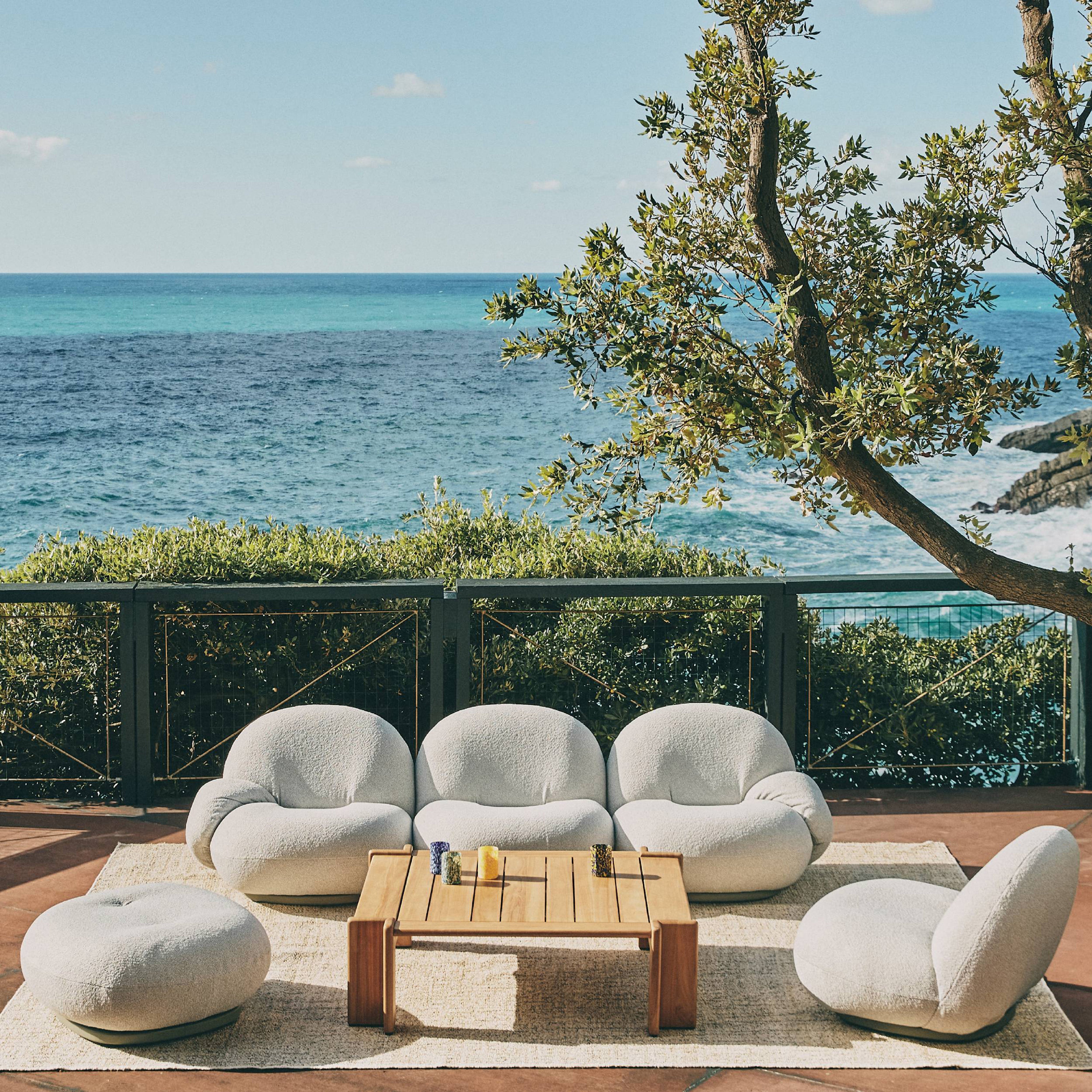 A range of sofa sizes, offered both with and without armrests, anchors the outdoor version of designer Pierre Paulin’s iconic Pacha originally launched in 1975. Gubi’s alfresco seating features a specially developed membrane interlayer that is both water-resistant and breathable for quick drying after exposure to rain and the base is made from moisture-resistant plywood. Not to mention, the relaxing comfort of the low-slung design — a rarity among outdoor furnishings.