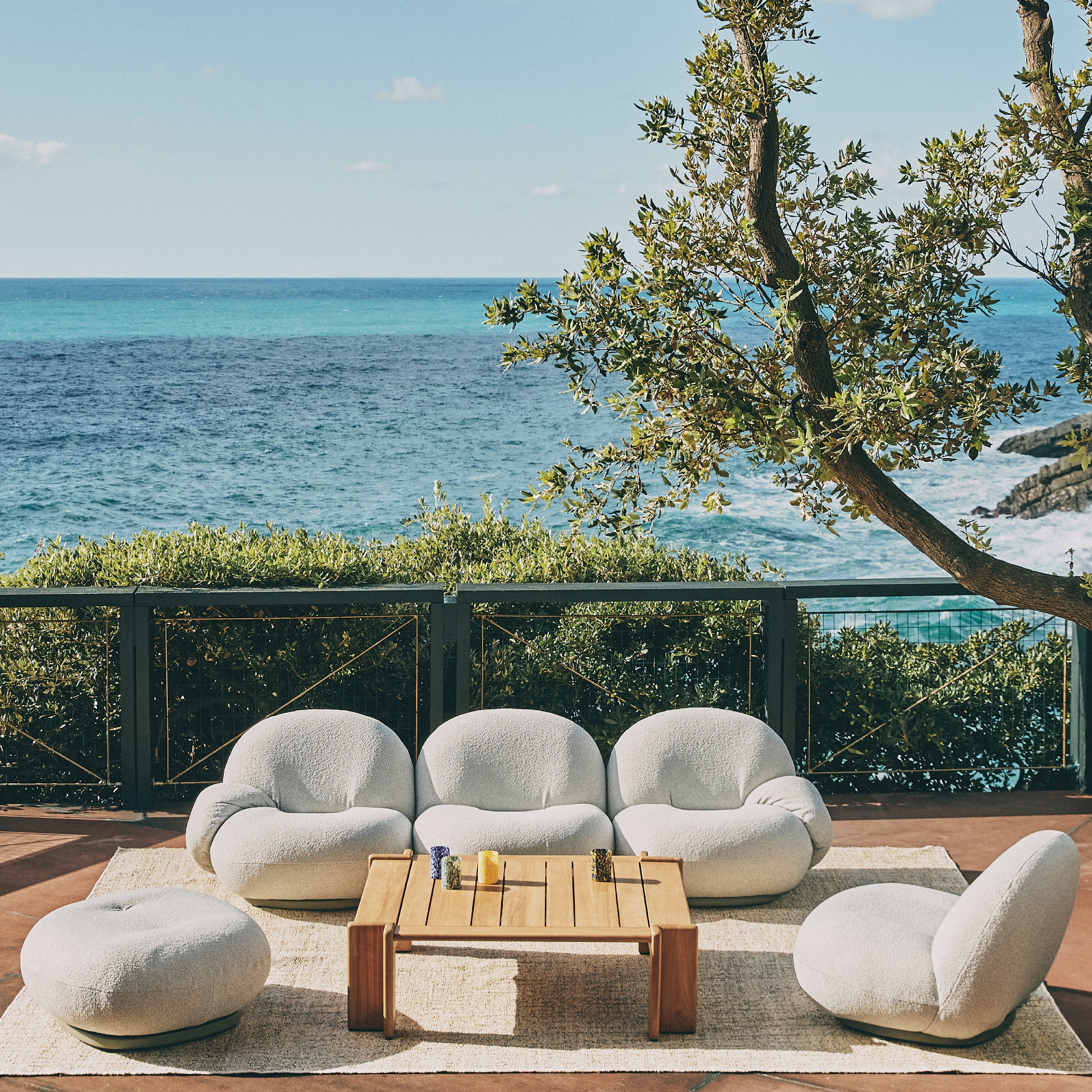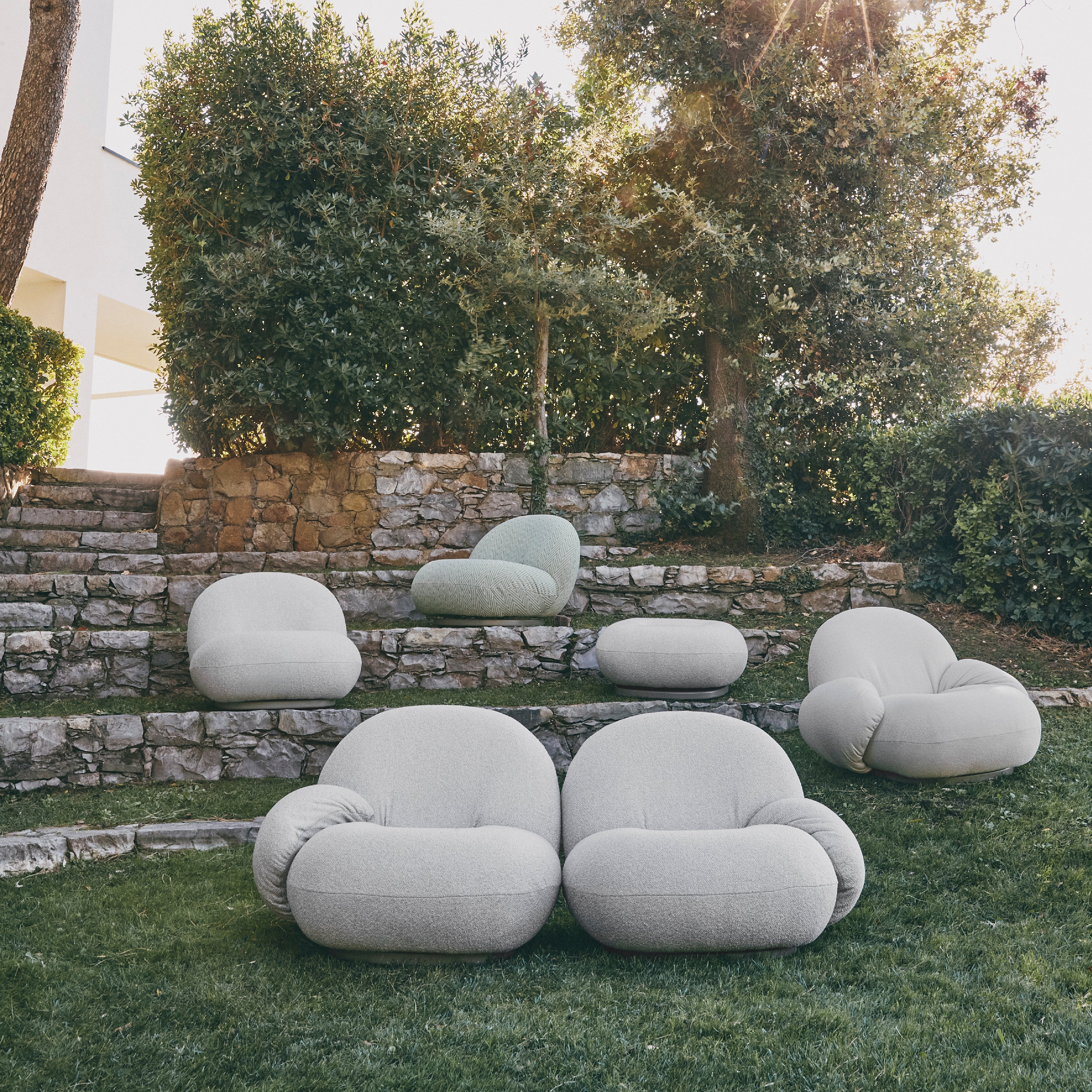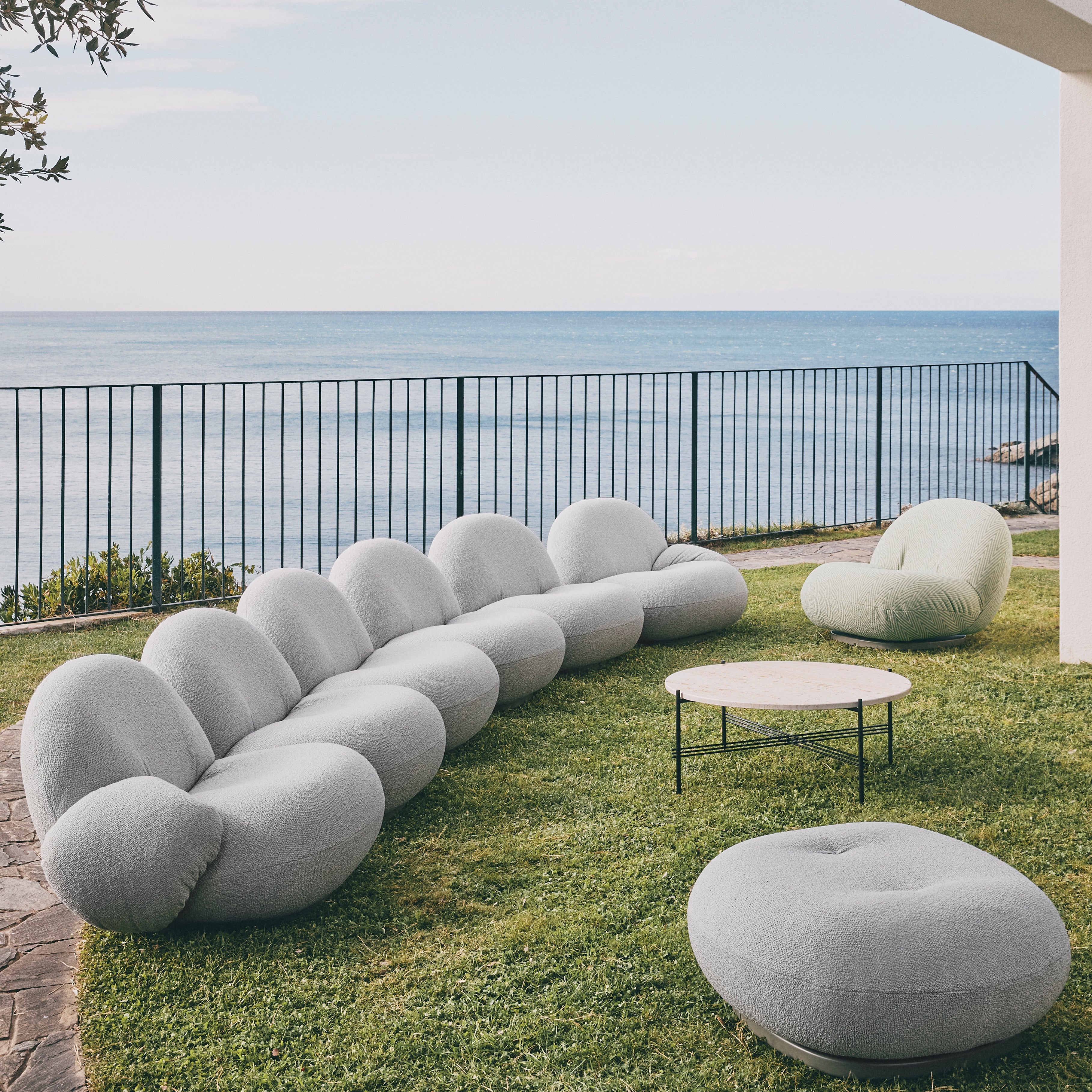 The Gubi Pacha Outdoor Sofa with Armrest and Ottoman blends sculptural elegance with modern durability. With its low-slung, cloud-like form, this outdoor version retains the original’s soft curves while incorporating weather-resistant materials. The sofa’s organic shape offers a relaxed seating experience, enhanced by integrated armrests for added support. The ottoman mirrors the contours of the sofa, functioning as a footrest or additional seat. Designed for the outdoors, it features a breathable, water-resistant membrane for quick drying, a moisture-resistant plywood base, and a removable rain cover for extra protection.