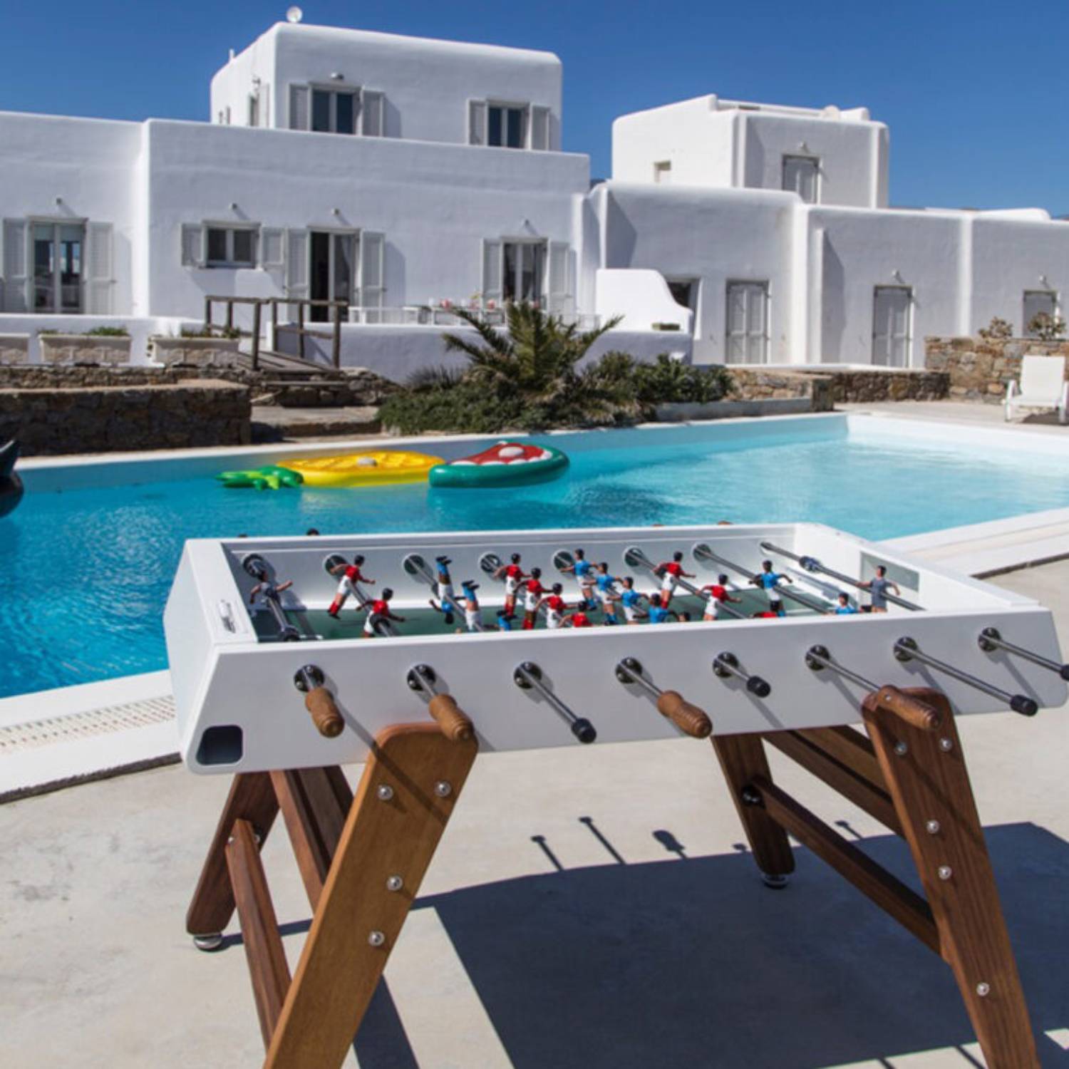 With the RS#3 Wood Foosball Table, soccer-heads can get their kicks between matches in unrivaled high style. Made in Spain, this version of RS Barcelona's lauded RS#3 adds richly grained iroko wood legs, for a luxury upgrade. Yet the wood is weather resistant, just like the steel tabletop (with no plastic parts to wear out) that's treated with a cataphoresis coating for greater durability. Everything stays shiny and new, indoors or out. So whether pride of place is an outdoor patio or an indoor game room, the RS#3 Wood is more than equal to its surroundings. And the tabletop includes 22 players—11 per team—and a precisely lined playing surface. Score!
