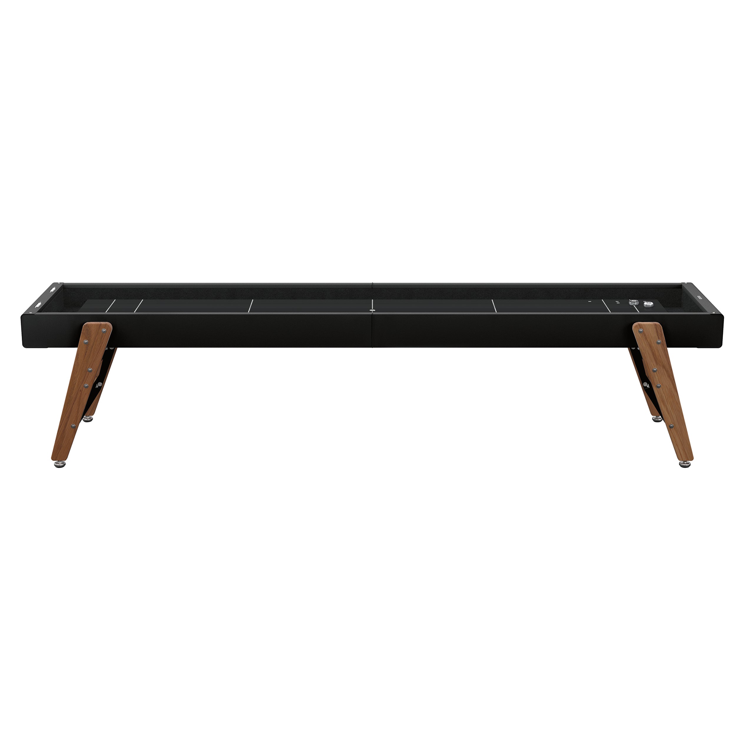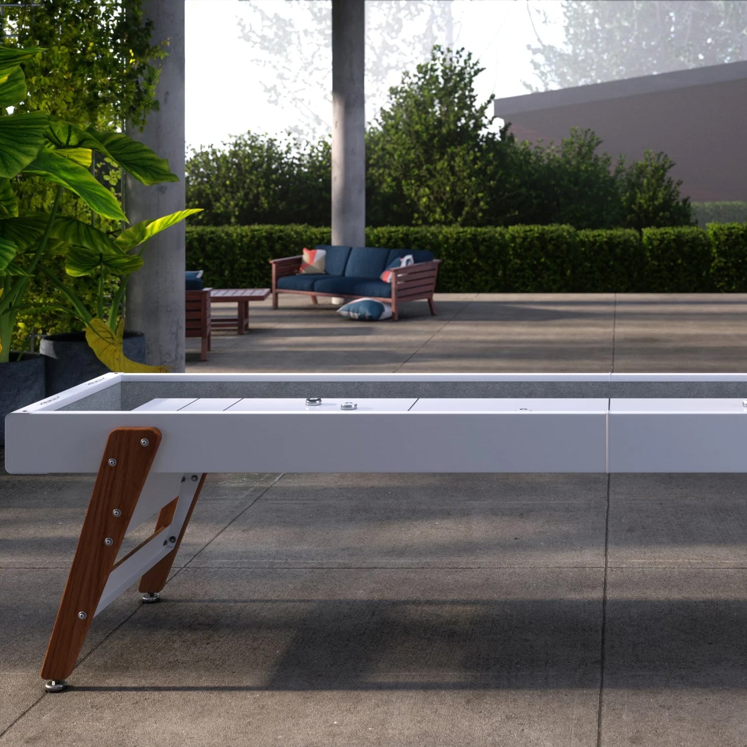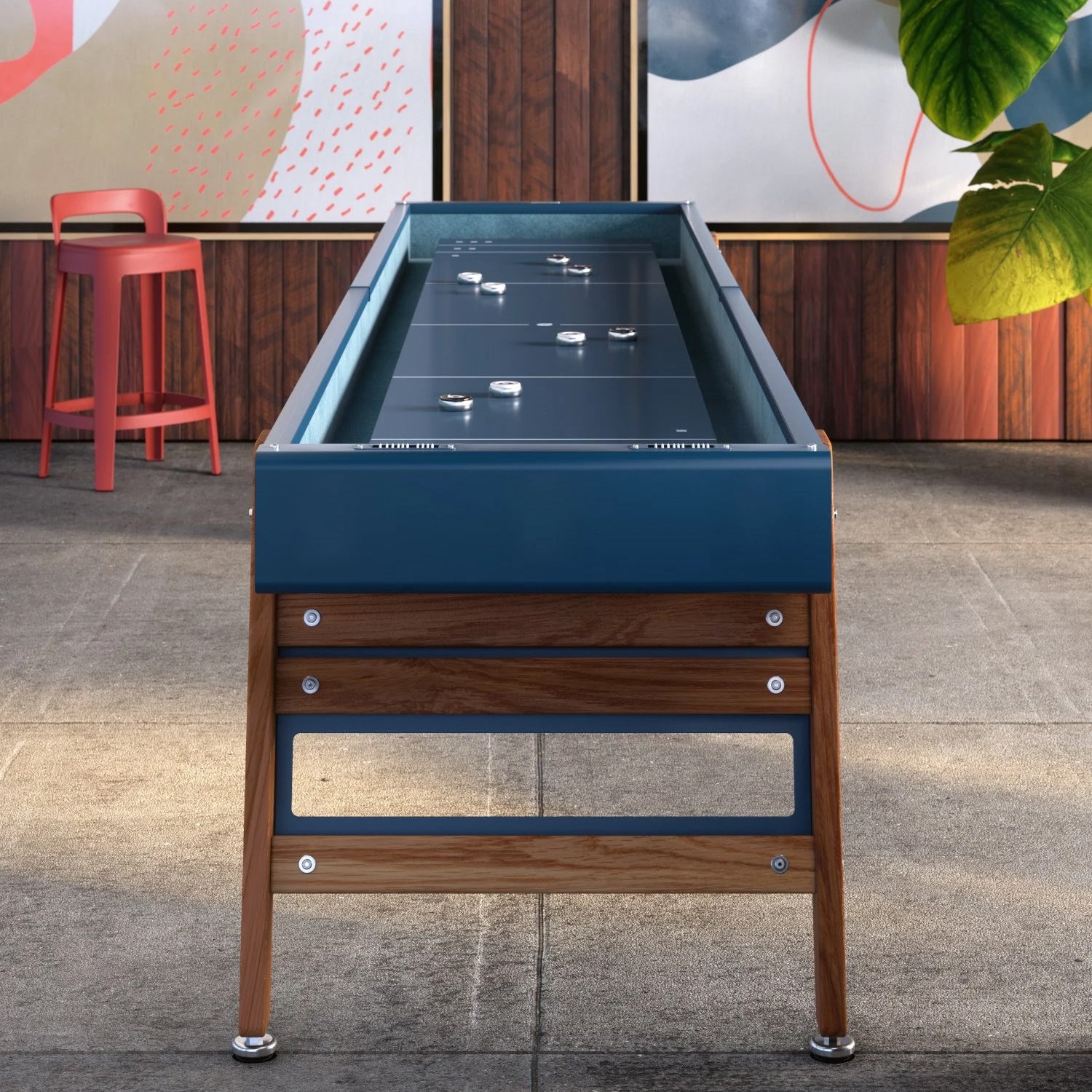 Track brings designer Rafael Rodríguez' sleek sensibility to the classic shuffleboard game, in a steel table with sustainably sourced iroko wood legs. In 2 sizes to match the dimensions of an indoor or covered outdoor space, it’s finished with a cataphoretic process and durable final powder coat in a choice of hues with an epoxy-resin playing field.