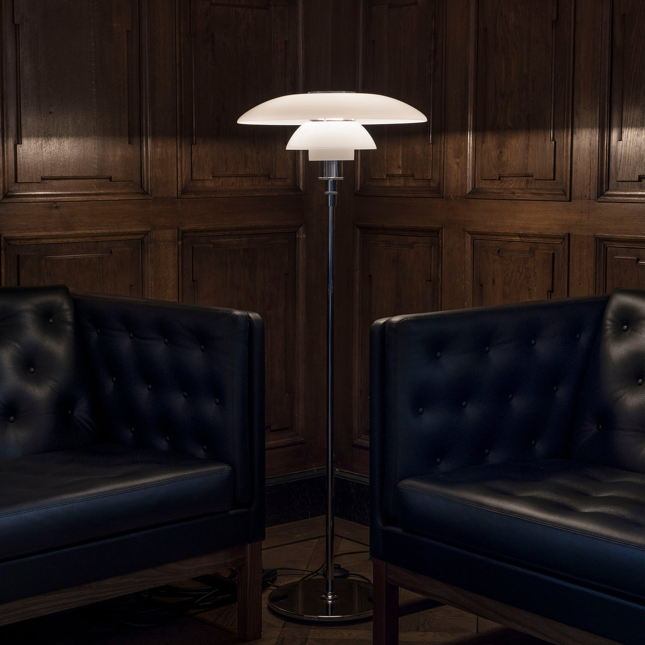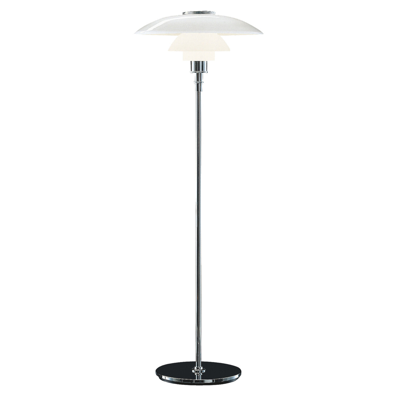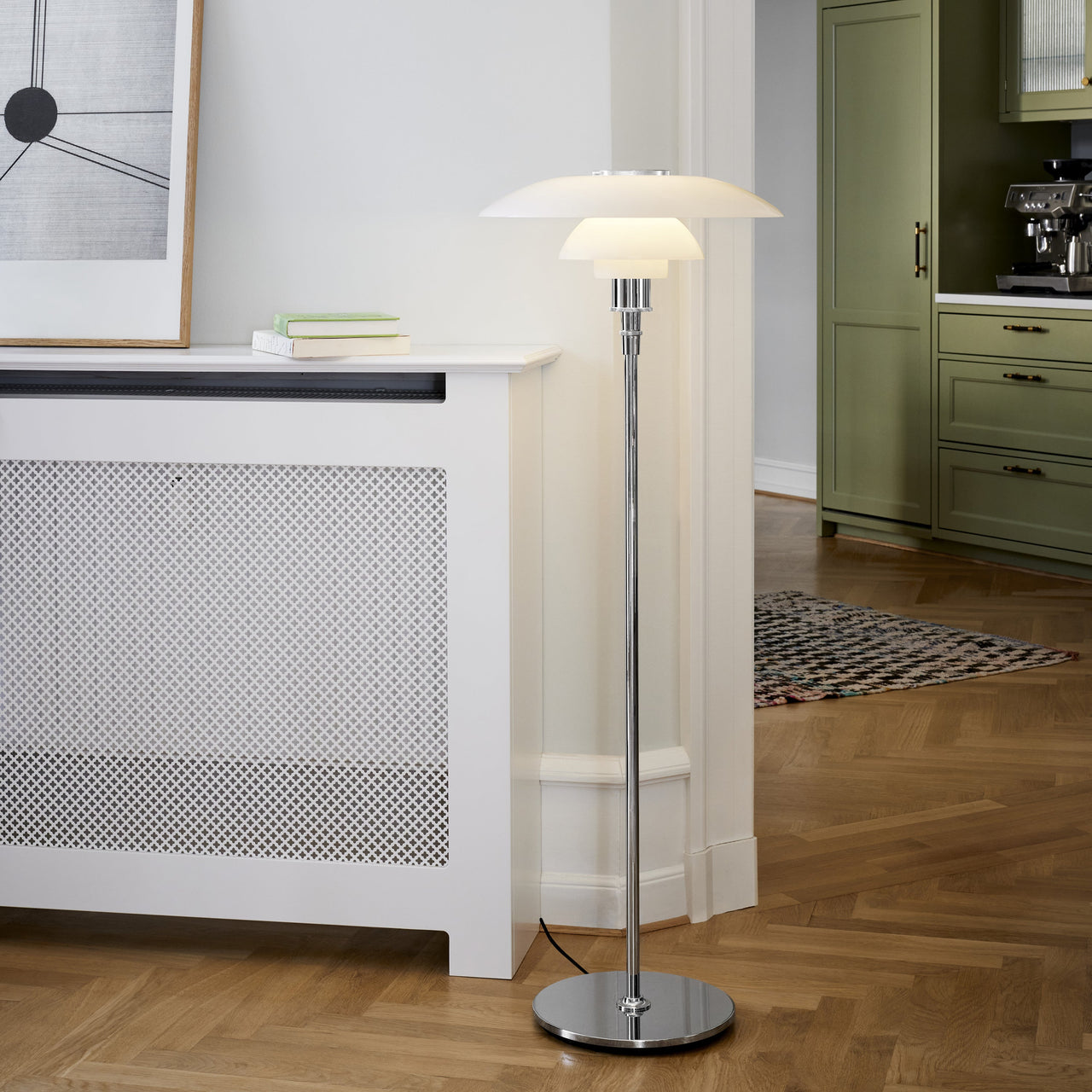 Employing a design based on the logarithmic spiral, the 4½-3½ Glass Floor Lamp by designer Poul Henningsen assures an even distribution of light over the entire curve of the multiple translucent shades, eliminating glare and shadow. Each hand-blown opal shade—glossy on top and sandblasted matte on the underside—reduces the amount of light equally due to its distance from the light source, in this strikingly sleek construction with a high-lustre chrome base.