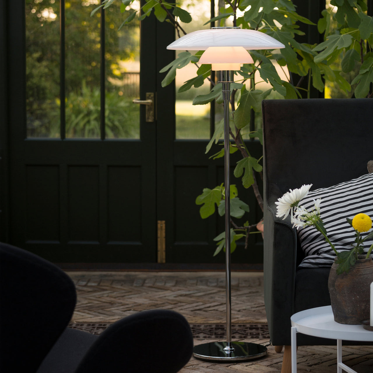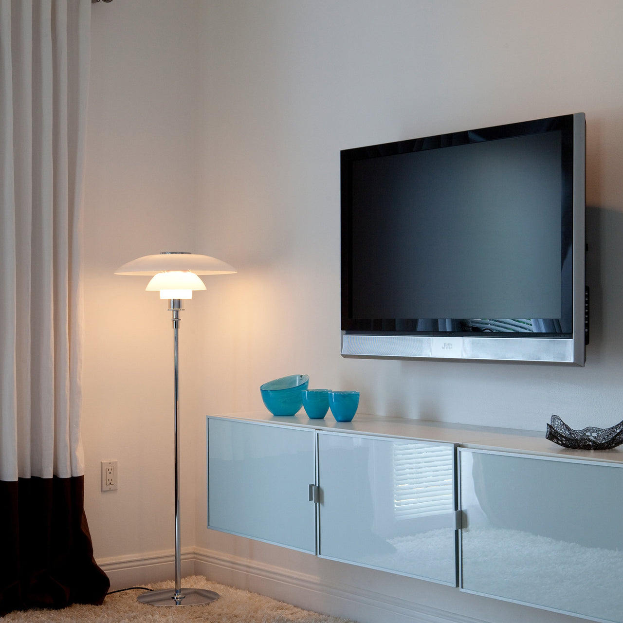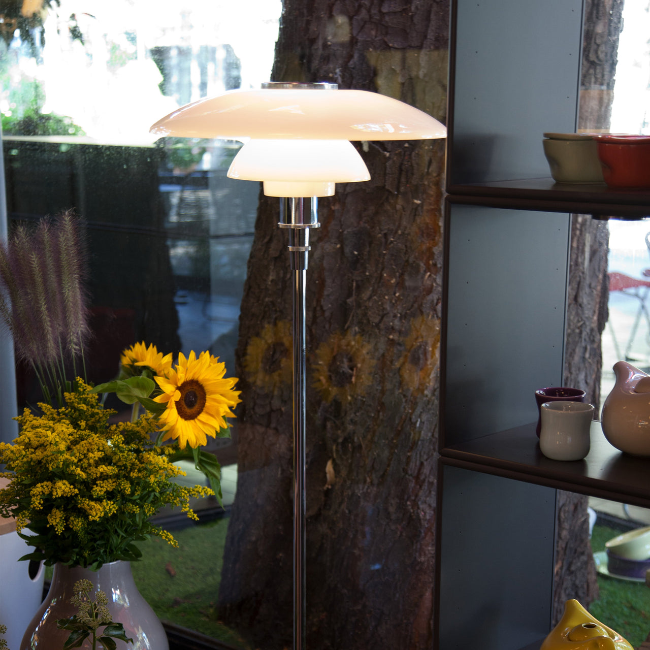 Employing a design based on the logarithmic spiral, the 4½-3½ Glass Floor Lamp by designer Poul Henningsen assures an even distribution of light over the entire curve of the multiple translucent shades, eliminating glare and shadow. Each hand-blown opal shade—glossy on top and sandblasted matte on the underside—reduces the amount of light equally due to its distance from the light source, in this strikingly sleek construction with a high-lustre chrome base.