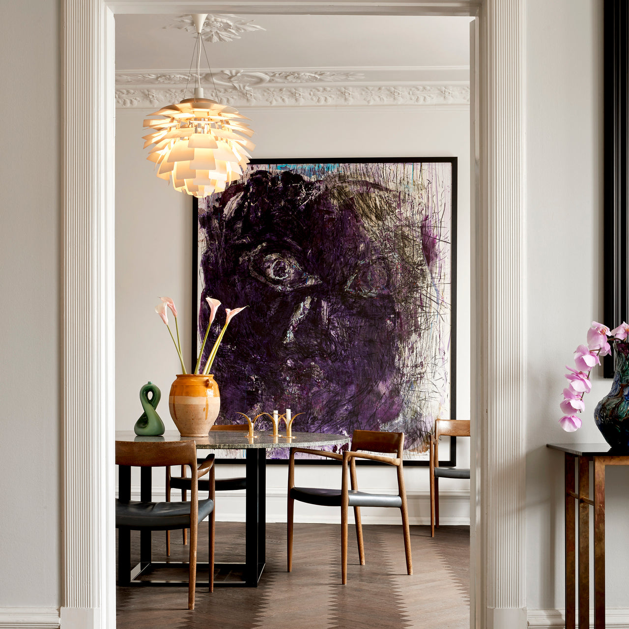 The PH Artichoke Glass Pendant was re-introduced in 2008, but its design roots date back to the 1927-31 PH Septima light. Known for its unique sculptural aesthetic, the PH Artichoke consists of 72 sandblasted glass leaves arranged to diffuse light softly and evenly without glare. This iconic design was originally created for the Langelinie Pavilion restaurant in Copenhagen in 1958, where it still hangs today. The pendant adds an elegant, ice-like transparency to any space, whether illuminated or not.