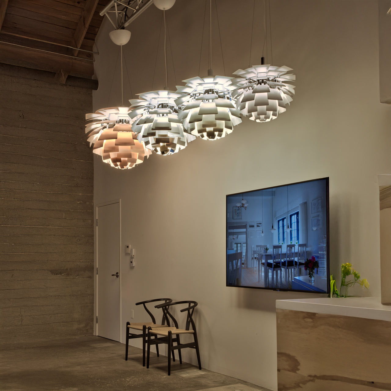 With the arrival 2 decades later of designer Poul Henningsen came 2 of the most collectible and coveted Midcentury modern fixtures, the PH-5 and the “Artichoke.” The stable of now-legendary designers widened with the likes of Vilhelm Lauritzen, Arne Jacobson and Verner Panton. The output wasn’t all stunning form either. During WWII, the firm contrived a blackout lamp that allowed famed Tivoli Gardens in Copenhagen to remain open in the evenings, without interfering with the fighter jets in the skies above.