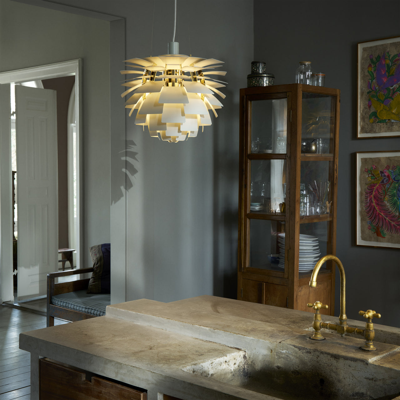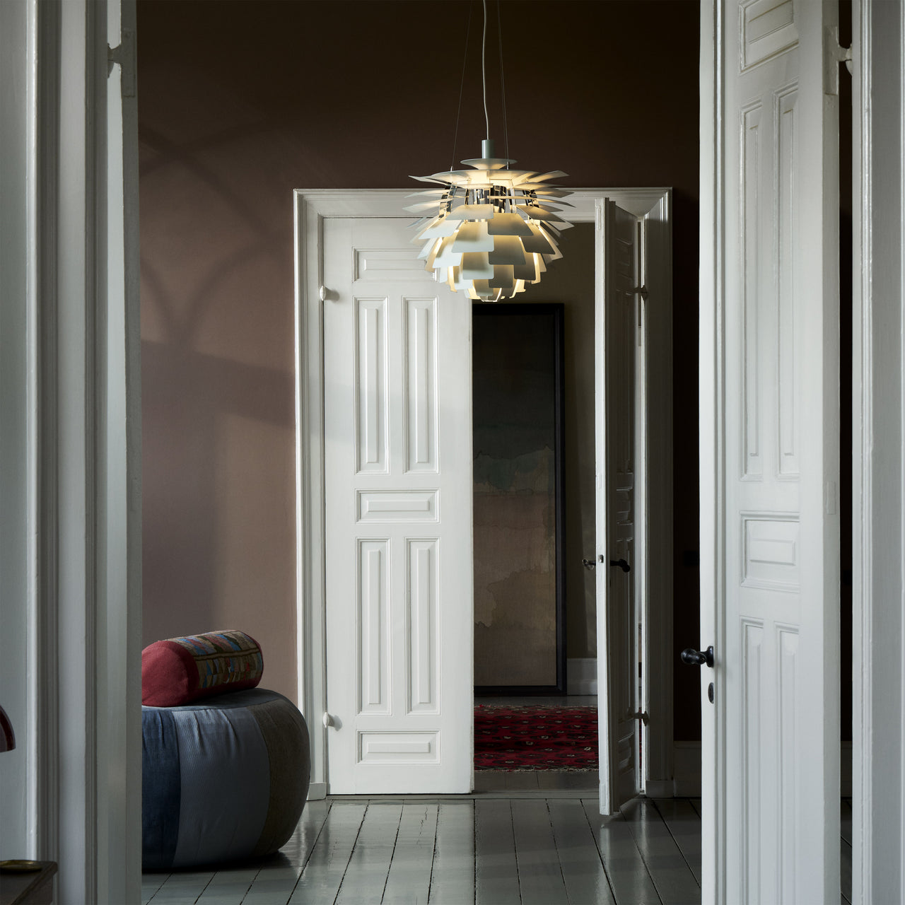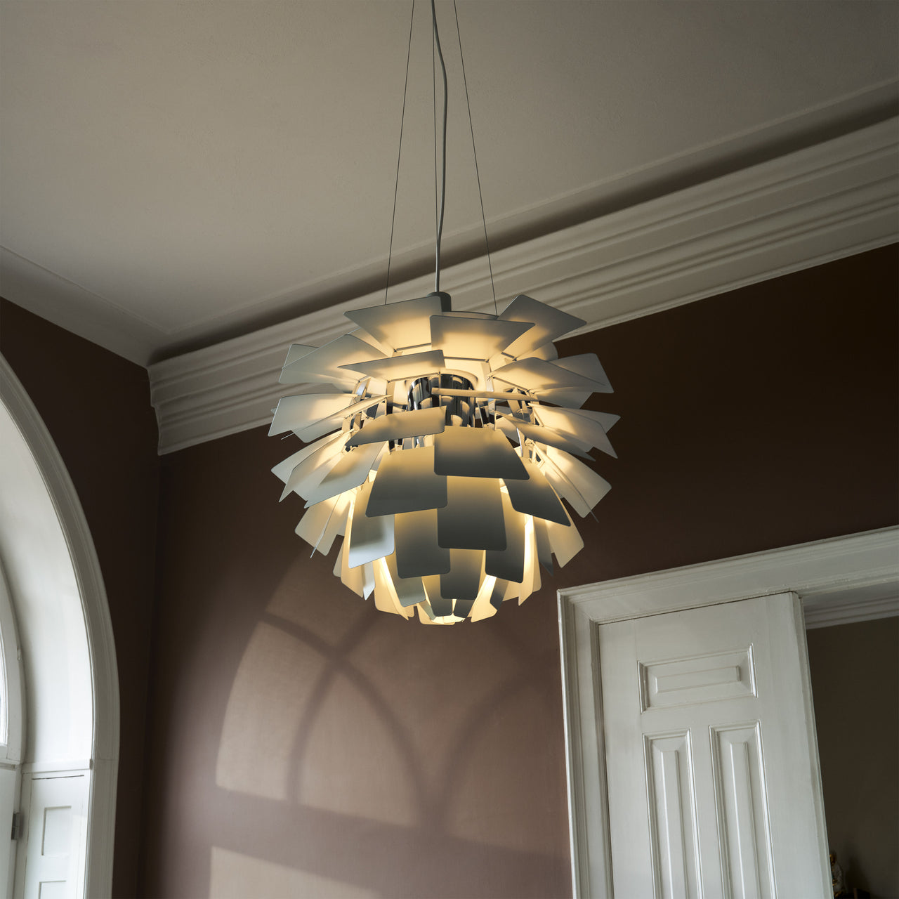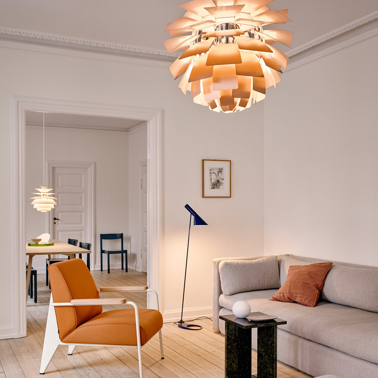 Breathtaking in form, the small version of PH Artichoke, like its sister pendants, features 72 precisely positioned leaves in concentric rows to provide glare-free light from any angle. Still largely made by hand, Poul Henningsen’s sculptural circa-1958 design, now powered by an LED, is offered in a range of metallics or a powder-coated finish.