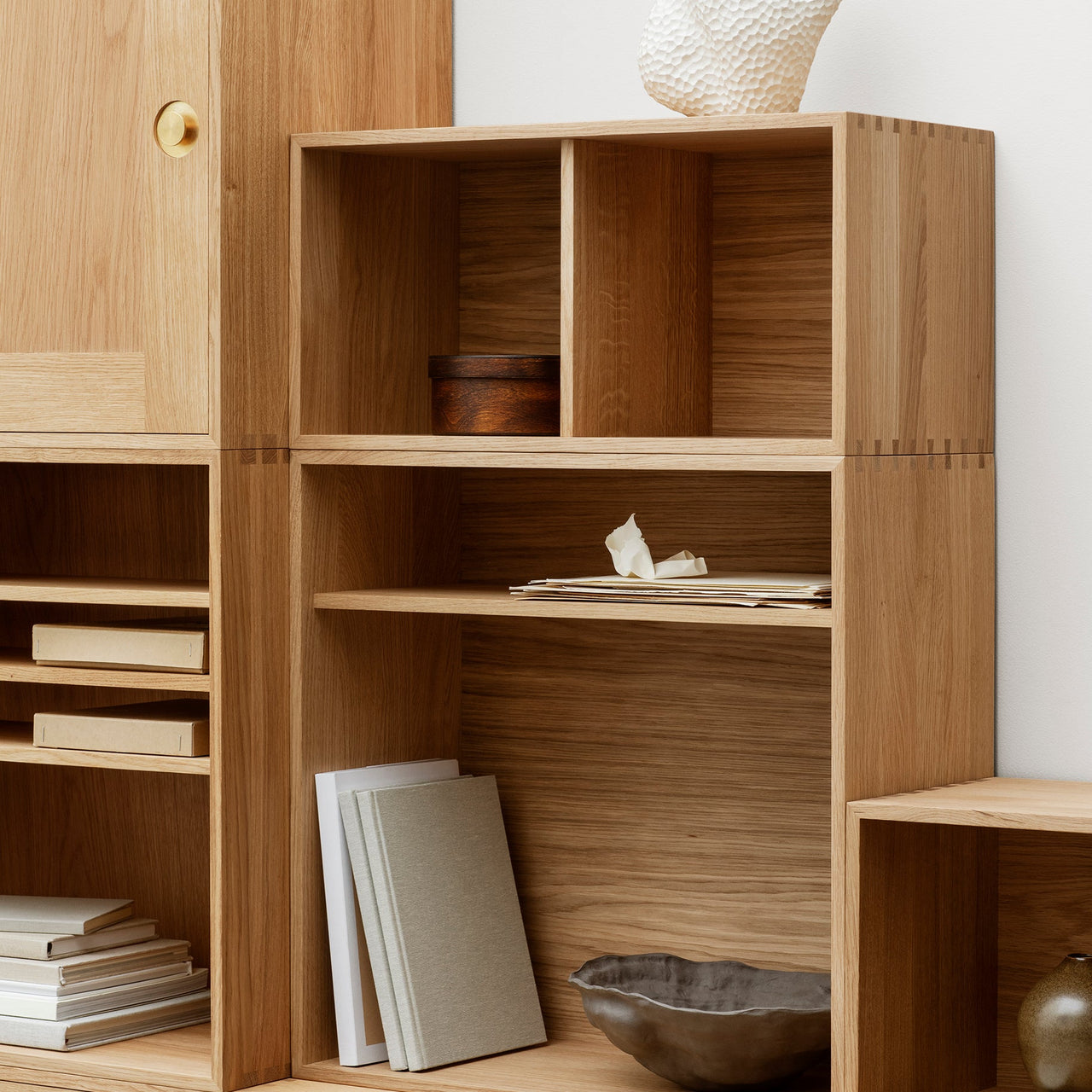 Designed in 1963 by Preben Fabricius and Jørgen Kastholm, FK63 embodies the designers’ uncompromising interest in functional proportions, handcrafted detailing and natural materials. Realized in FSC-certified solid oak, oiled to accentuate the texture and grain of the wood, the wall-hung units feature painstaking tongue and groove construction and flawless finishing. Devised for maximum flexibility, the different modules can be combined in a multitude of ways to suit every space and need.