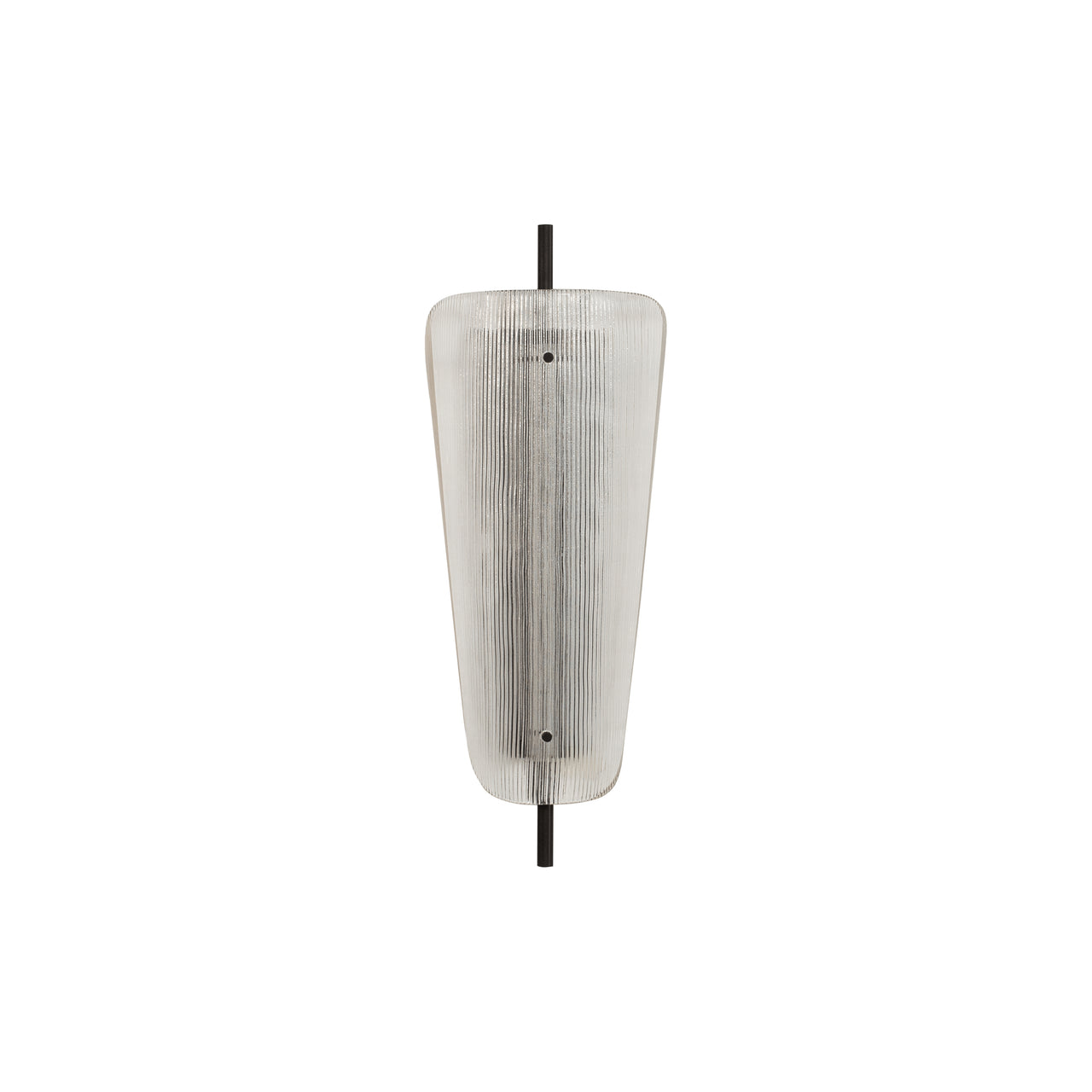 The Bent Wall Lamp features a curved glass shade that seamlessly integrates into the wall, casting a dynamic interplay of light and shadow. Each glass piece is handcrafted using traditional techniques, resulting in unique grooves and patterns that give it distinct character. The lamp is paired with a sturdy steel base and the shade is available in 2 different glass finishes, adding depth and texture to any space.